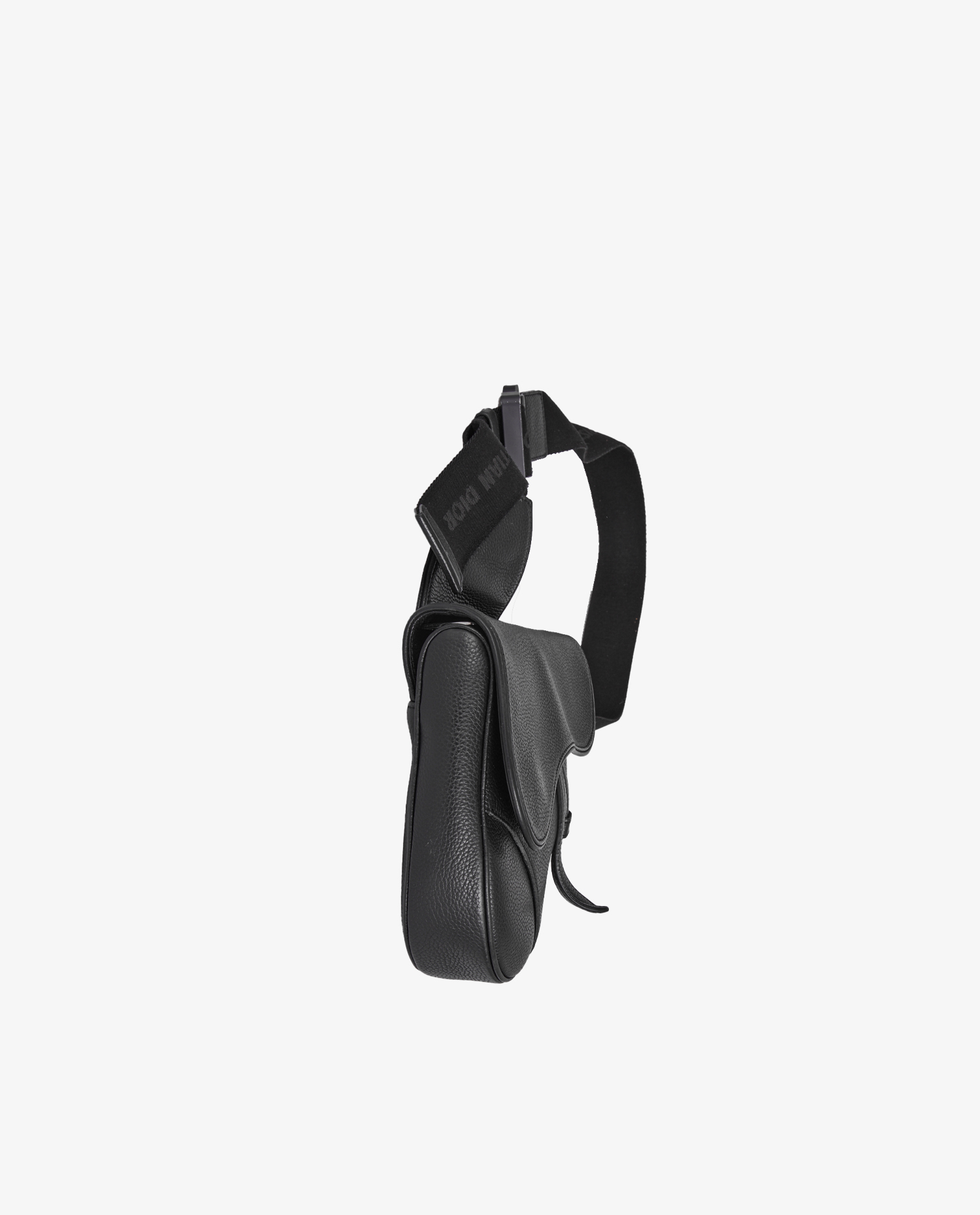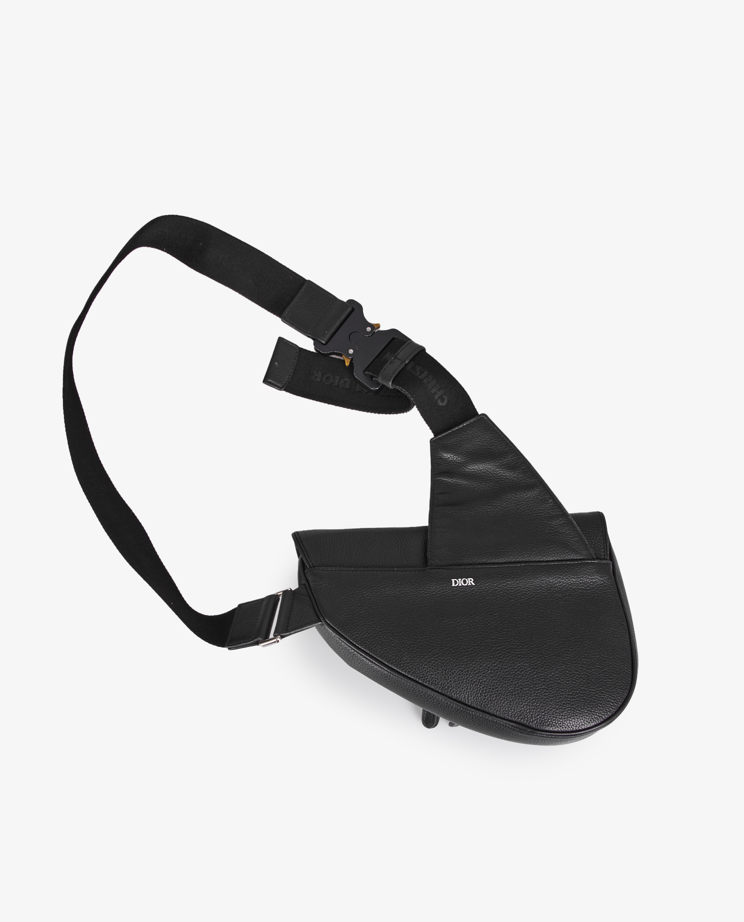 Dior men’s saddle bag in black grained leather. Carried on the shoulder or crossbody. The shoulder strap is adjustable. Snap closure and inside zip. The interior is in black fabric. In very good condition.