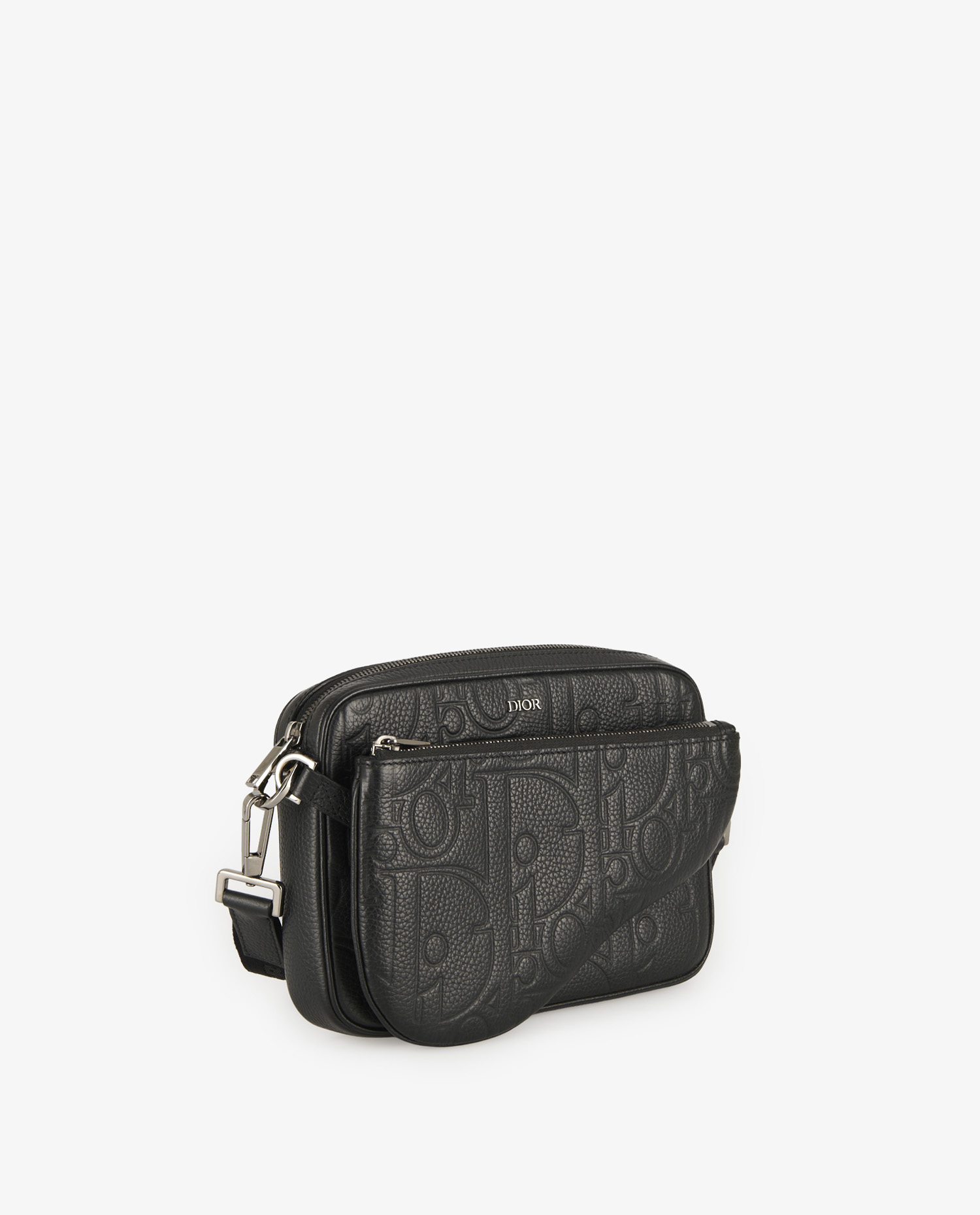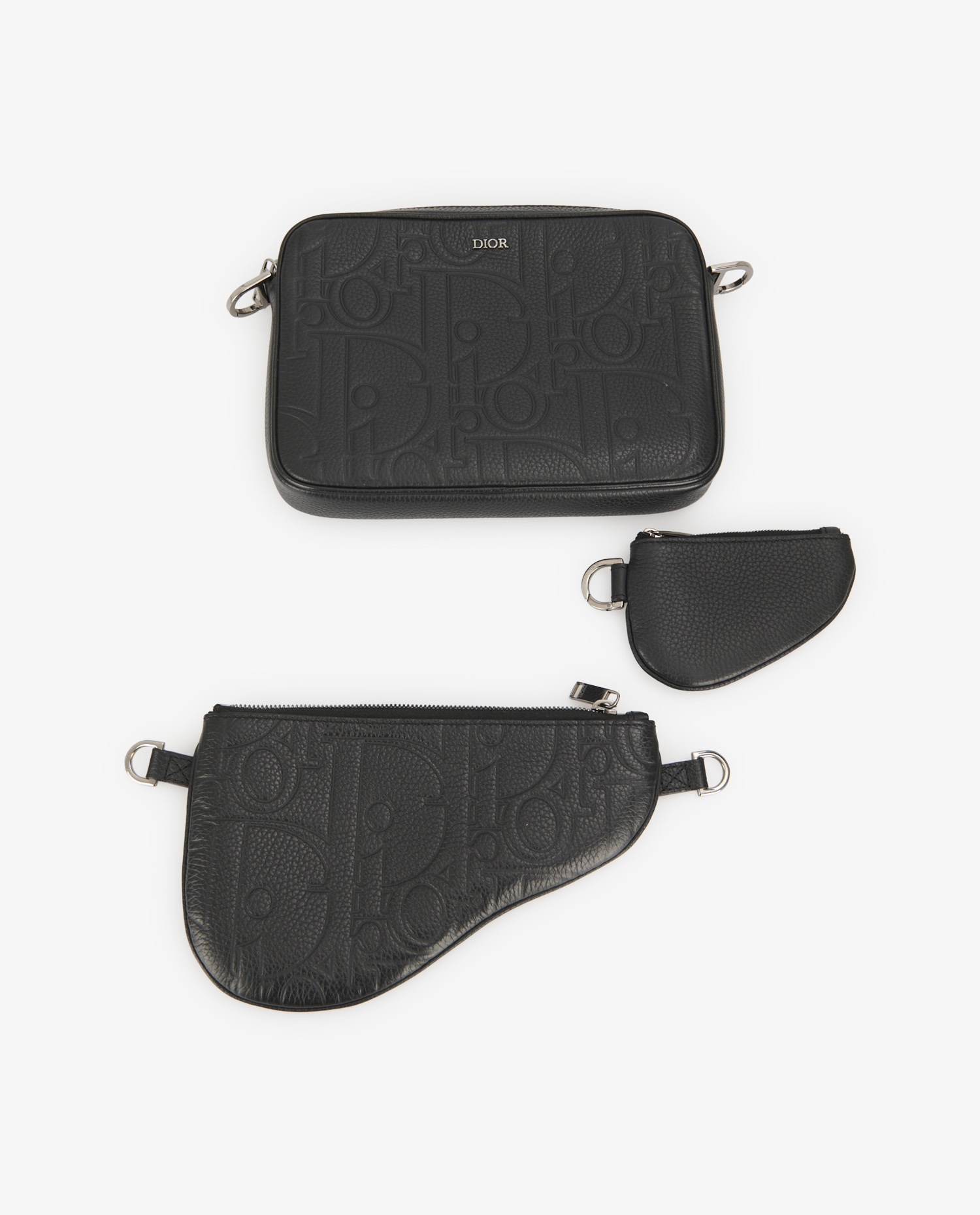 Black grained leather provides a robust, elegant texture, resistant to everyday wear and tear. The Dior monogram is embossed in tone-on-tone relief on the two larger pouches, reinforcing the visual identity of the piece. Metallic finishes in silver palladium provide a discreet yet refined contrast. All three pouches feature sturdy zippers, and metal rings allow them to be modulated at will on the shoulder strap.