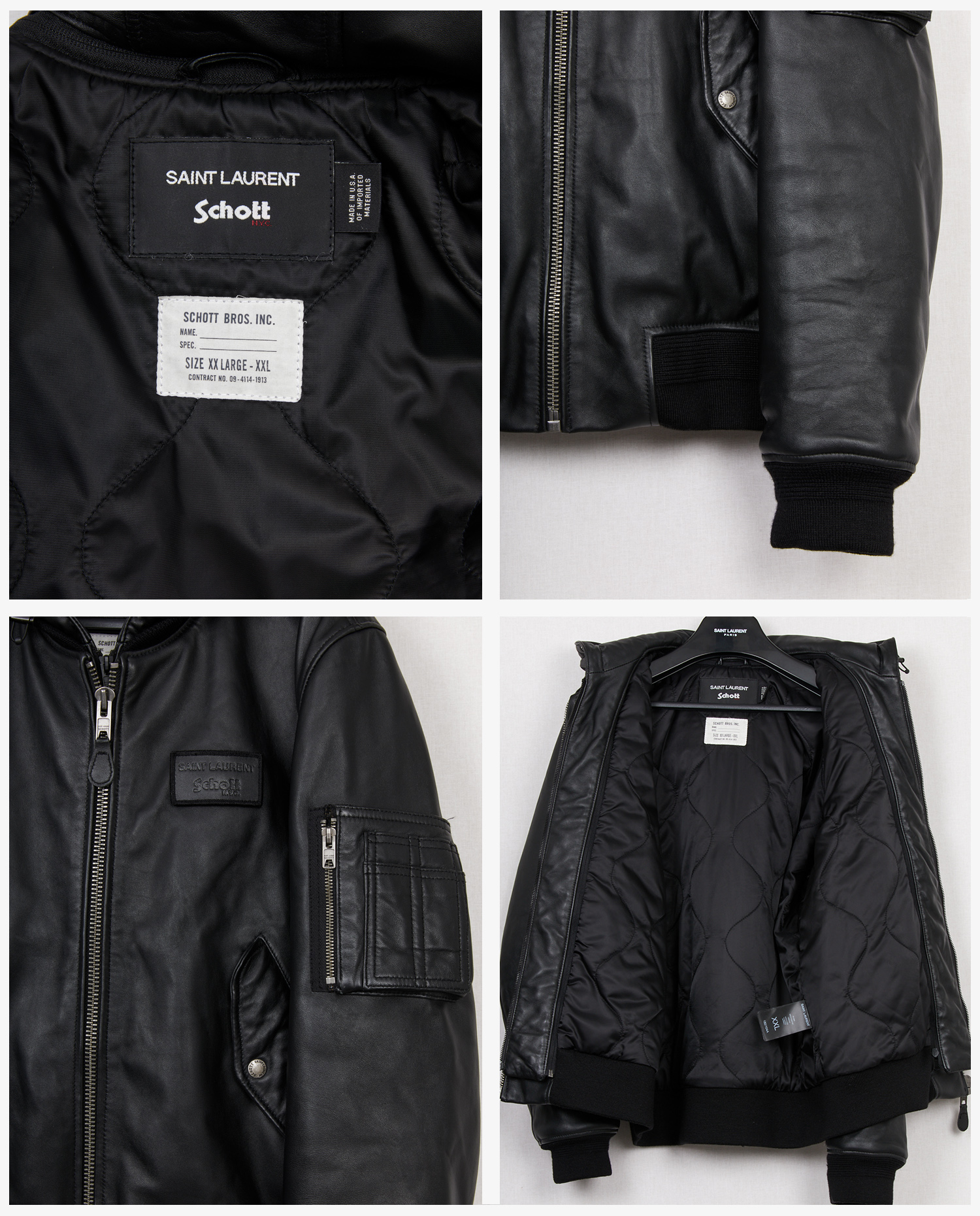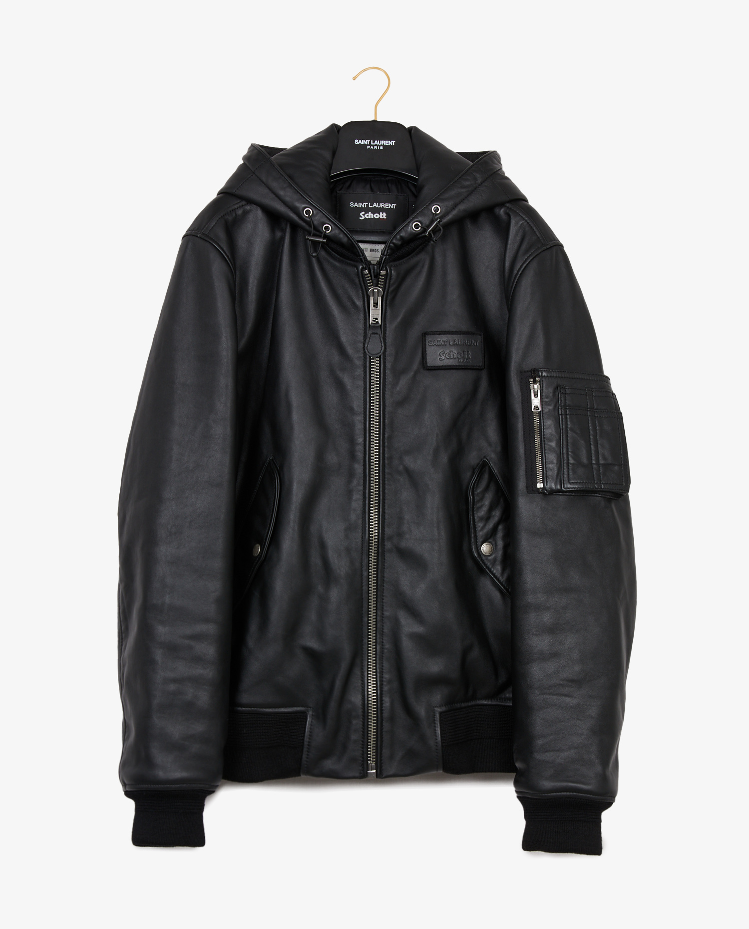 Saint Laurent x Schott jacket in black lambskin. Collector! This piece can be worn in two ways, with or without the hood. Size XXL. Sold only in the Rue Saint Honoré boutique. In very good condition. Public price 2950 euros.