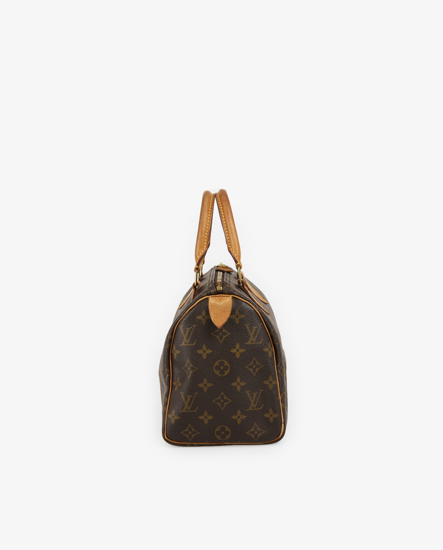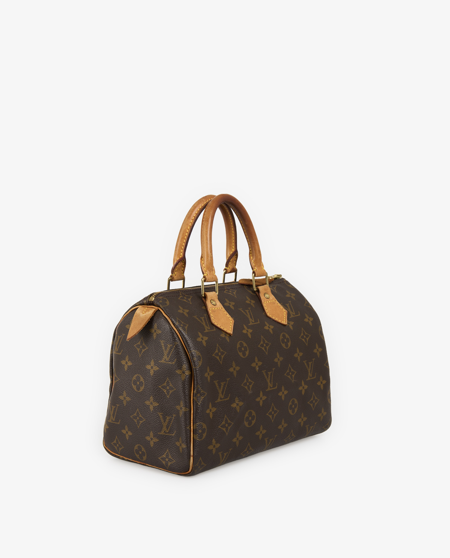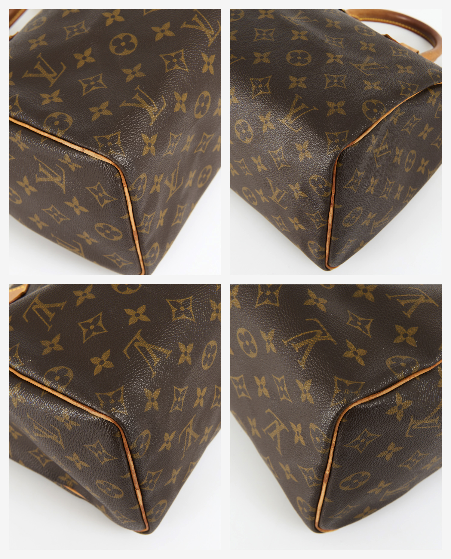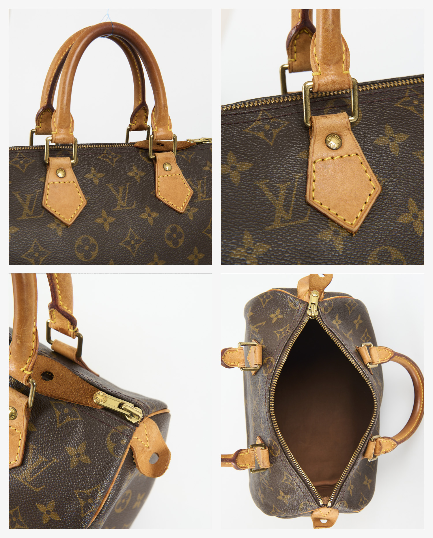 This Speedy 25 is in good vintage condition. The outer canvas is well preserved, with no noticeable cracks or stains. The cowhide leather shows a marked patina, with some visible rubbing on the corners and handles. The brass hardware shows signs of light oxidation. The zipper works perfectly, and the interior is clean, with no tears.