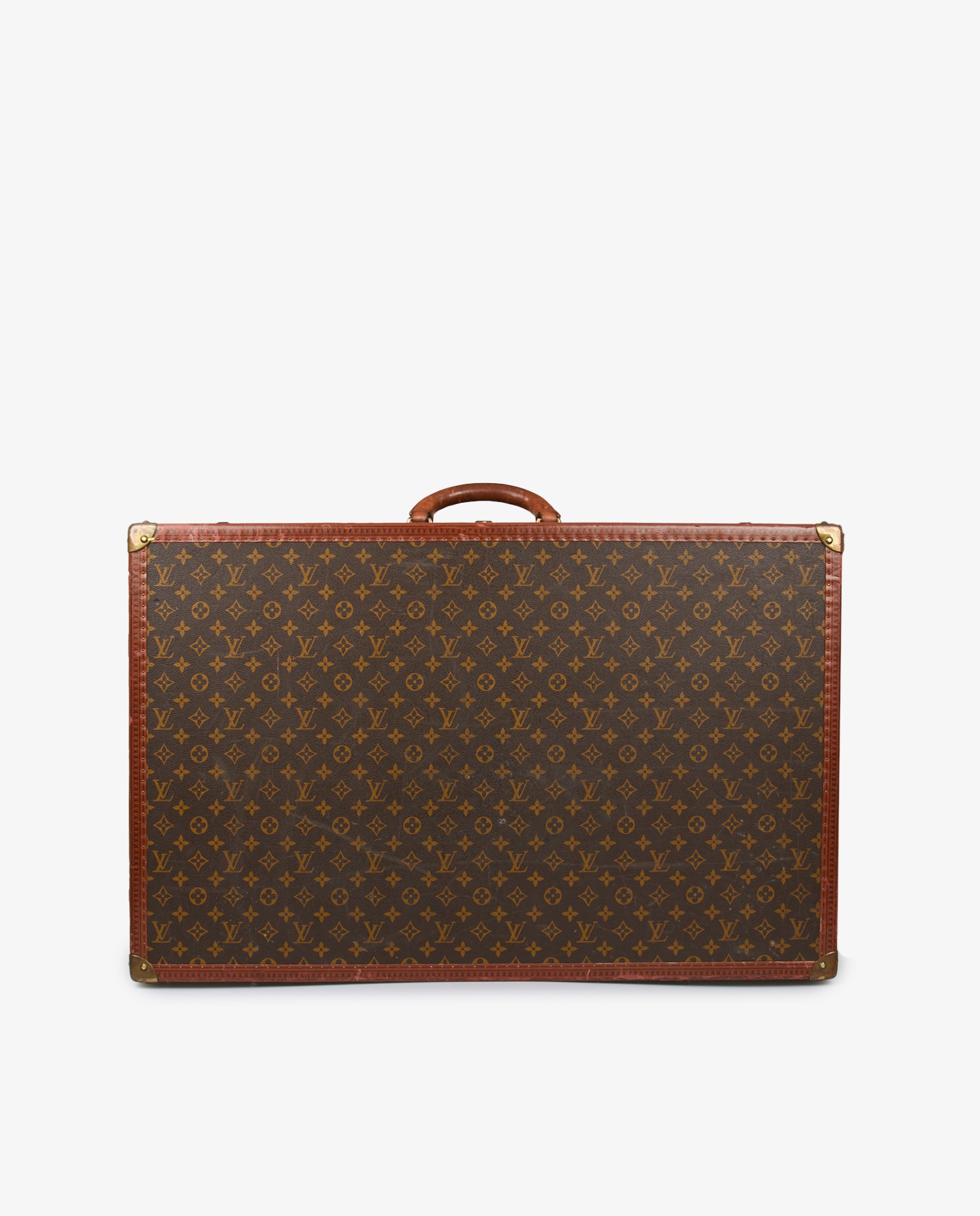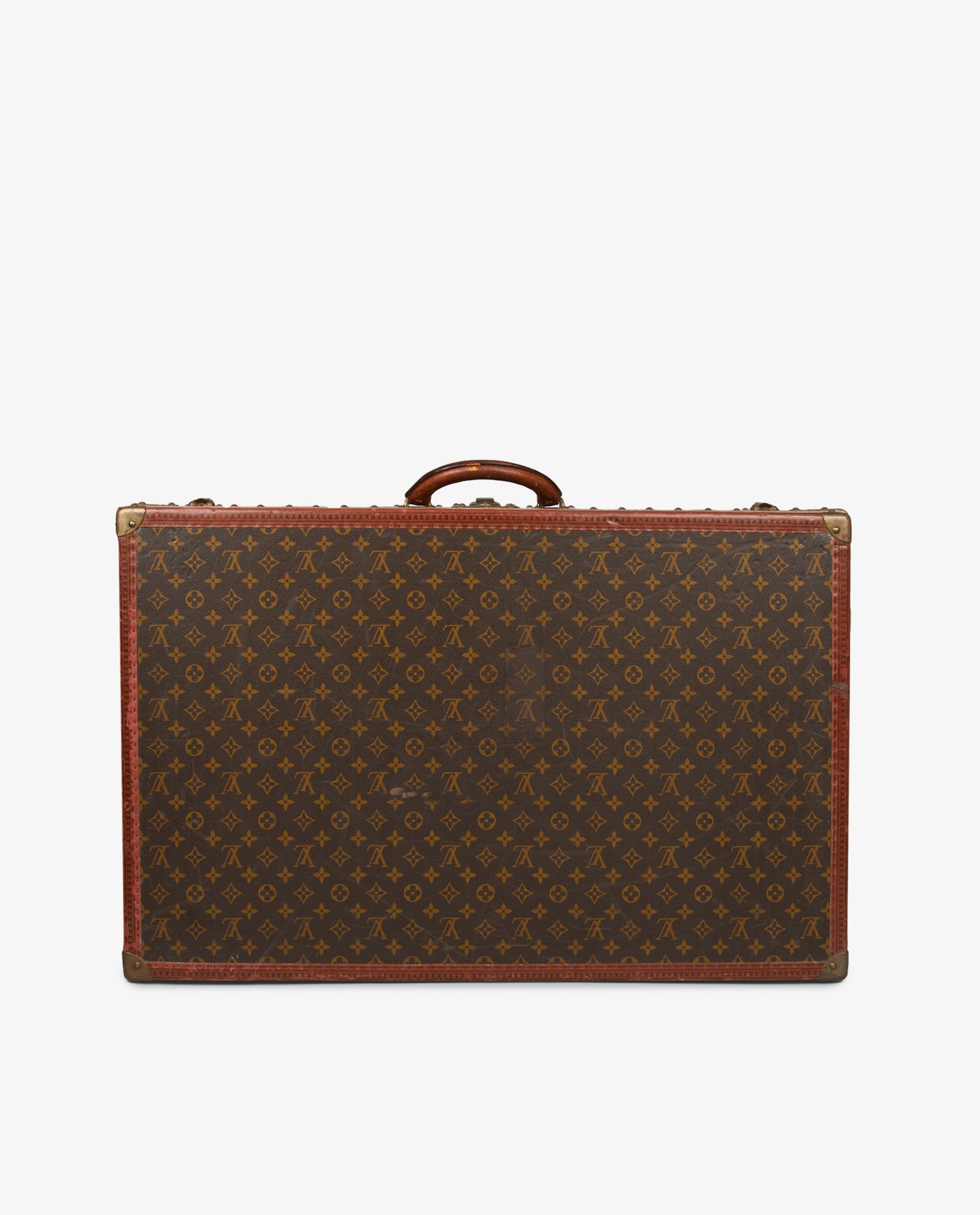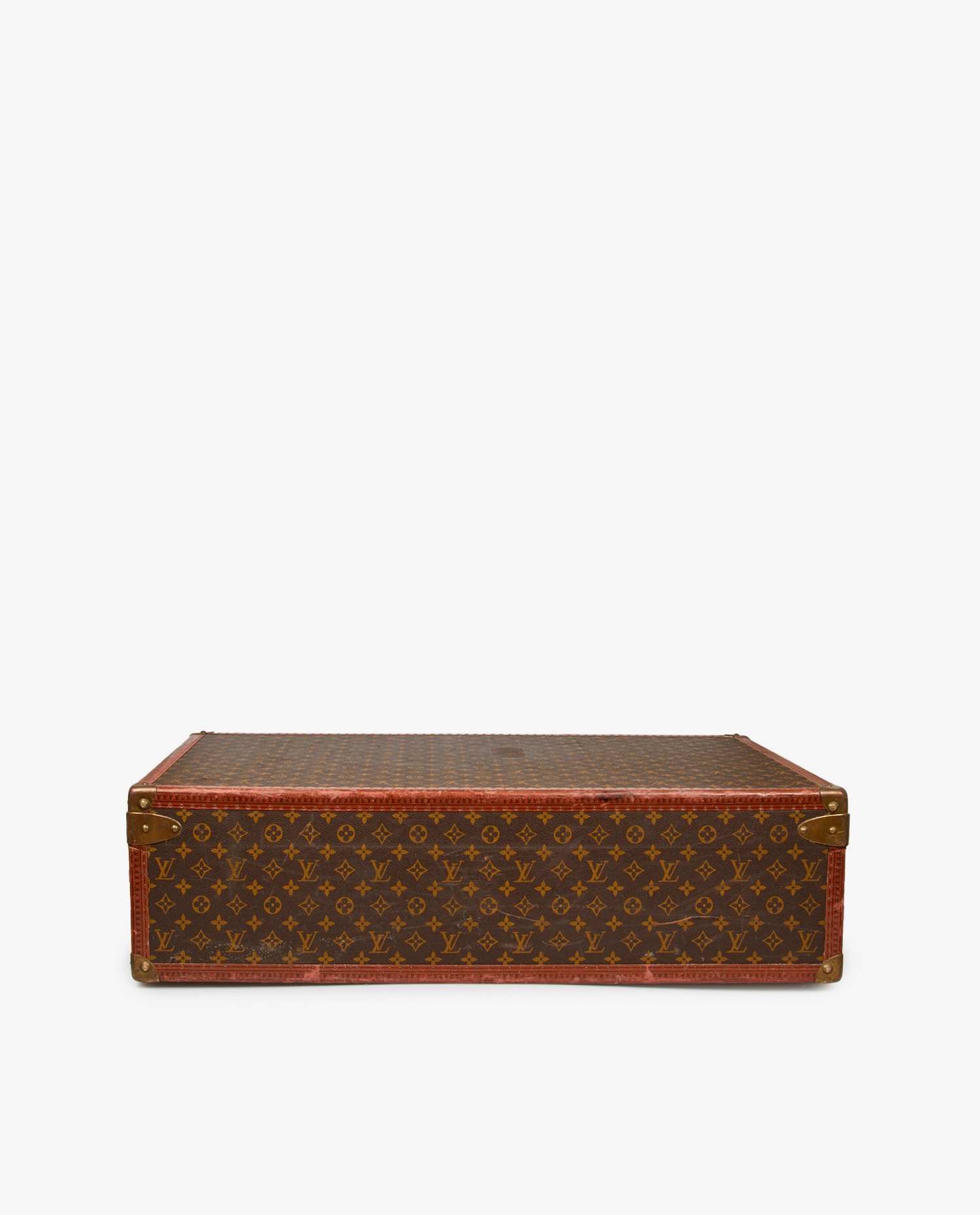 Second-hand Louis Vuitton Monogram canvas trunk (hard case), Bisten 70 model. The fittings are in gilded metal. The lining is made of canvas with support straps (small stains on the canvas). It can be carried by hand thanks to its rounded leather handle. The Louis Vuitton “S” lock (with two keys) is reinforced by two additional latches for secure closure. The edges are in Monogram leather with reinforced rivets and gilded metal corners. A gilded initials inscription “D.B” is located under the lock. Address label holder. This suitcase is in good used condition (wear marks and scratches on the canvas, and fittings aged by time).