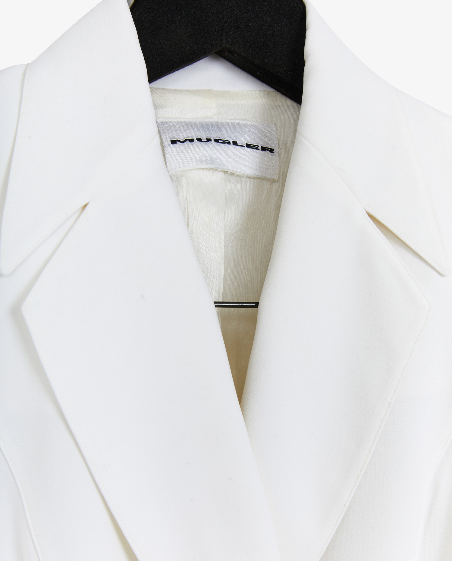 Vintage Thierry Mugler set in white cotton. Very fluid and smooth. The pants are high-waisted with darts. The jacket has epaulets and is fitted at the waist. Size 36. In very good condition.