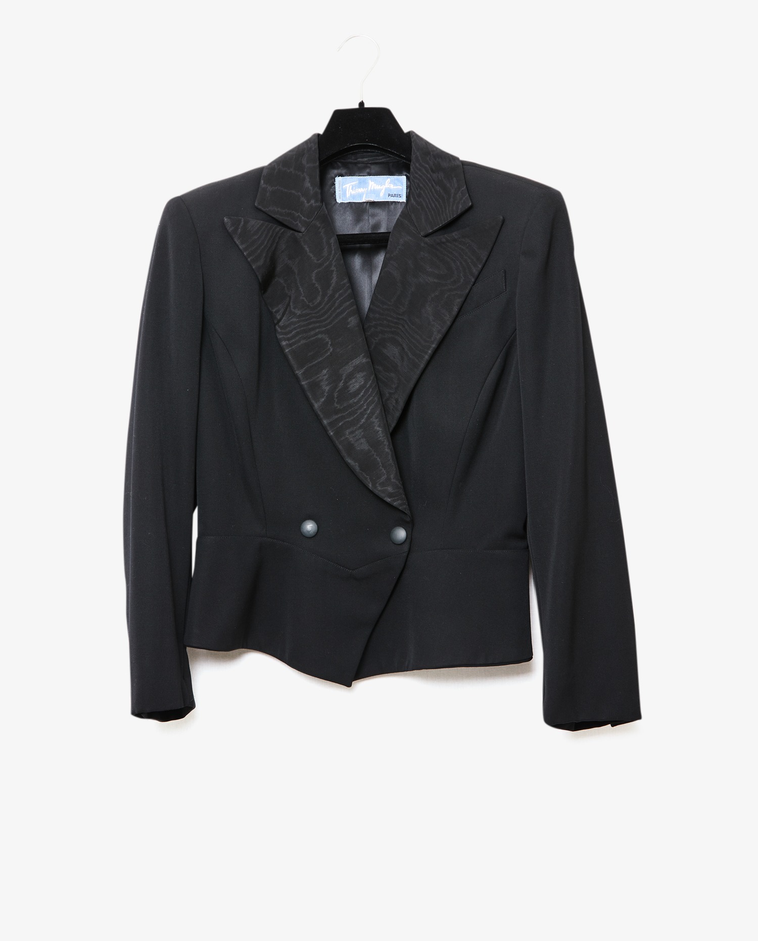 Thierry Mugler vintage black tuxedo jacket. Black silk lining. Size 40. Tightened waist and epaulets for a more feminine look. Crossed buttons. In very good condition. Wear mark on one of the buttons.