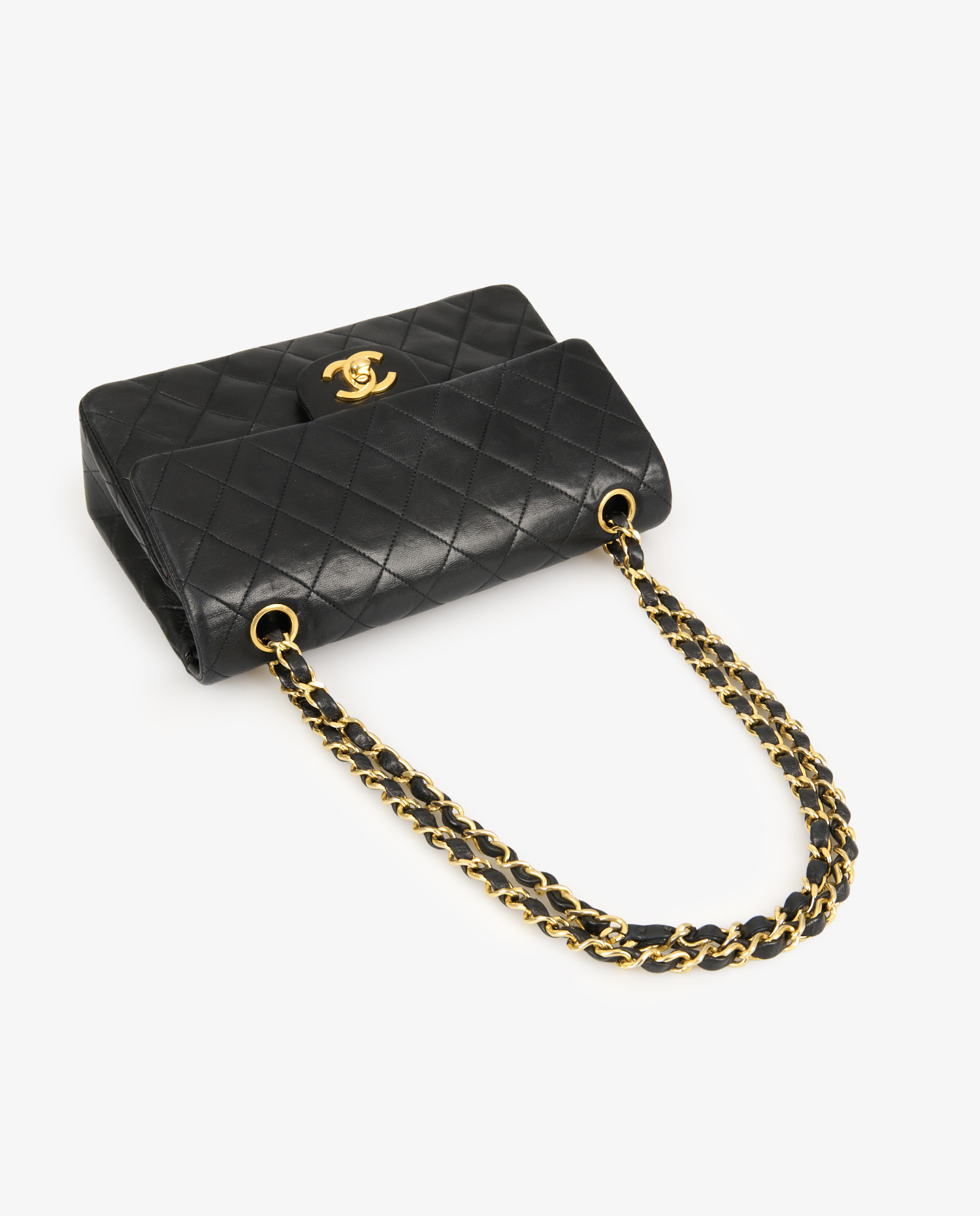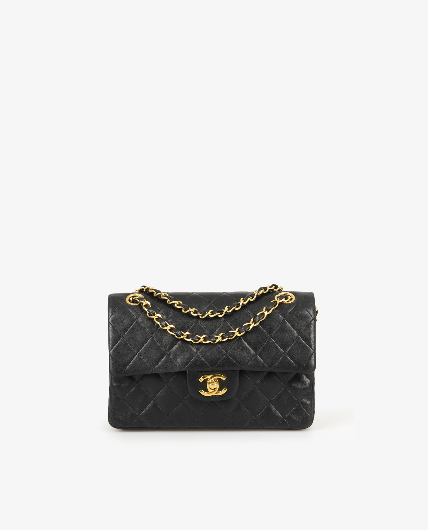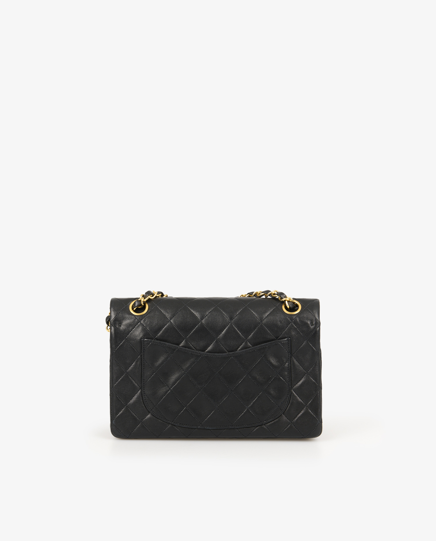 The black lambskin leather exterior features diamond-shaped quilting that structures the bag’s silhouette. The gold chain intertwined with leather, bright and strong, allows for different carrying lengths. The gilded metal double C-turn clasp enhances the front and retains its shine. On the back, a rounded patch pocket completes the design, true to Chanel’s classic codes. The reduced dimensions (approx. 23 x 14 x 6 cm) make this model an elegant and discreet accessory.