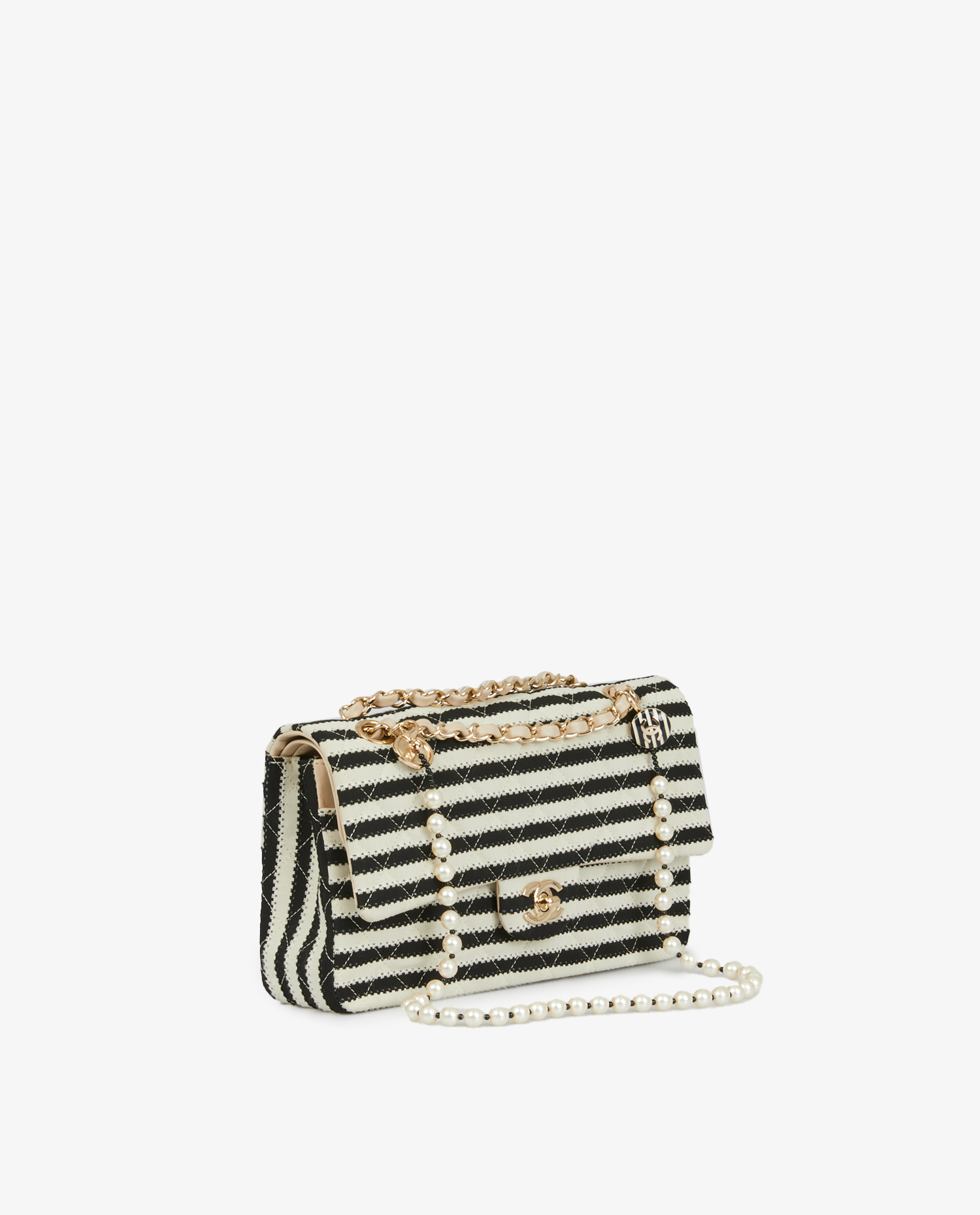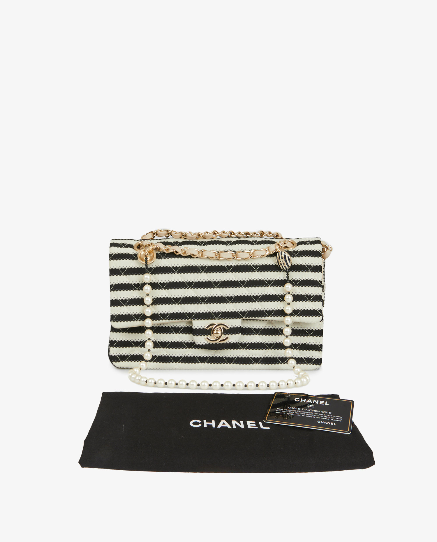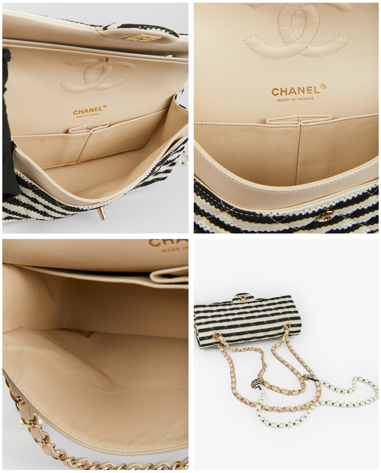 Timeless Chanel Collector bag in black and off-white striped fabric. Double flap. CC clasp. The interior is in beige leather. Gold chain (66cm) and leather (110cm) and another removable one with pearls. In very good condition. Delivered in its original dustbag.