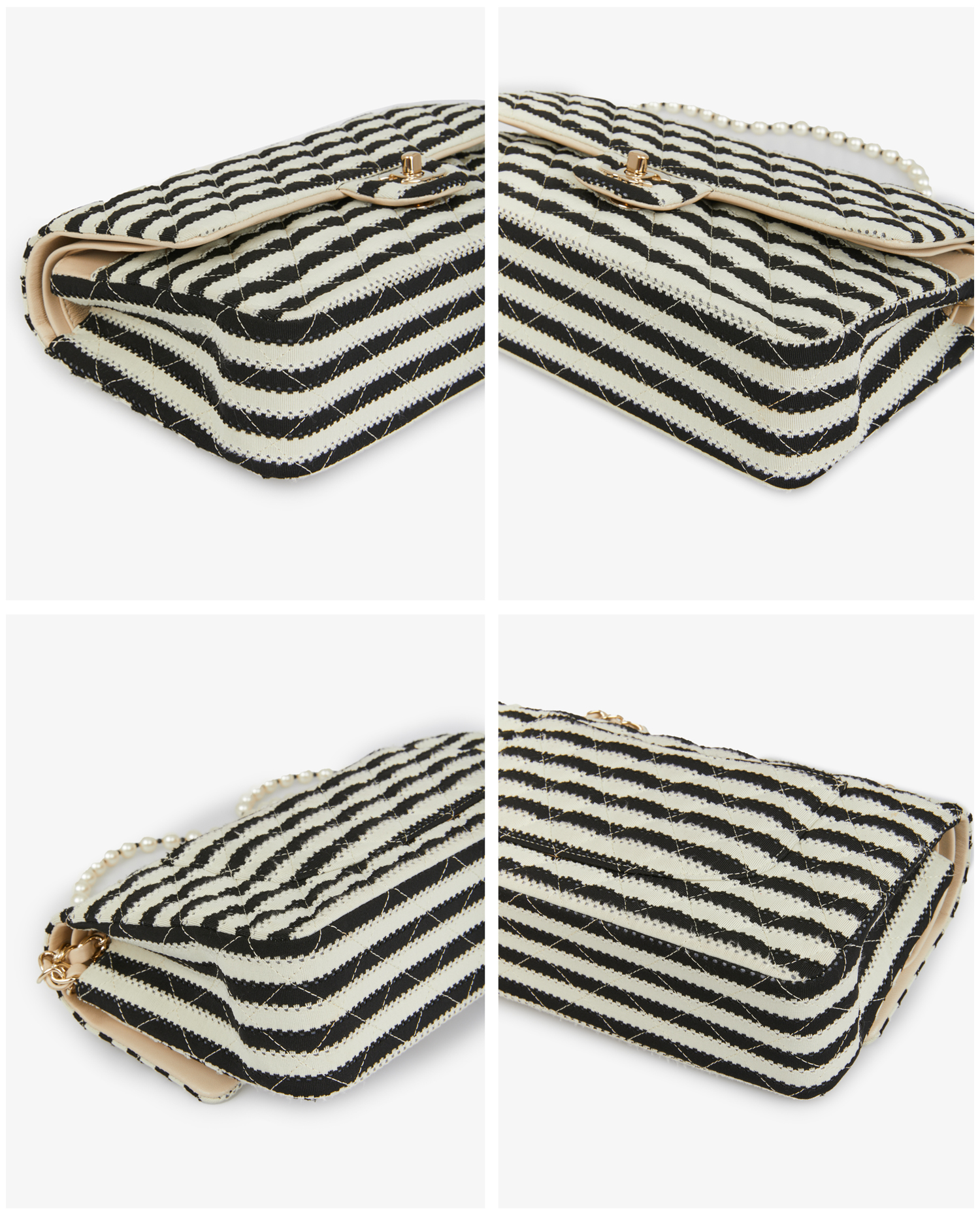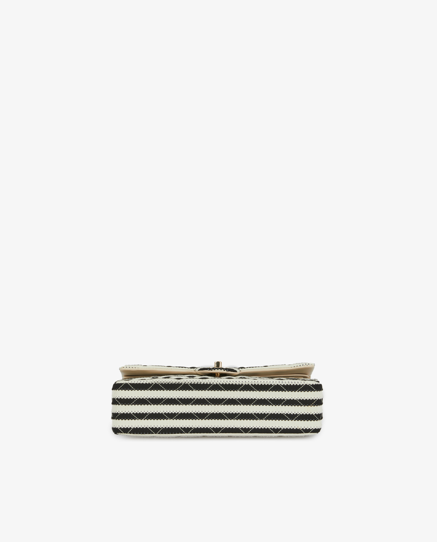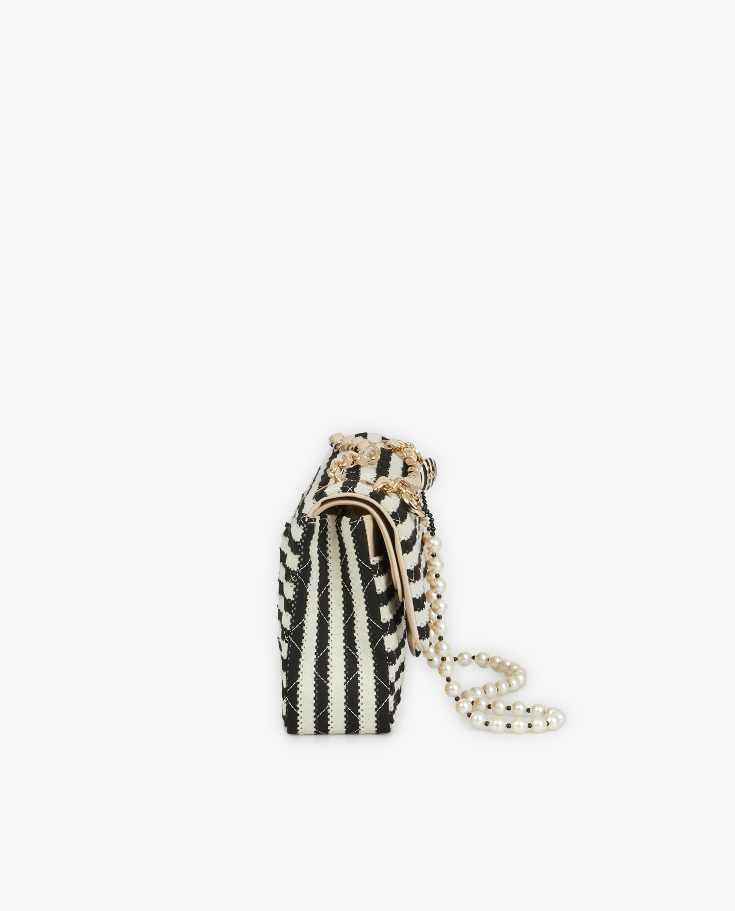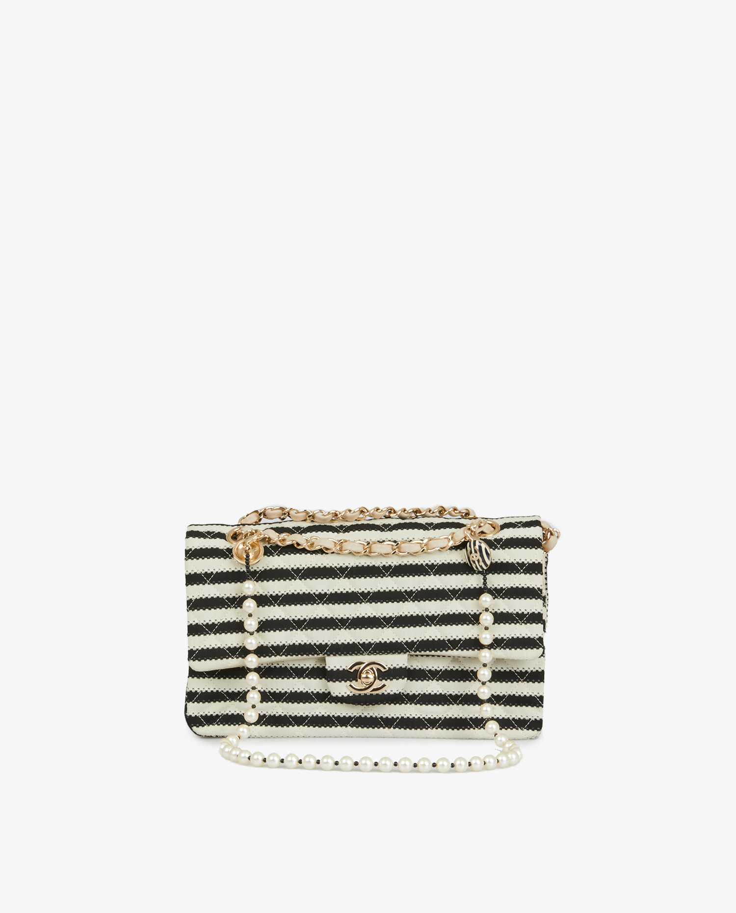 Timeless Chanel Collector bag in black and off-white striped fabric. Double flap. CC clasp. The interior is in beige leather. Gold chain (66cm) and leather (110cm) and another removable one with pearls. In very good condition. Delivered in its original dustbag.