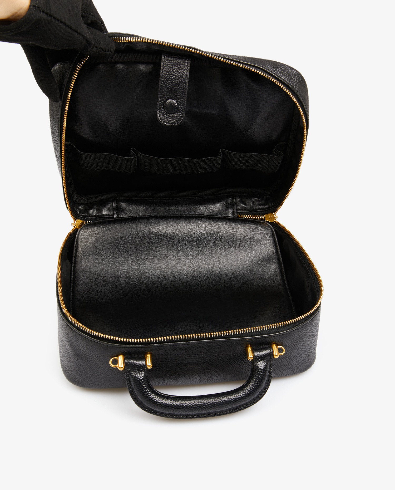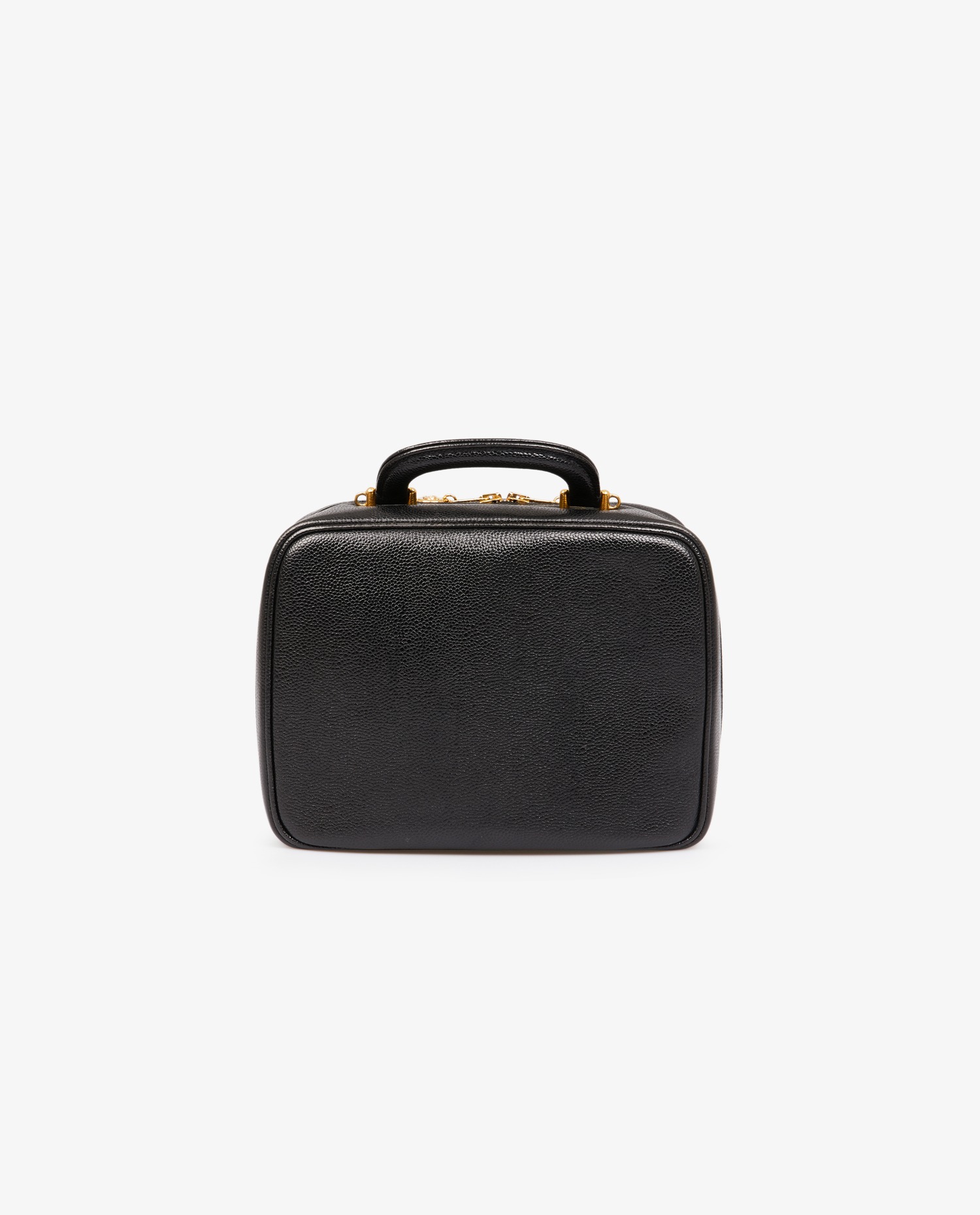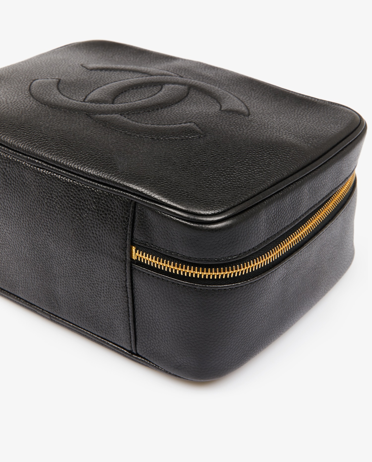 Vintage Chanel vanity bag in black grained leather. Zipper closure. Carried by hand or on the shoulder/crossbody with removable shoulder strap (112cm). In very good condition.