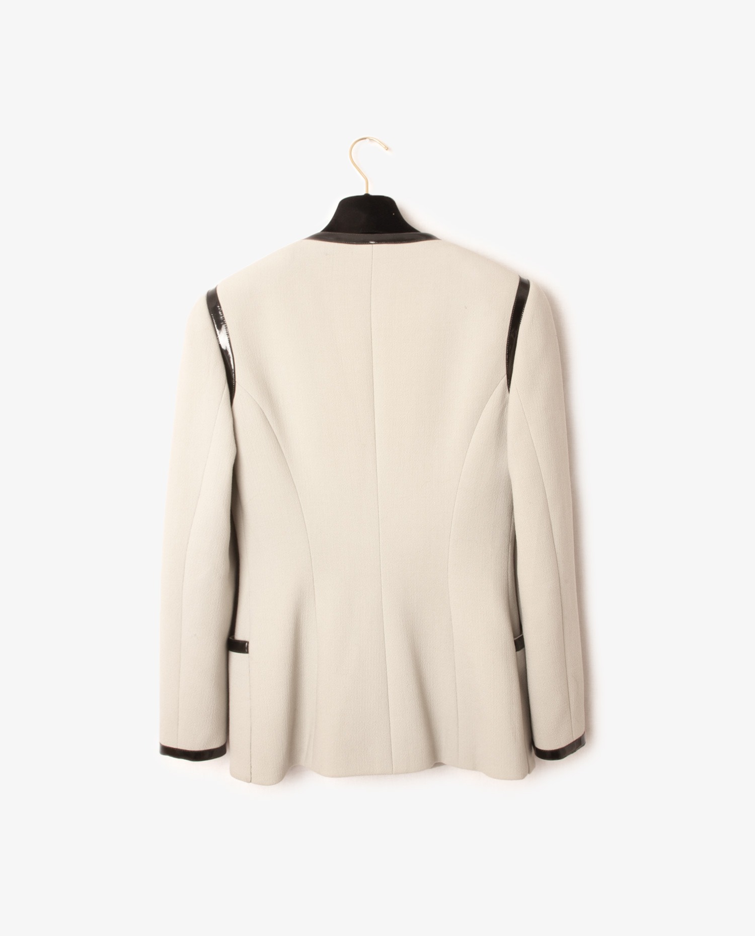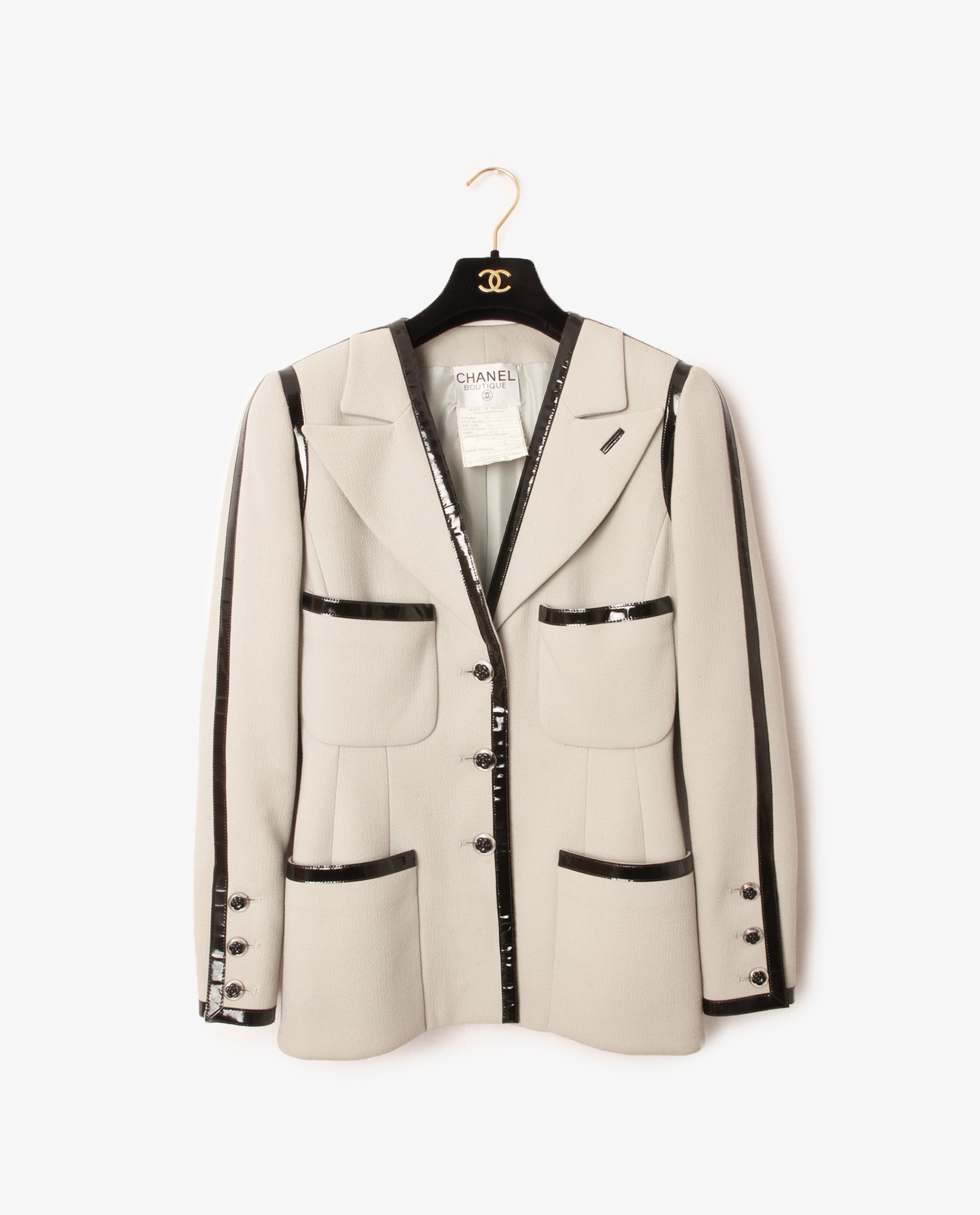 A rare piece! Vintage Chanel jacket from the Autumn 1989 Collection. Grey wool with structured waistband, epaulets and 4 patch pockets. Finished in black patent leatherette. CC” lining in grey silk with gold chain. Black transparent camellia buttons on front.