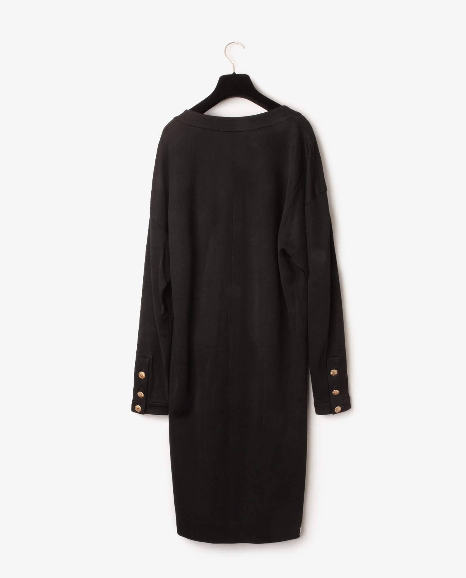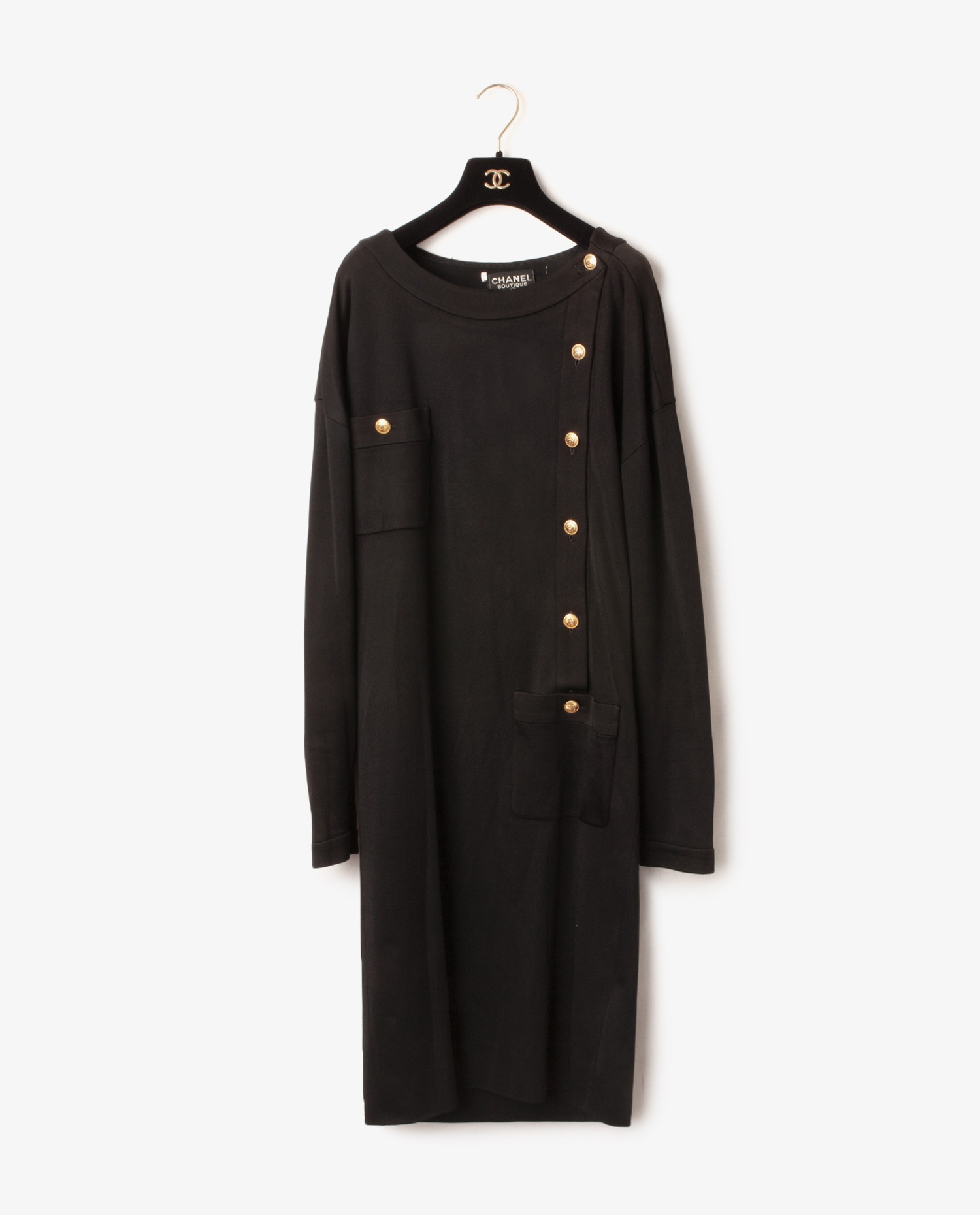 Vintage Chanel cocktail dress. Loose fit. Black silk lining. It closes with “CC” gold buttons. Raglan sleeves.