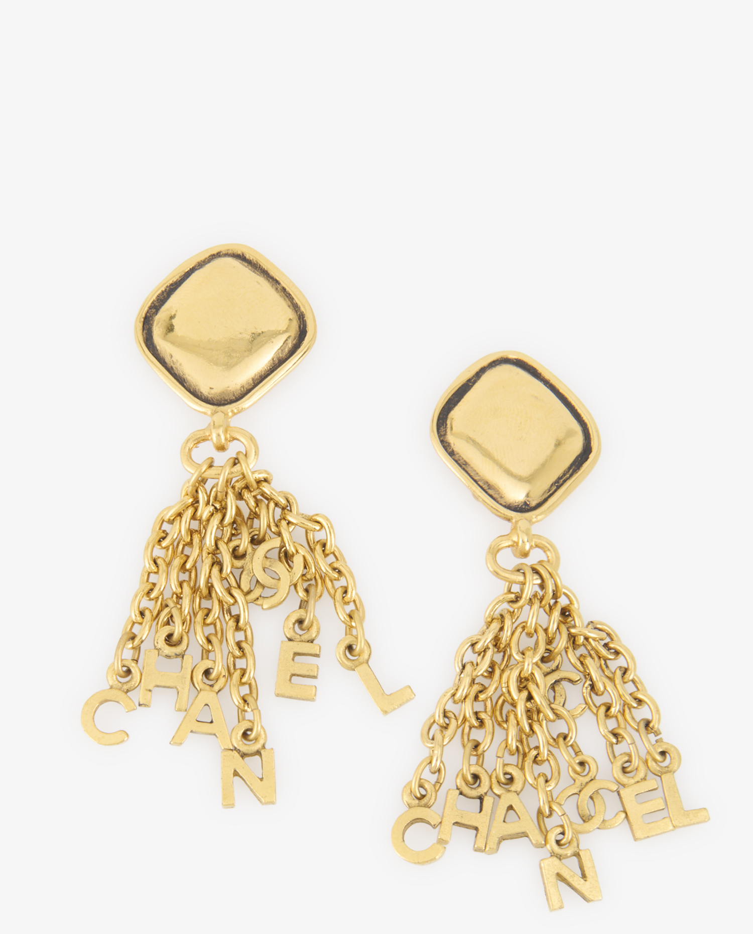 The clips are made of shiny gold-plated metal with a light patina, characteristic of vintage Chanel jewelry. Each buckle features a domed square base approximately 2.5 cm square, connected to a bundle of golden chains. The dangling letters CHANEL are attached independently, creating fluid movement and a light sonic dimension to the wear. The double C logo appears at the center of the chains, reinforcing the iconic aspect. The clip fasteners are securely attached, and the back features the signature oval “Chanel – Made in France”.