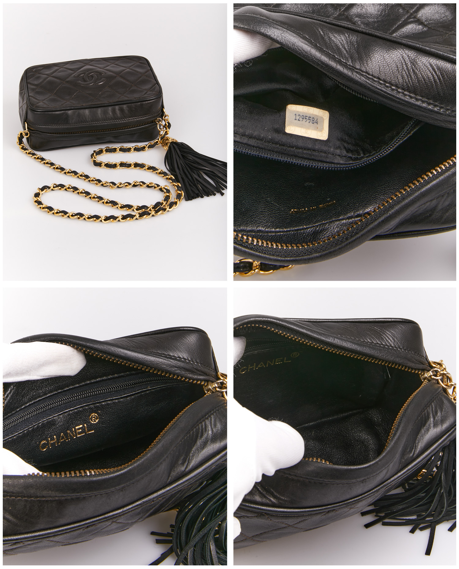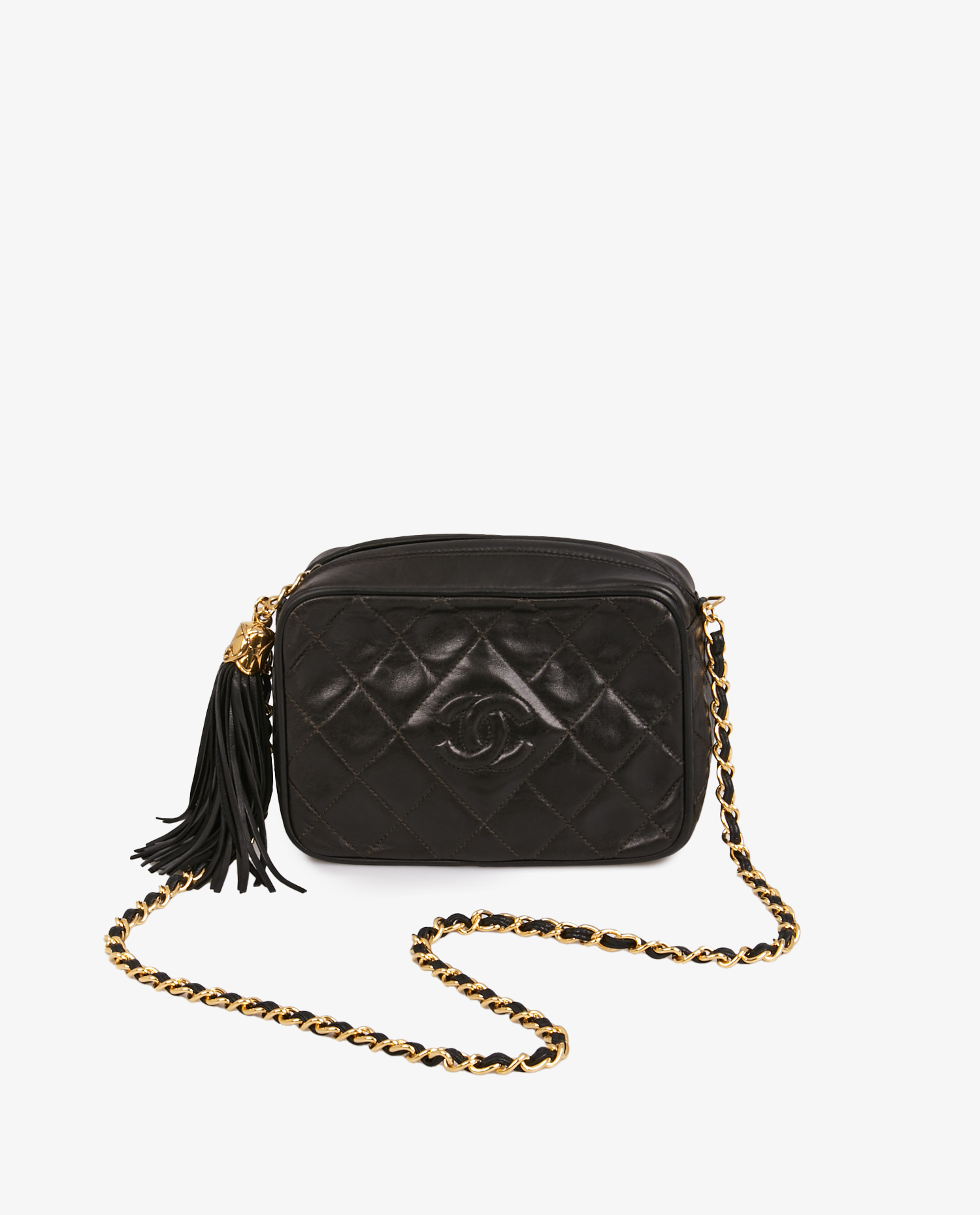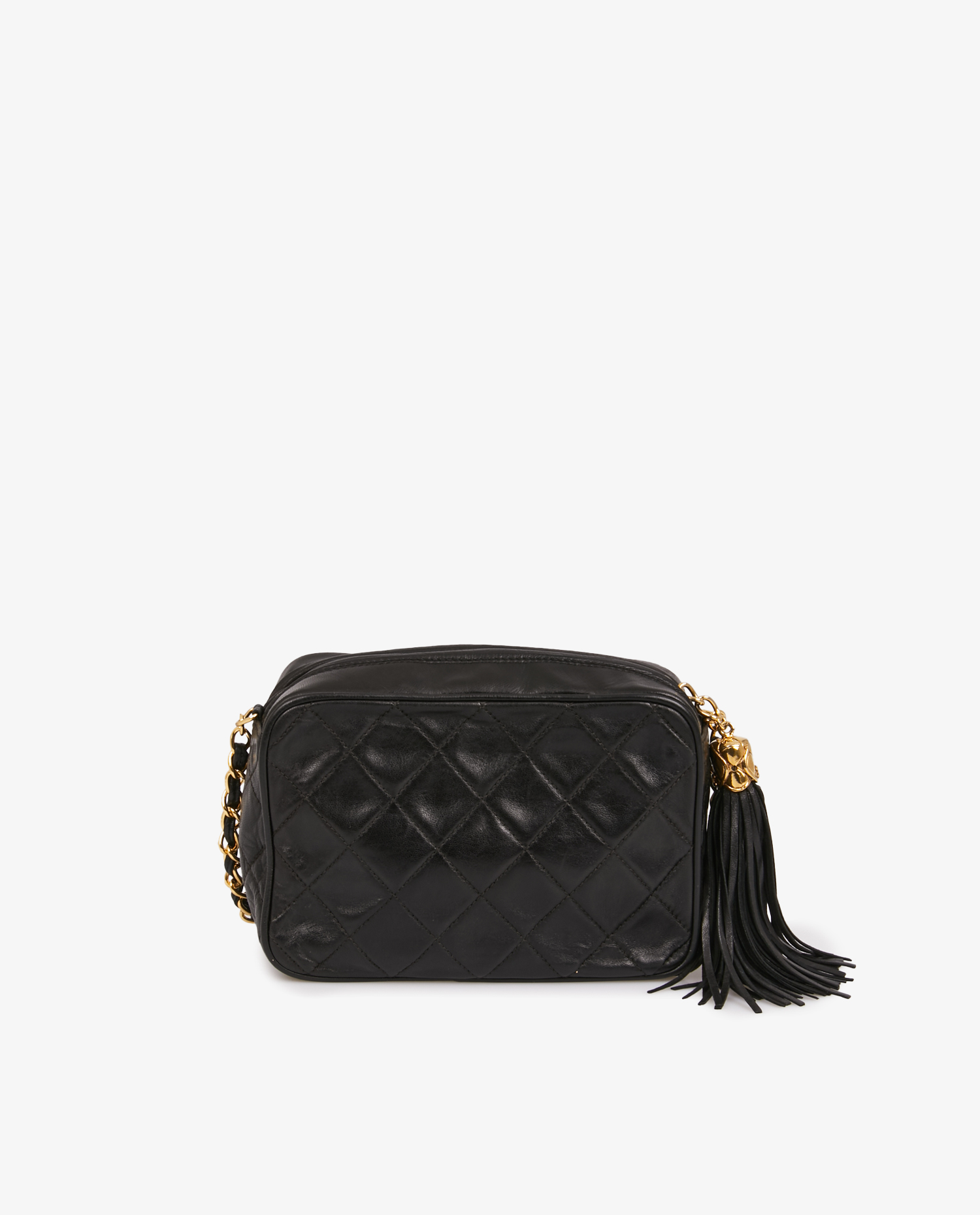 Vintage Chanel mini camera bag in black quilted lambskin. The jewelry is gold-plated. Zipper closure. Worn on the shoulder or crossbody with a chain and leather shoulder strap (101cm). In very good condition.