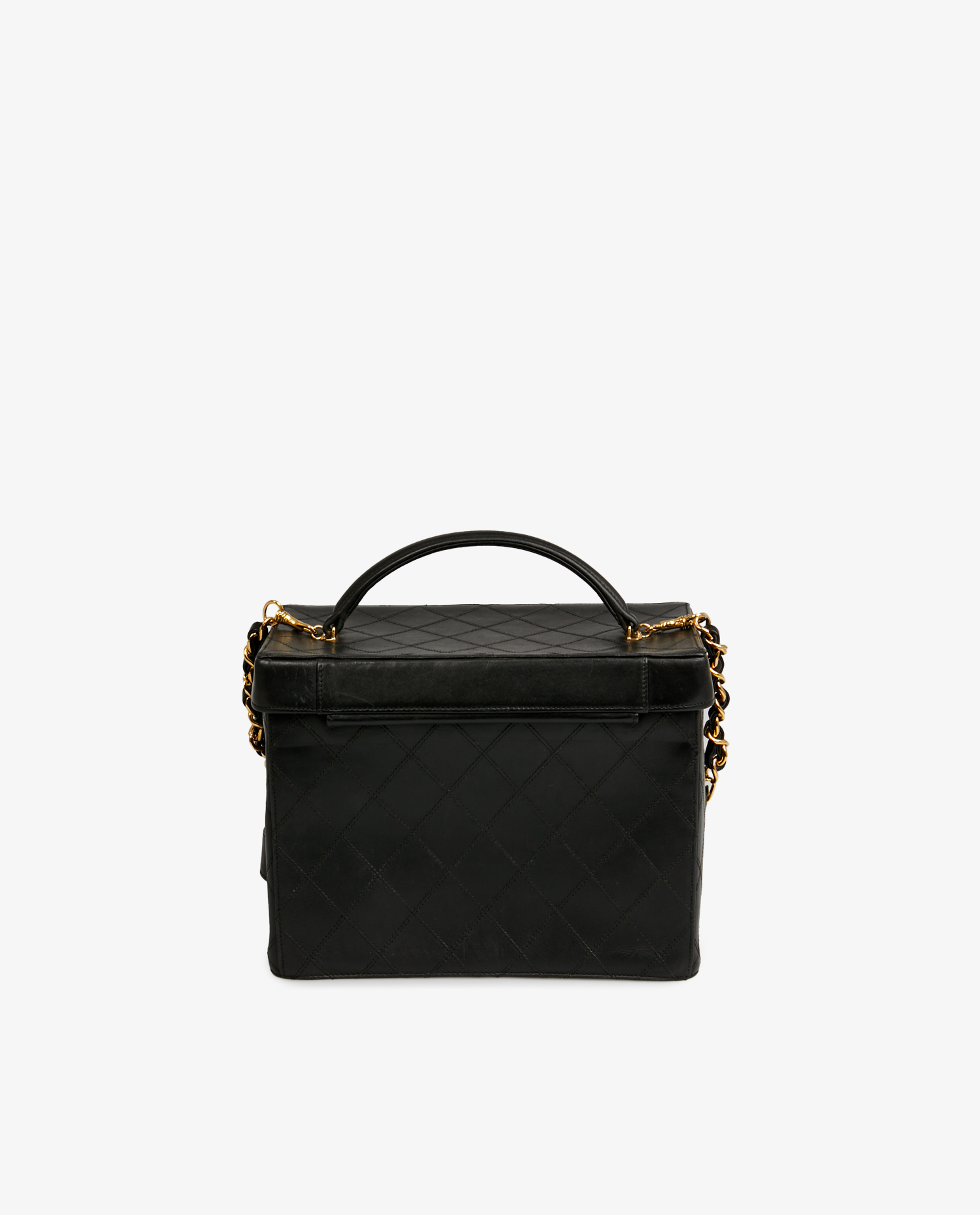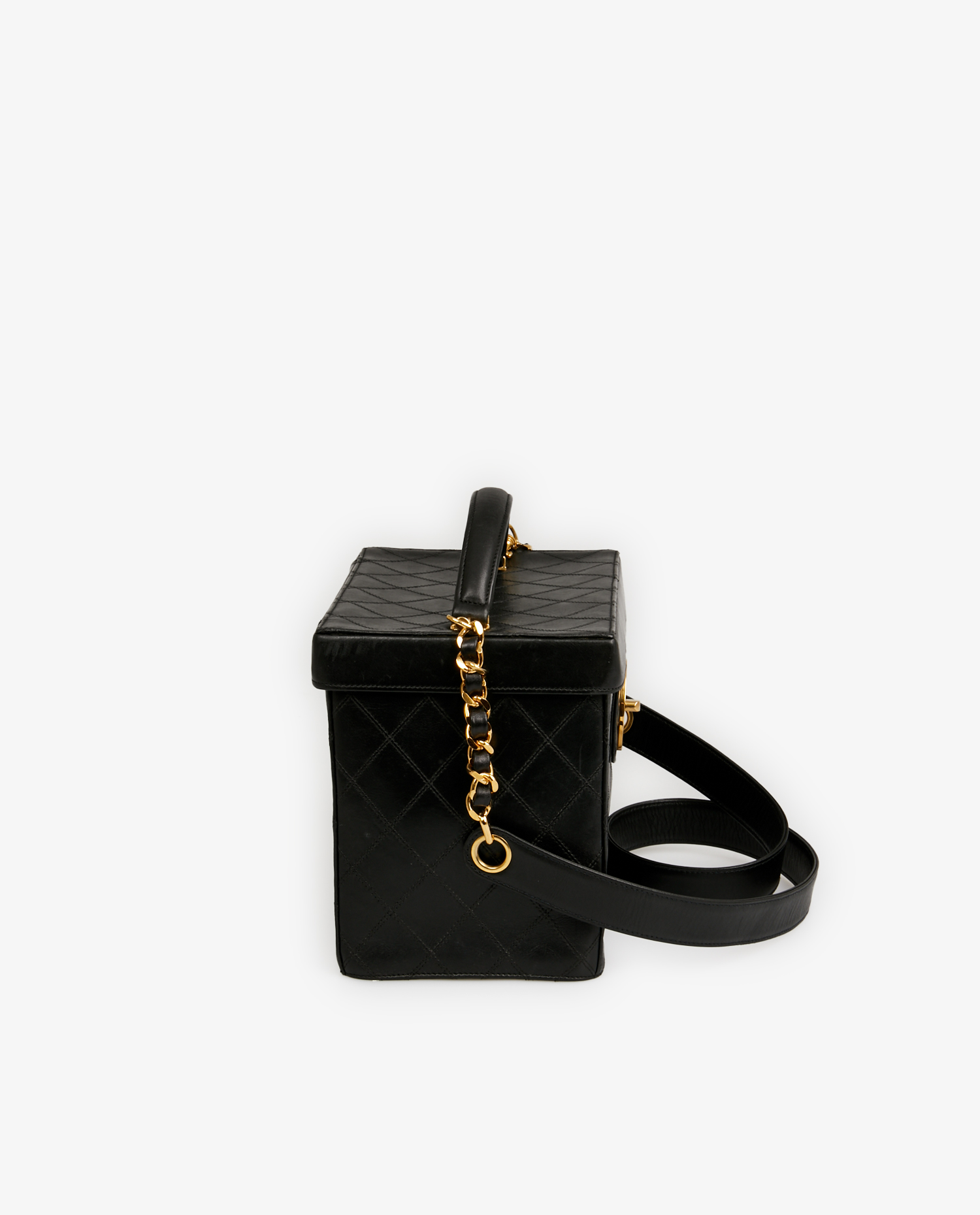 Introduced in the 1990s, the Chanel vanity case was conceived as an elegant variation on luxury toiletry sets. Its rigid, travel-case-inspired aesthetic, vertical format and compartmentalized structure make it both decorative and functional. Produced between 1991 and 1994, this version perfectly illustrates Karl Lagerfeld’s approach at the time: revisiting traditional Chanel codes (quilting, gold jewelry, CC clasp) to create bold accessories, hybrids between fashion leather goods and utilitarian objects. Today, this model is sought-after for its original shape, versatility and rarity on the vintage market.