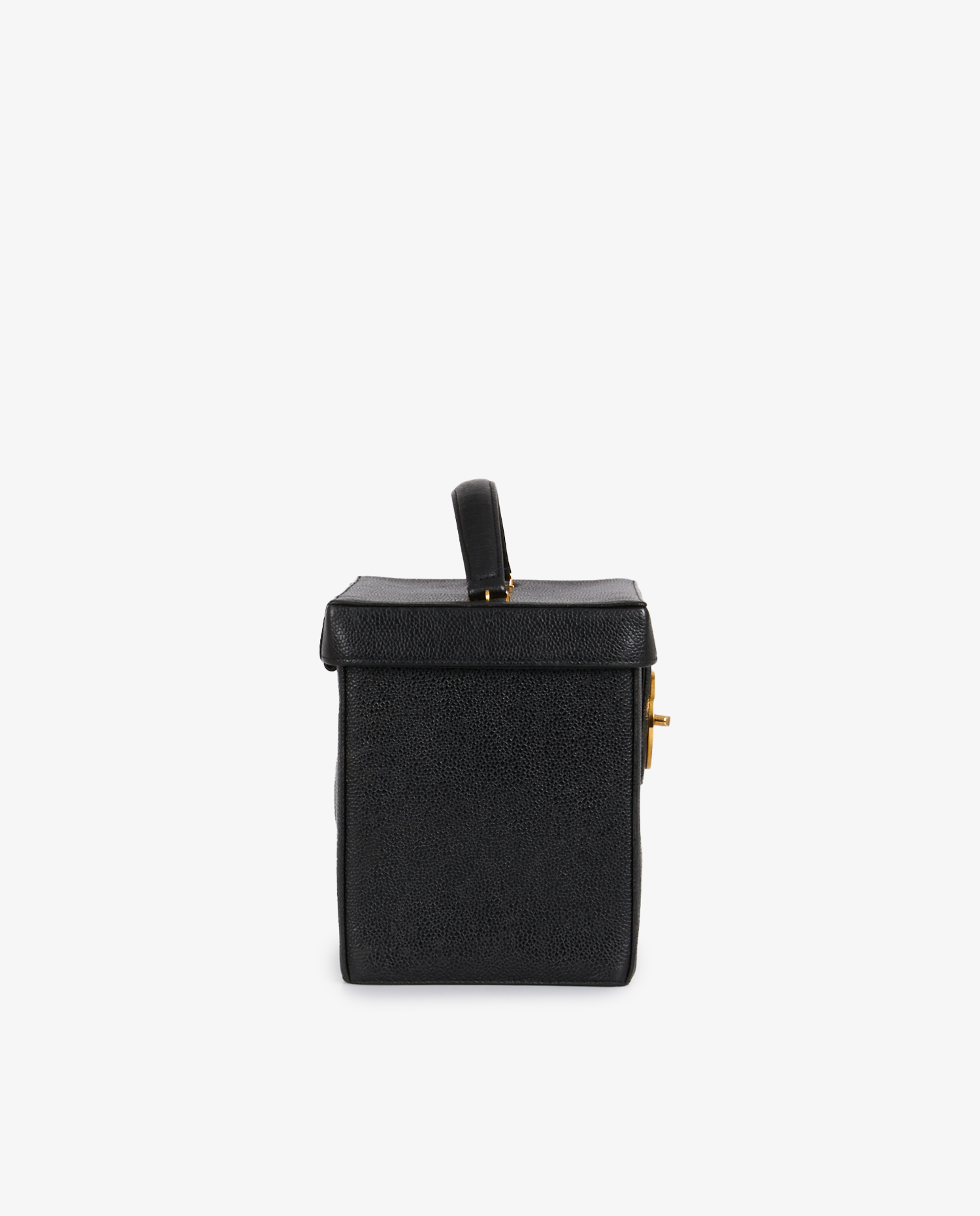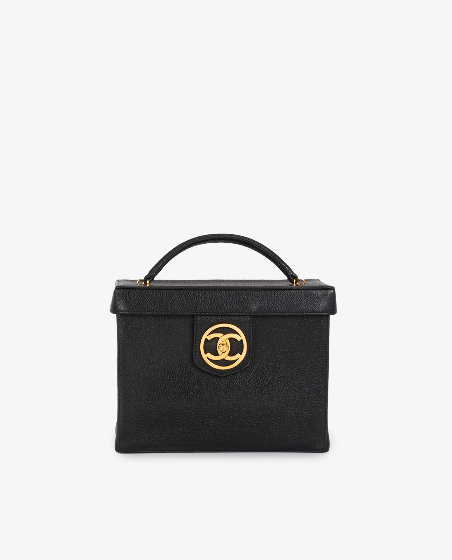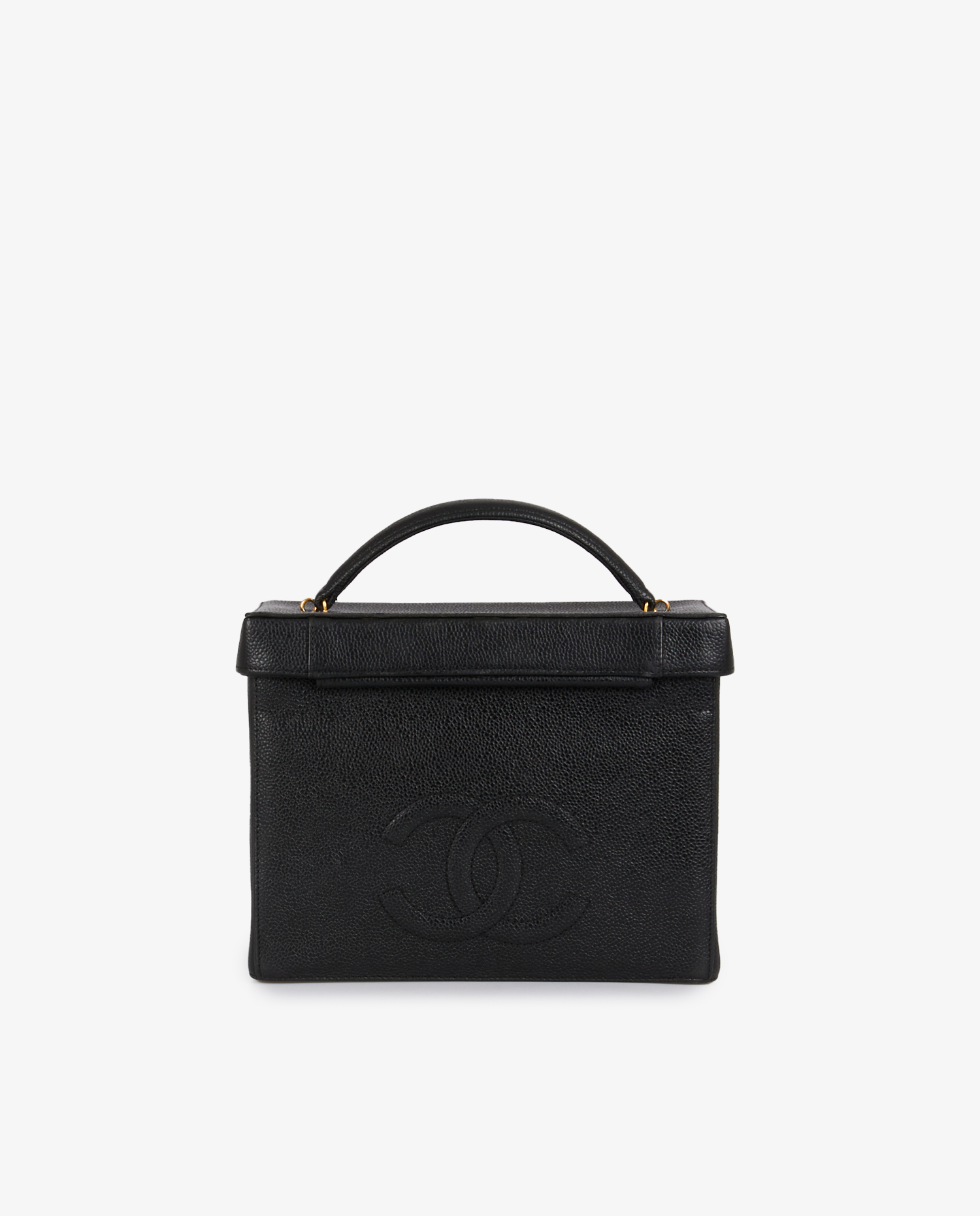 Vintage Chanel vanity bag in black grained leather. Carried by hand or on the shoulder with removable shoulder strap (108cm). CC clasp. In very good condition.