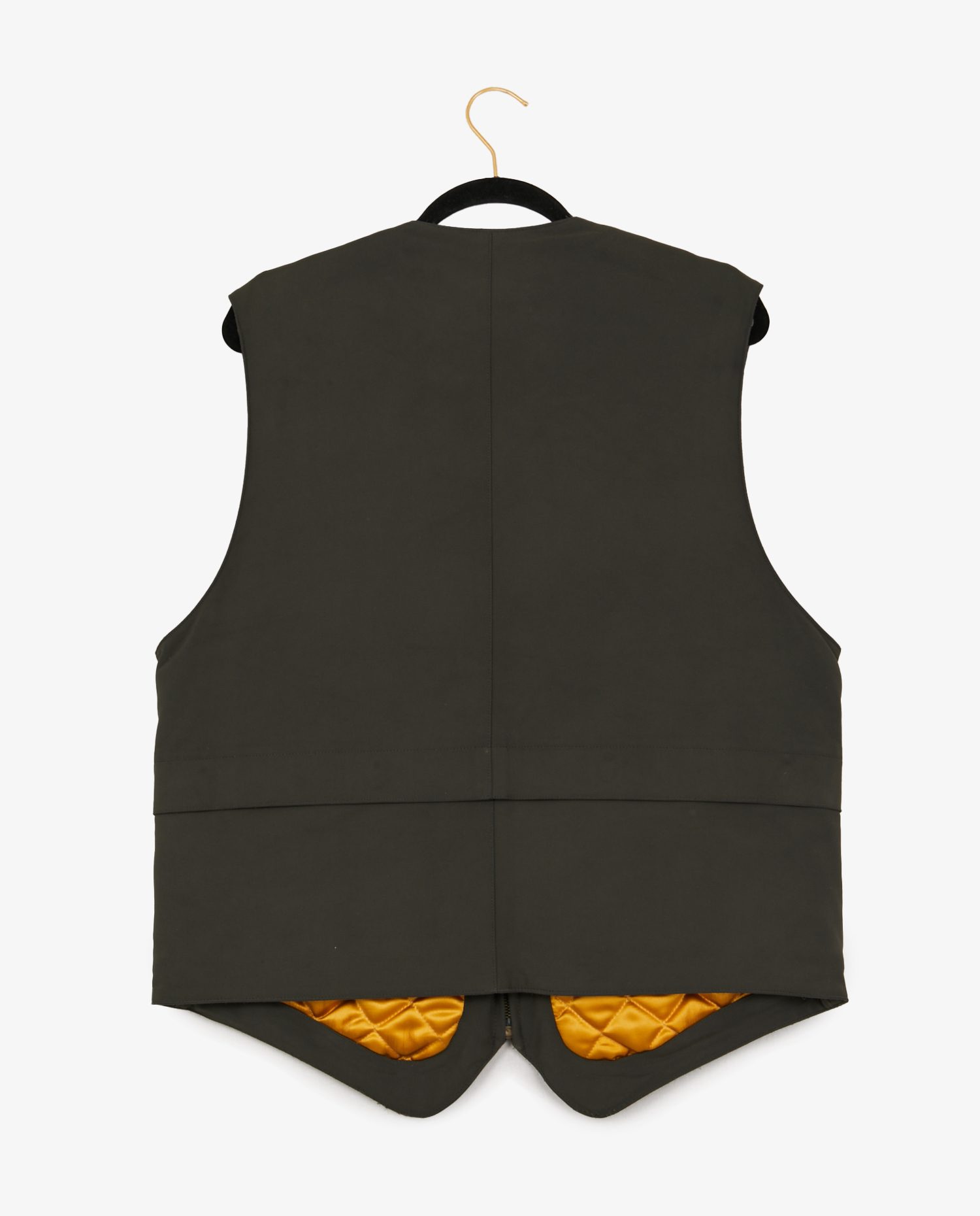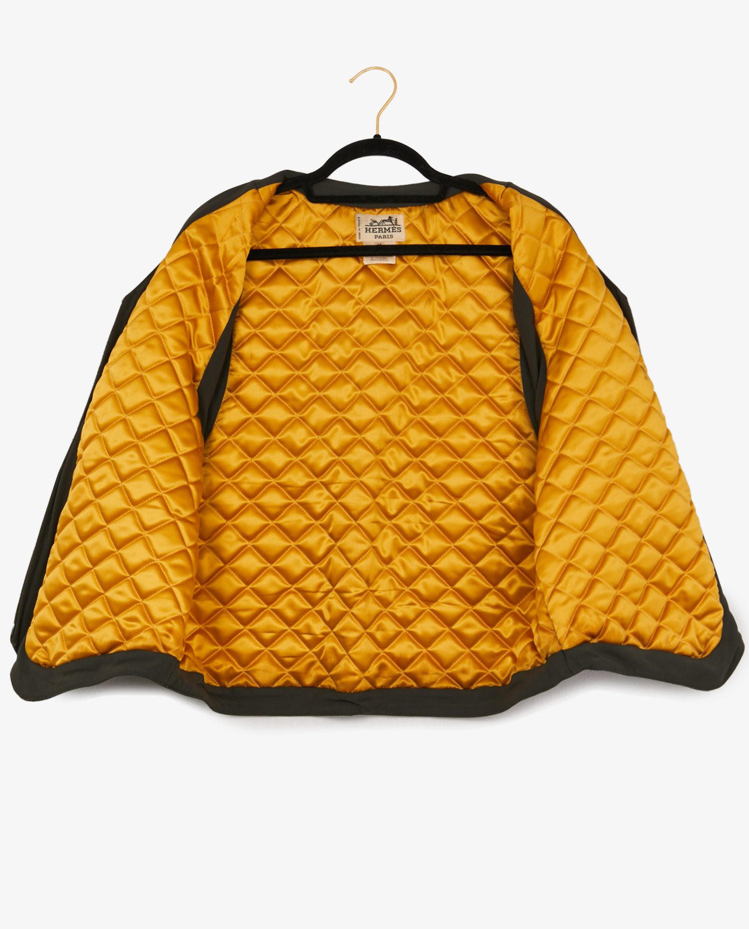 Vintage Hermès sleeveless jacket in khaki canvas. The lining is quilted in neon yellow. Zipper closure. Size 54. In very good condition.