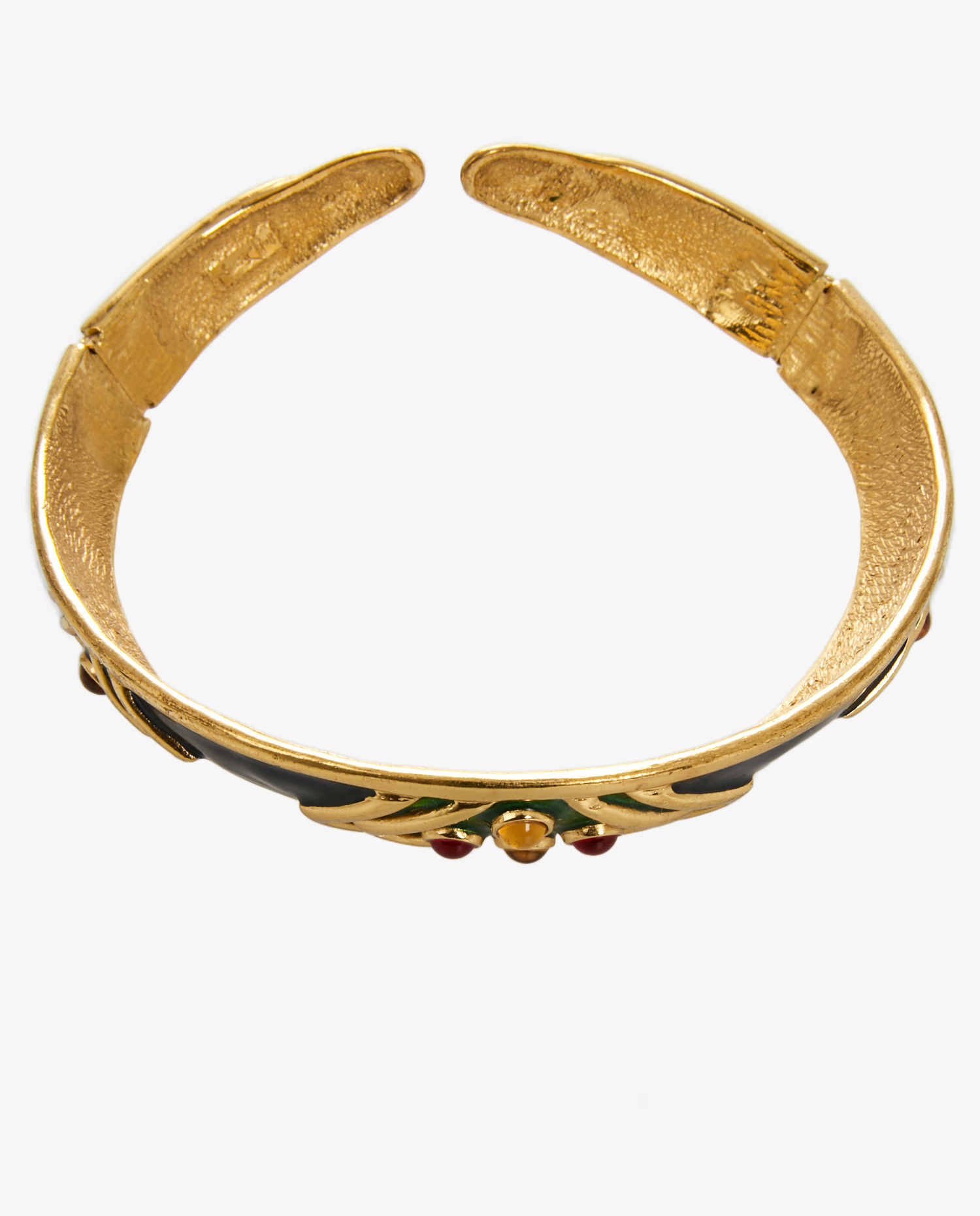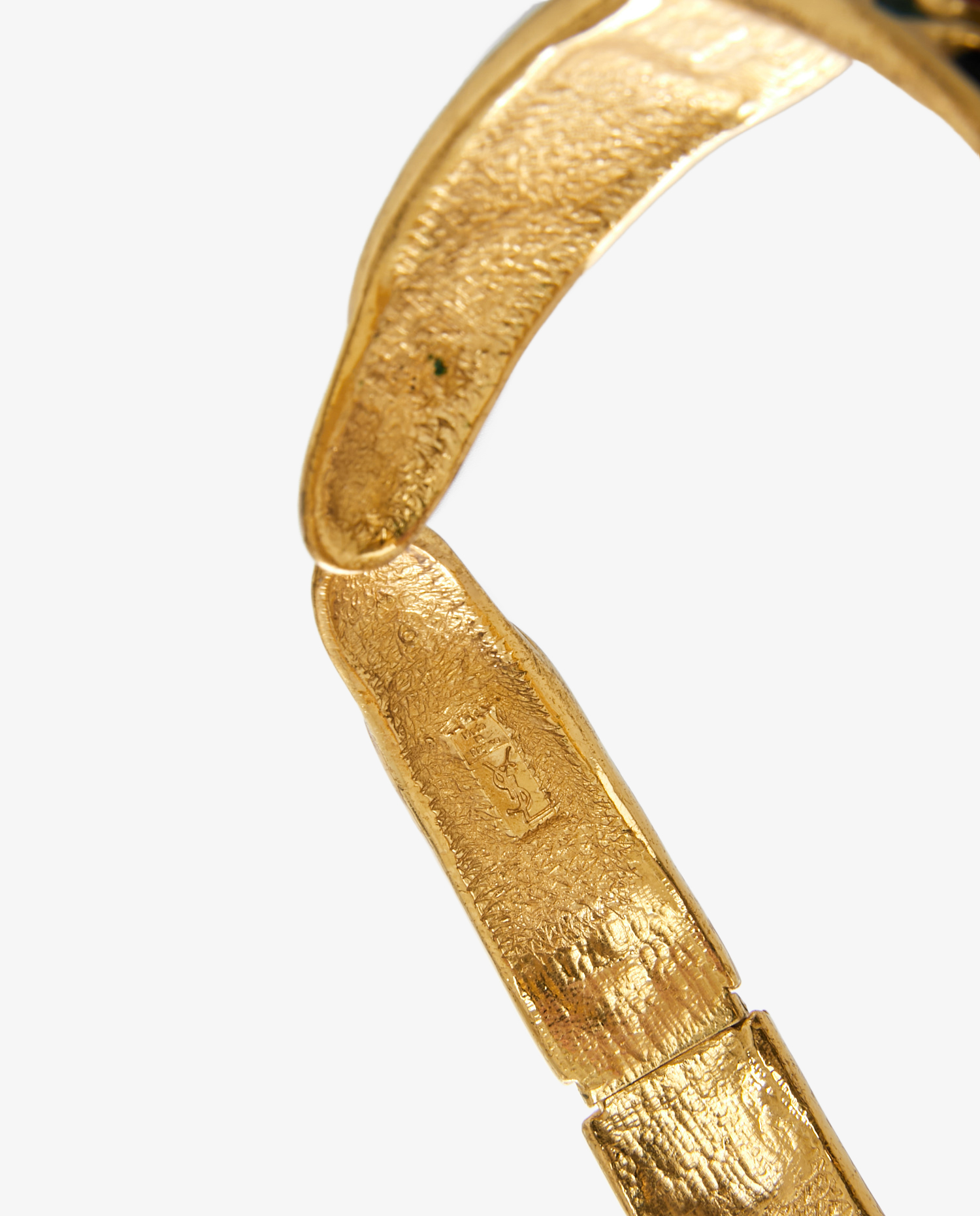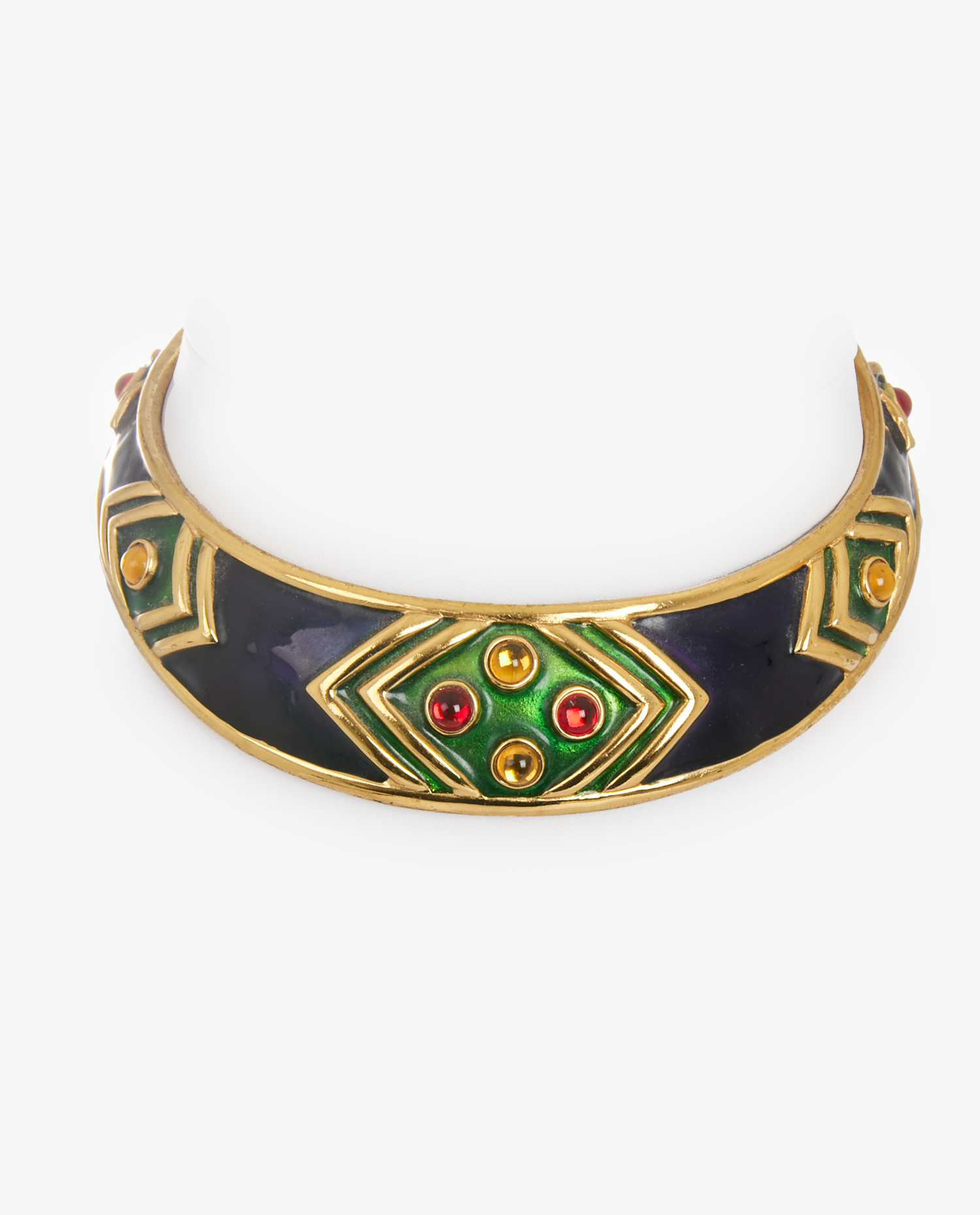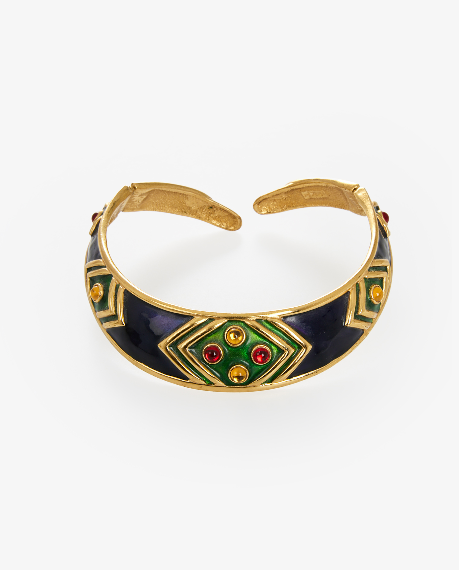 Vintage Yves Saint Laurent torque in navy blue, yellow and red gold-plated metal. Neck size 40cm. In very good condition.
