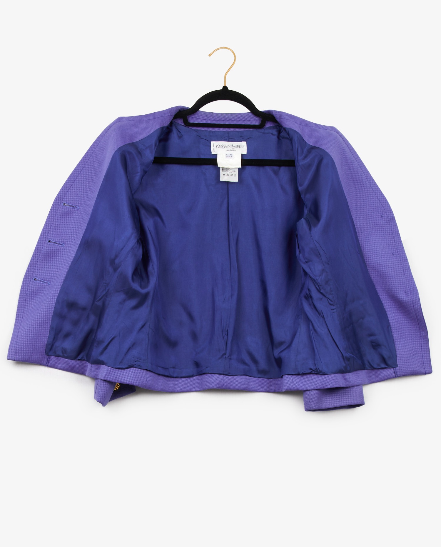 Vintage 90s Yves Saint Laurent jacket in purple wool. Epaulettes. Cinched at the waist. In very good condition. Small snag on upper right front (see photos).