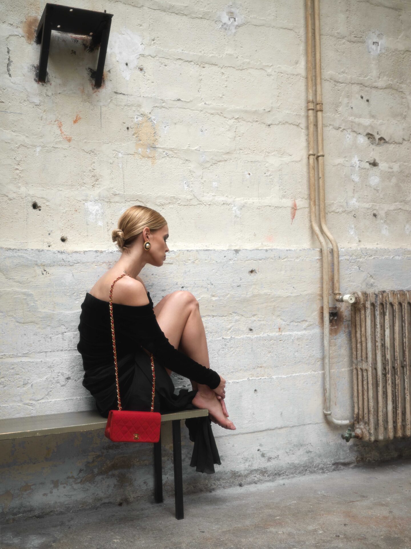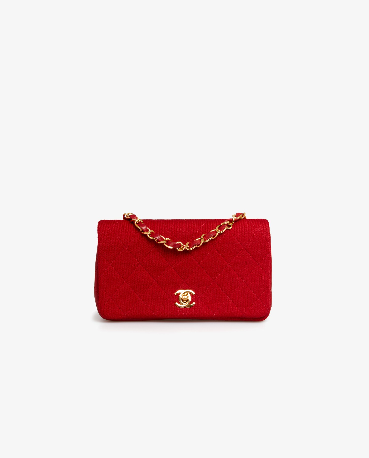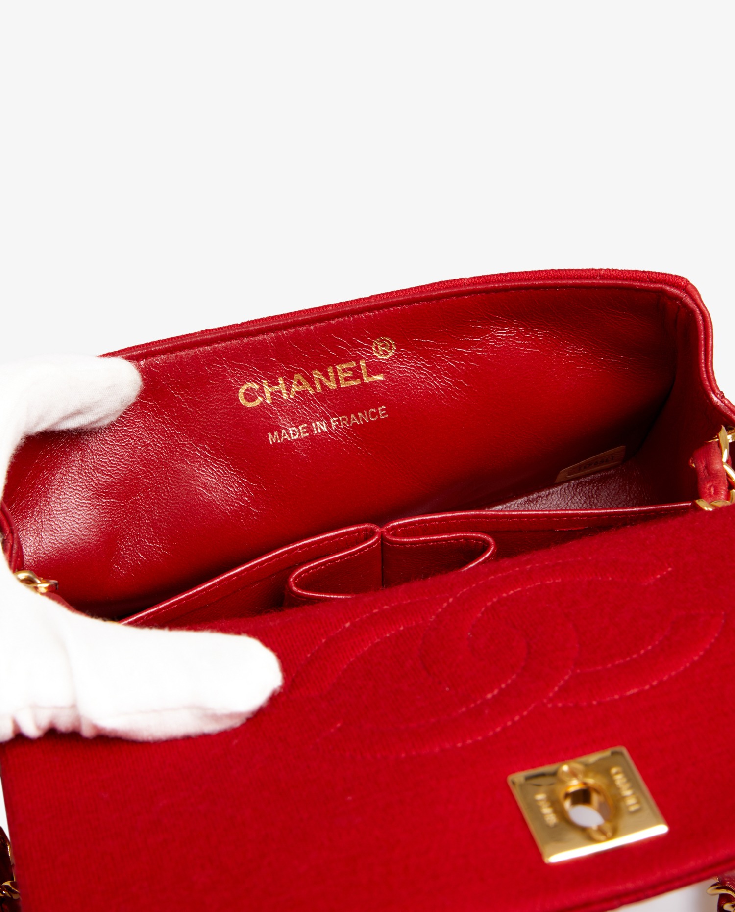 Vintage Chanel WOC bag in bi-material, fabric and red lambskin leather. It can be worn on the hand, shoulder or crossbody. The shoulder strap measures 108cm. In very good condition.