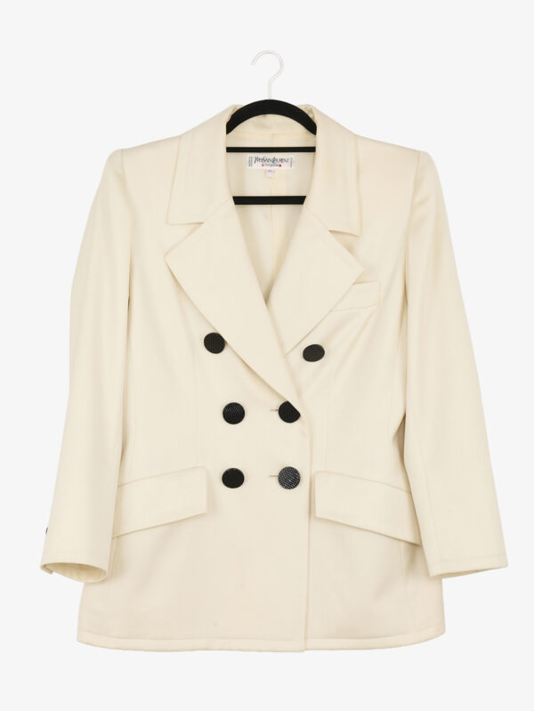 Cet ensemble Yves Saint Laurent vintage en coloris crème, taille 42, se compose d’une veste tailleur croisée et d’une jupe droite assortie. La veste présente une coupe structurée avec revers larges et fermeture double boutonnage ornée de boutons noirs texturés contrastants. La jupe, de ligne droite légèrement ajustée, complète l’ensemble avec sobriété. La teinte crème apporte luminosité et douceur, tandis que le contraste des boutons noirs souligne l’esthétique graphique propre au vestiaire YSL.