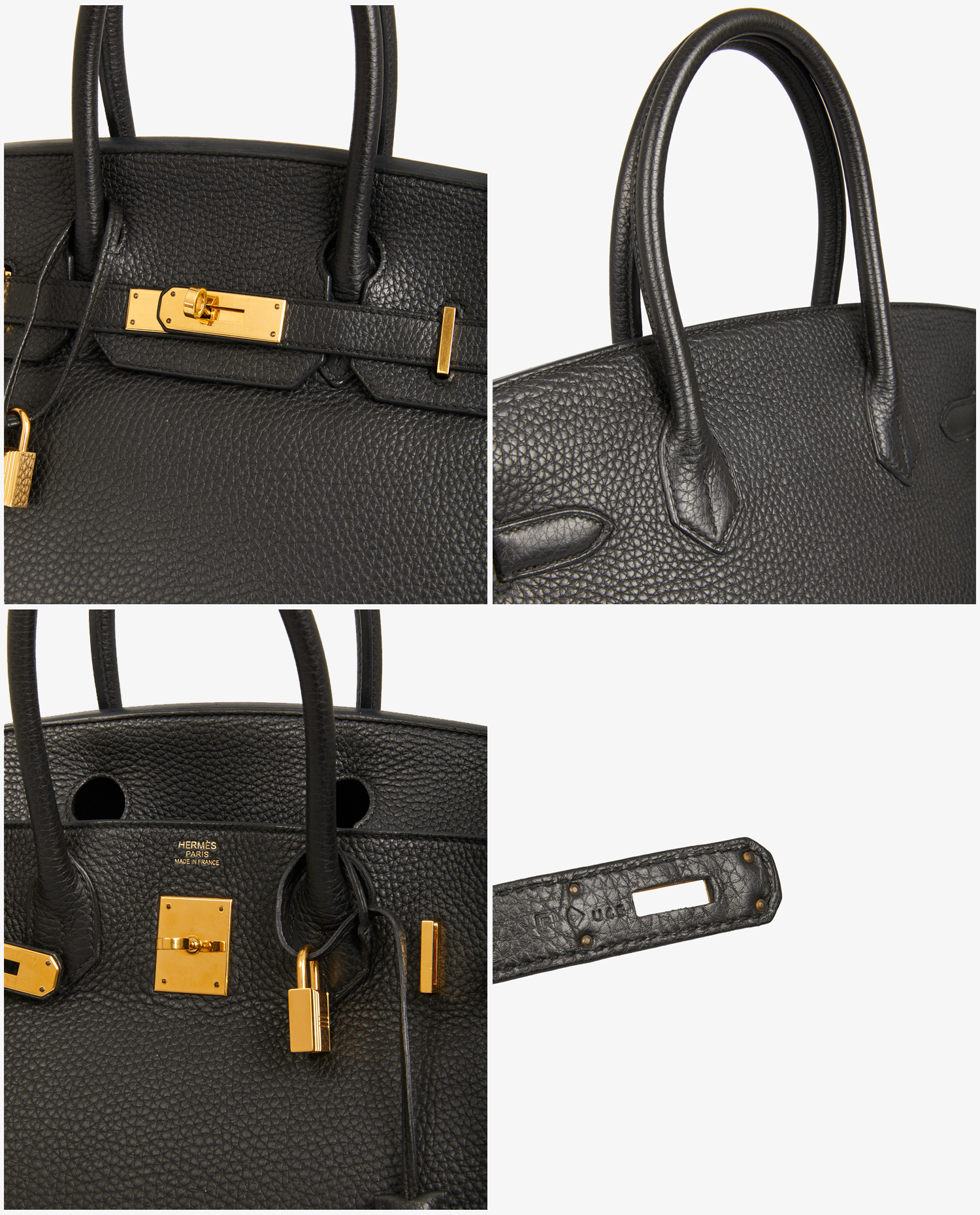 Birkin 30 Hermès cuir taurillon clémence noir. Bijouterie dorée. Tirette, clochette, cadenas et clefs. En très bon état.