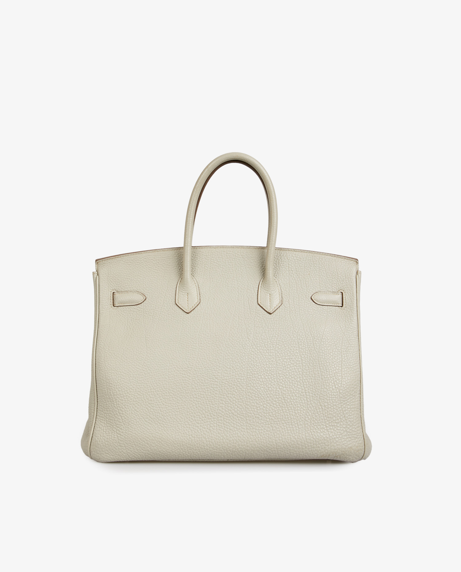 Né en 1984 de la rencontre entre Jane Birkin et Jean-Louis Dumas, le Birkin est rapidement devenu une icône de la maroquinerie Hermès. Sa conception pensée pour être à la fois pratique, spacieux et sophistiqué en fait un modèle convoité dès ses premières années. Le format 35 cm est le plus polyvalent de la ligne, adapté aussi bien à un usage quotidien qu’à des occasions plus formelles. Le cuir Togo, introduit dans les années 90, est rapidement devenu un standard de la maison pour sa légèreté, sa capacité à conserver sa forme et sa texture naturellement élégante. Le coloris Gris Neve, confidentiel et rarement proposé, ajoute à ce modèle une valeur singulière recherchée par les collectionneurs.