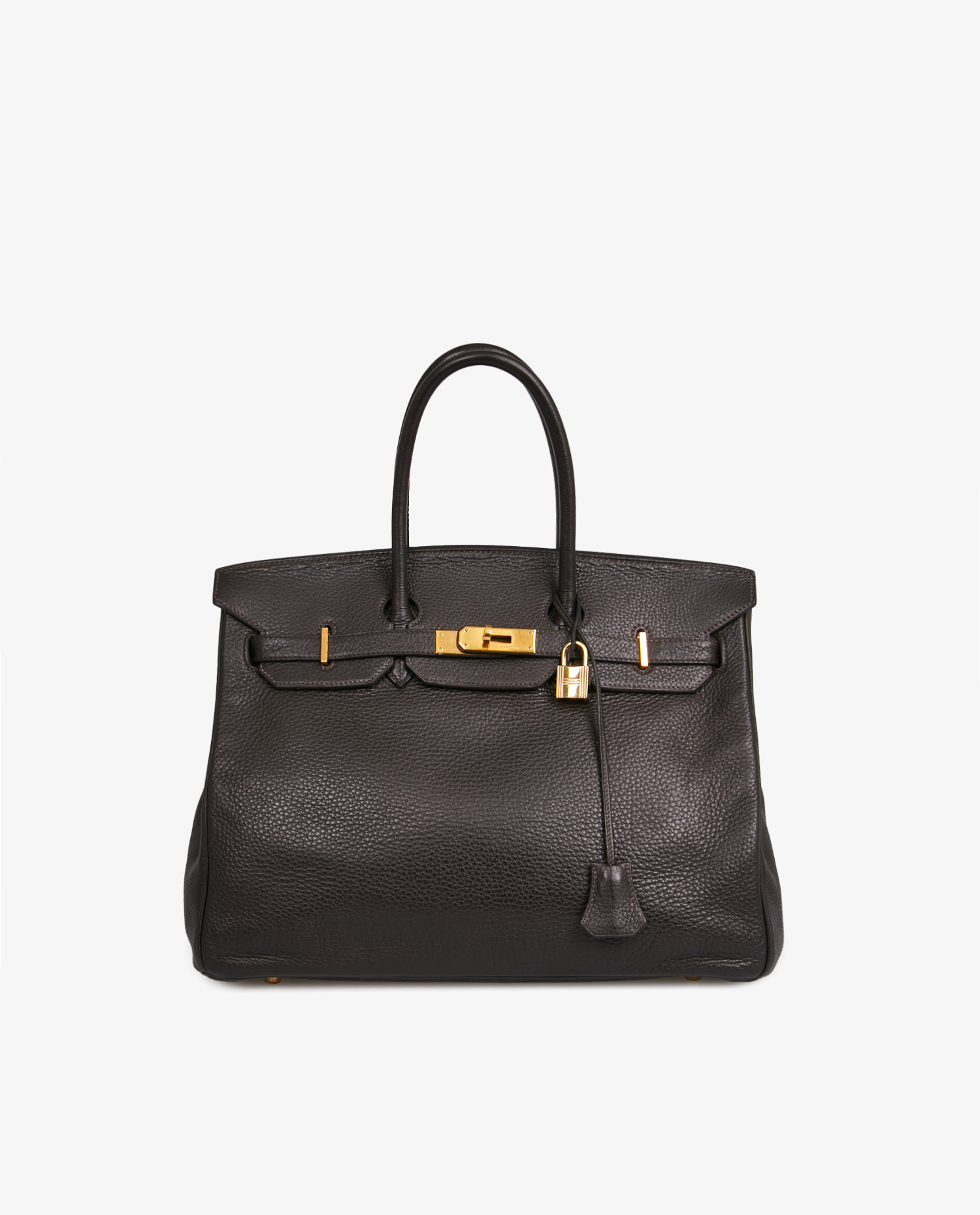 Le cuir Togo marron foncé offre une texture dense et régulière, avec un grain marqué et souple au toucher. Cette nuance de brun profond, ni trop chaude ni trop froide, capte la lumière avec subtilité et s’accorde avec une grande variété de tenues. Les finitions en métal doré brillant (GHW) — fermoir, cadenas, pieds de sac, éléments de sanglons — sont éclatantes et sans oxydation. Les anses rigides permettent un porté main structuré. Le sac repose sur quatre pieds métalliques assurant sa stabilité.
