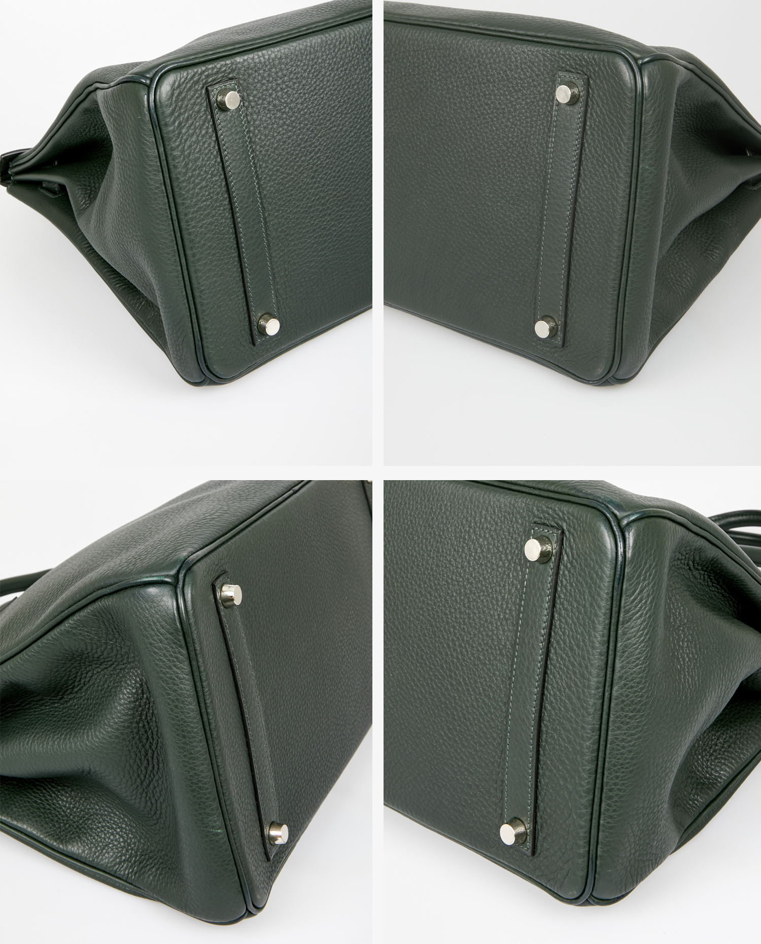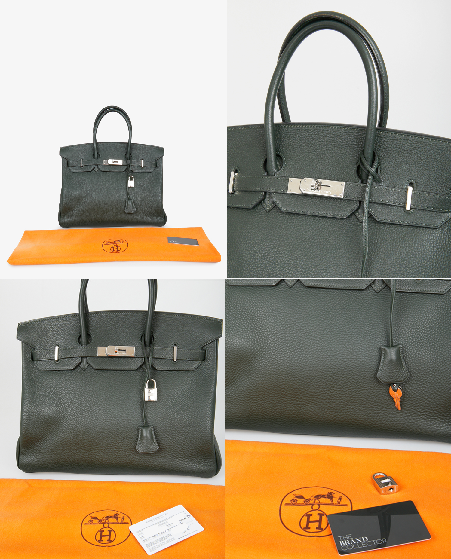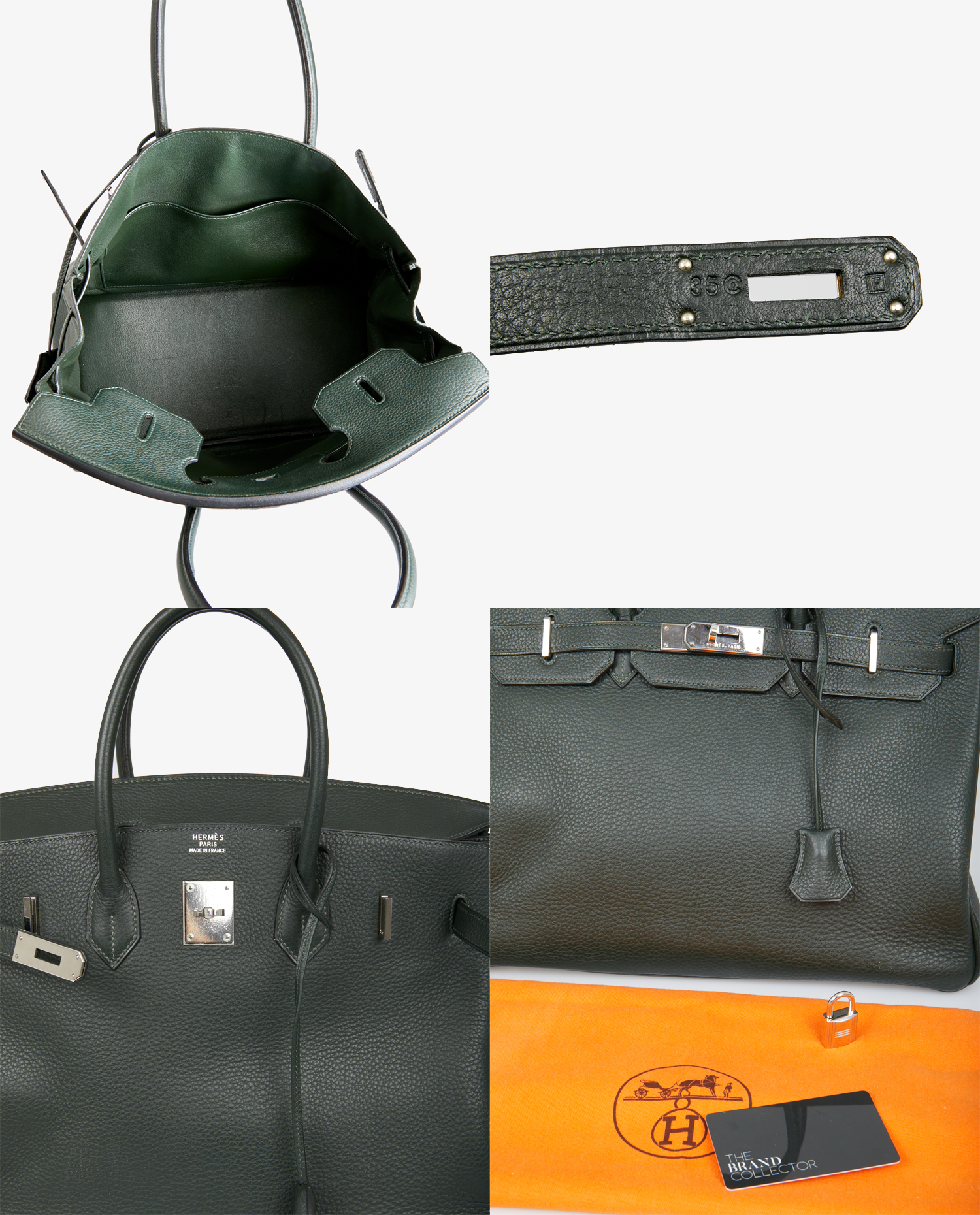 Sac Birkin 35 Hermès cuir togo vert sapin. Bijouterie argent. Tirette, clochette, cadenas et clefs. Lettre F dans un carré, 2002. En très bon état. Légères marques d’usure sur la bijouterie. Voir photos.