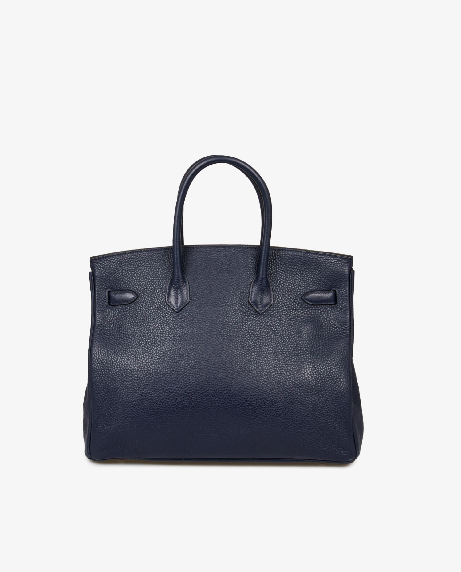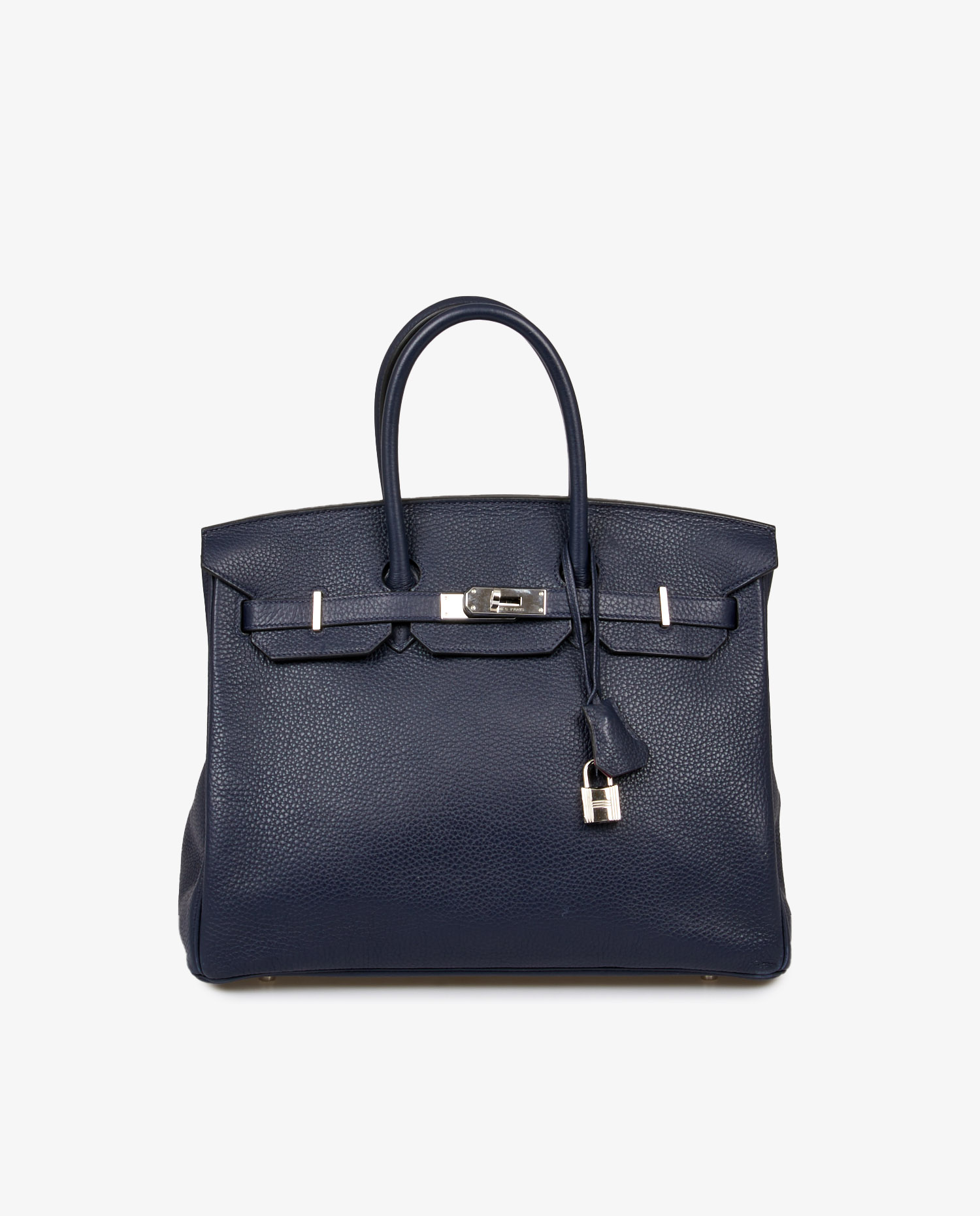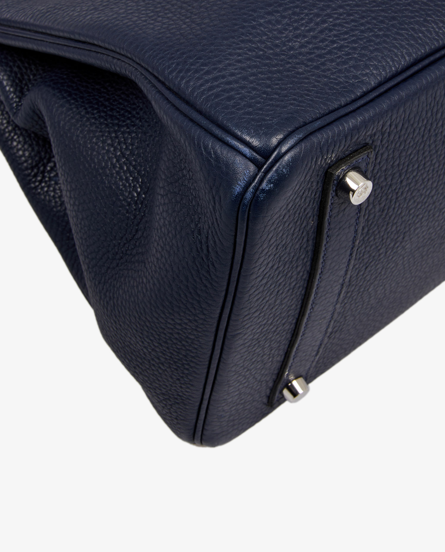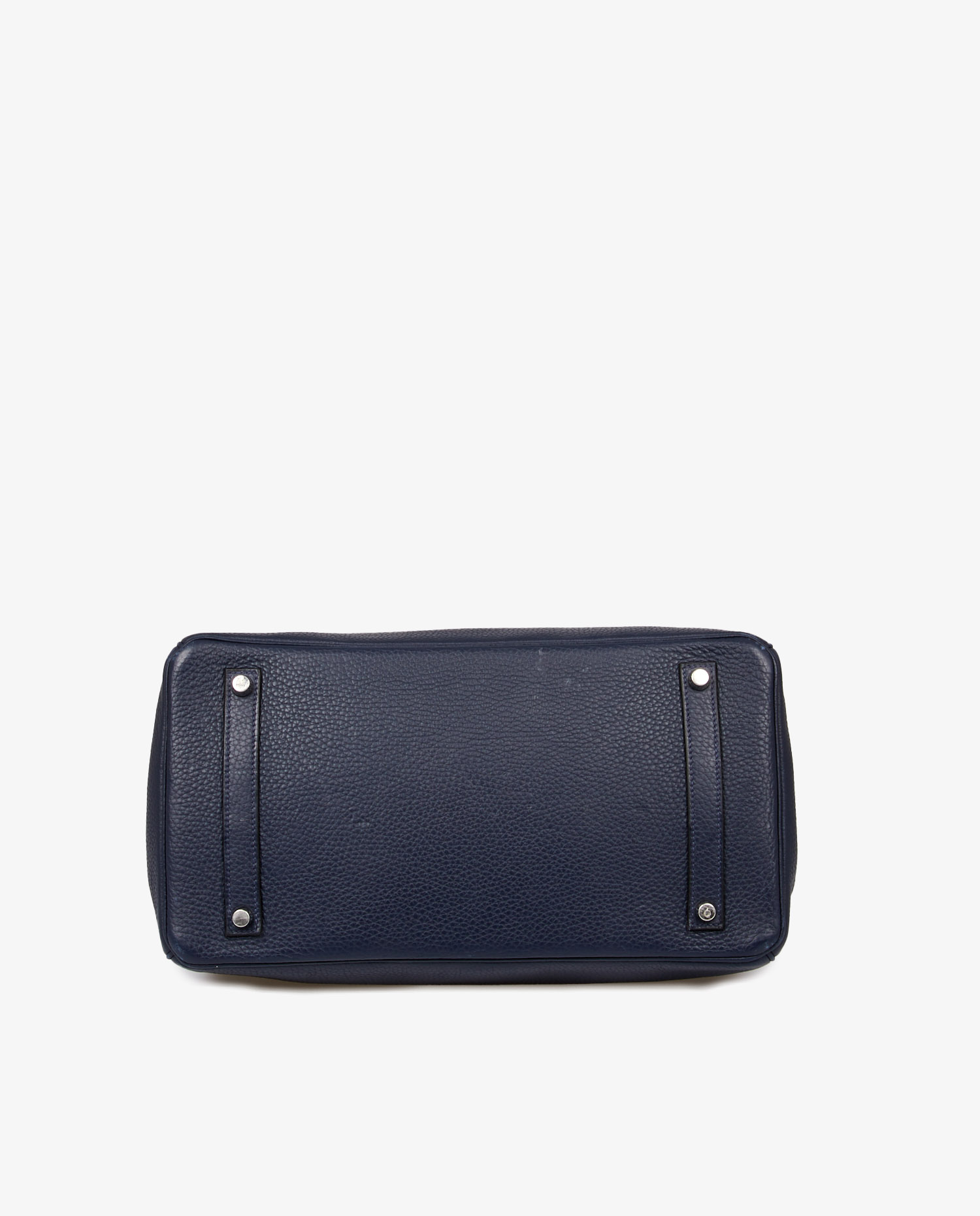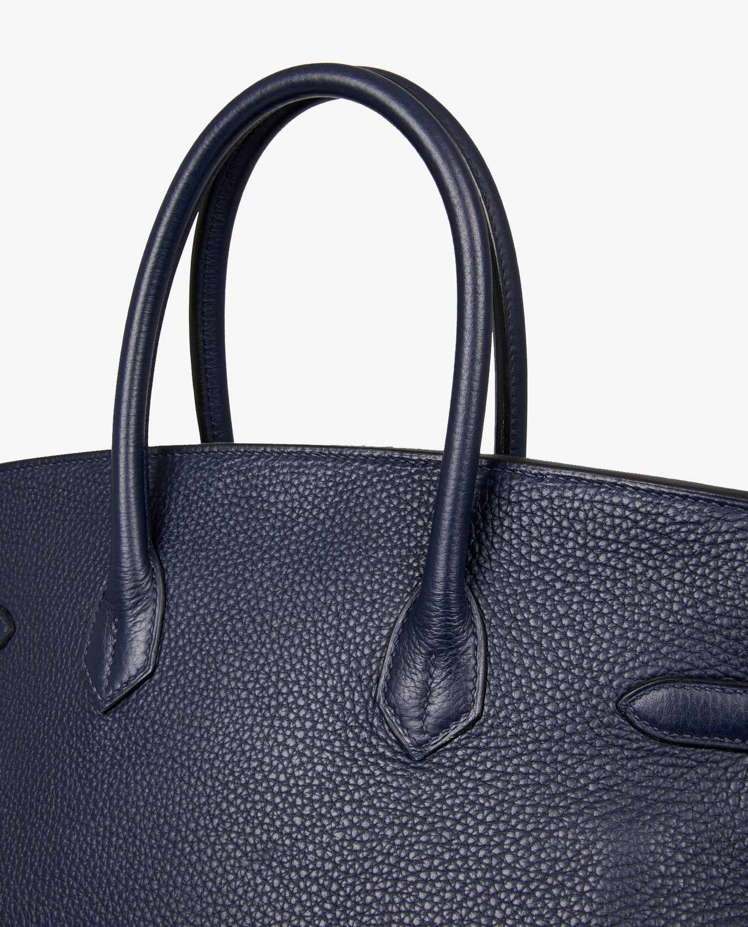 Birkin 35 Hermès togo bleu marine et intérieur rose fuschia. Bijouterie argent. Tirette, clochette, cadenas et clefs. Porté main. En très bon état.