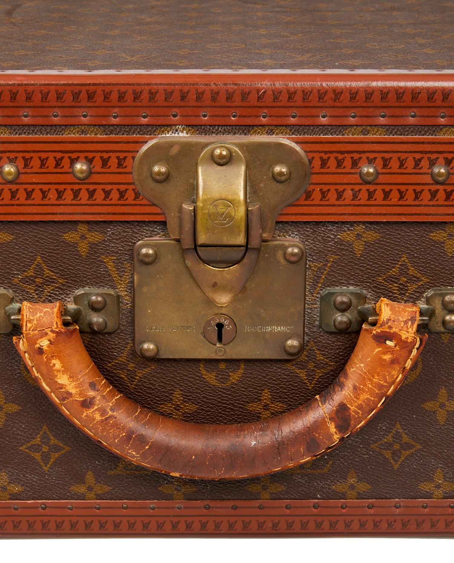 Superbe malle d’occasion, Bisten 70 LOUIS VUITTON est en toile Monogramme. L’accastillage est en métal doré. La doublure est en toile sur deux étages (avec sangles de maintien). (petites taches sur la toile). Elle se porte à la main grâce à sa poignée arrondie en cuir de vachette gold. La serrure “S” Louis Vuitton (avec deux clés) est renforcée par deux loquets complémentaires pour pouvoir la fermer en toute sécurité. Les bordures sont en cuir Monogram avec un renforcement de rivets et angles en métal doré. Une Inscription d’initiales dorée “D.B” se trouve sous la serrure. Il a le Porte étiquette d’adresse. Cette valise est en très bon état d’usage (marques et griffures d’usure sur la toile, et métallerie vieillie par le temps)