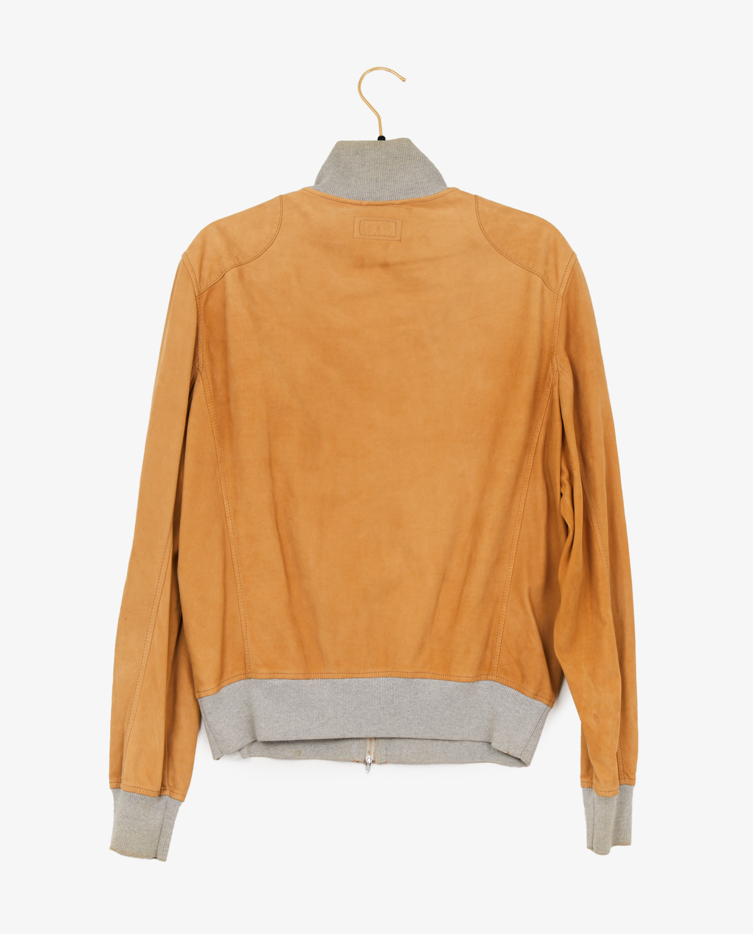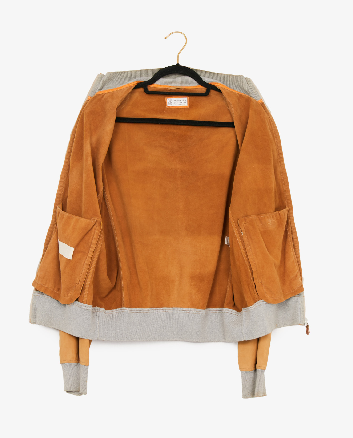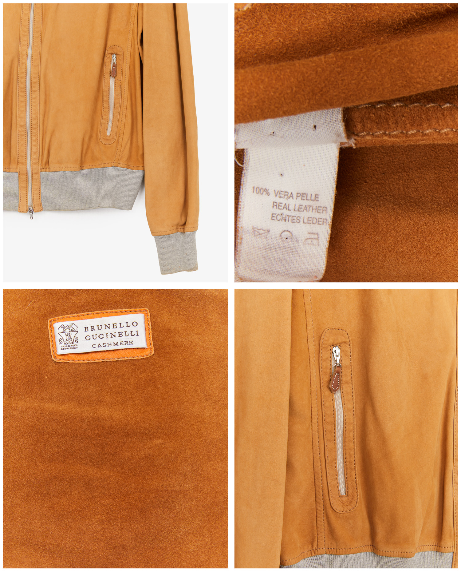 Blouson en suède beige Brunello Cucinelli. Fermeture zippée. Col, poignées et la taille sont en coton gris clair. Taille 48. Deux poches zippées. Elle est cintrée à la taille et aux manches. Taille 48. En très bon état.