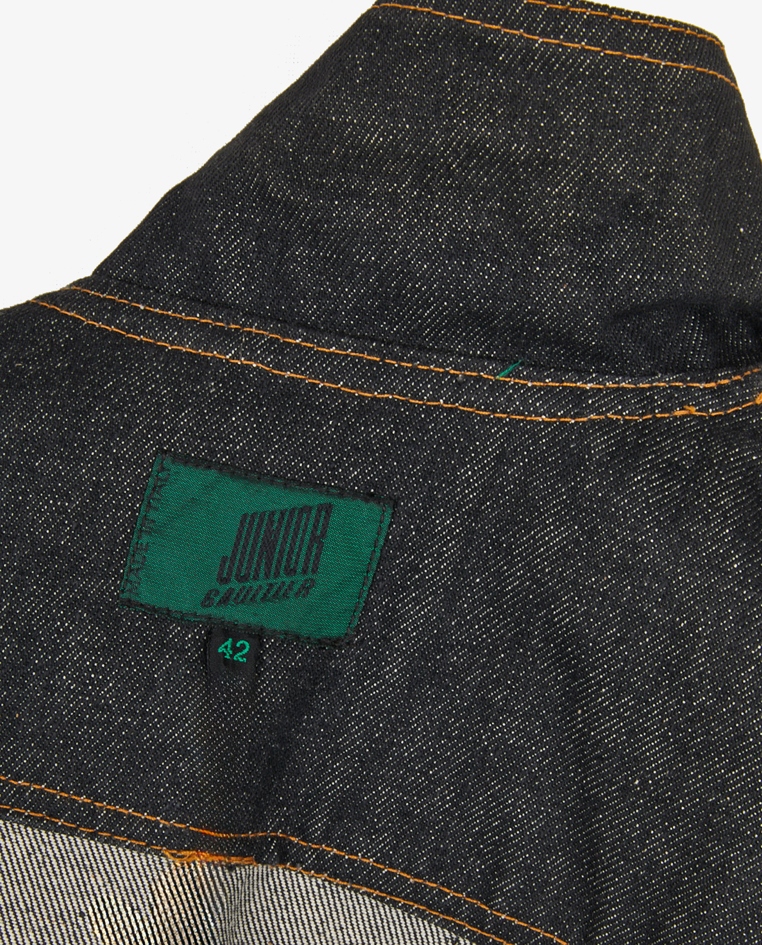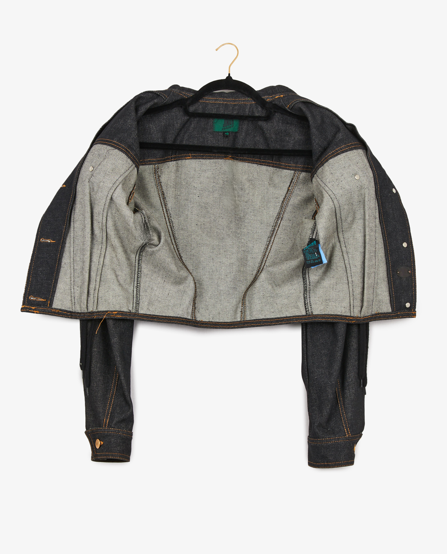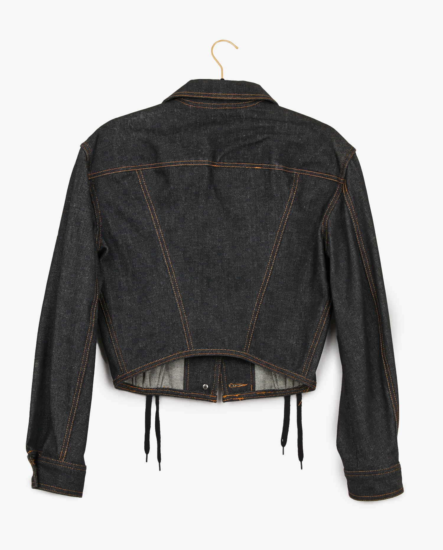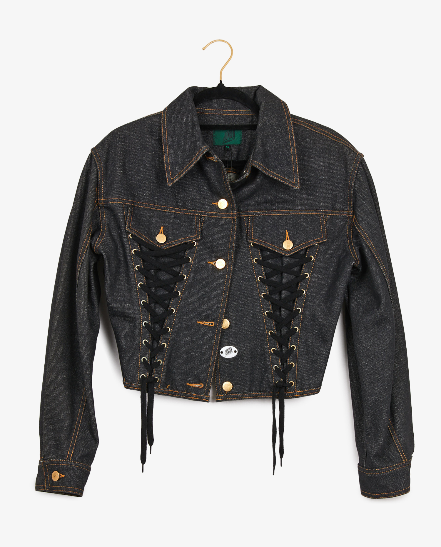 Blouson en denim Jean Paul Gaultier. Laçages à l’avant. Fermeture boutonnée. Taille 42. En très bon état.
