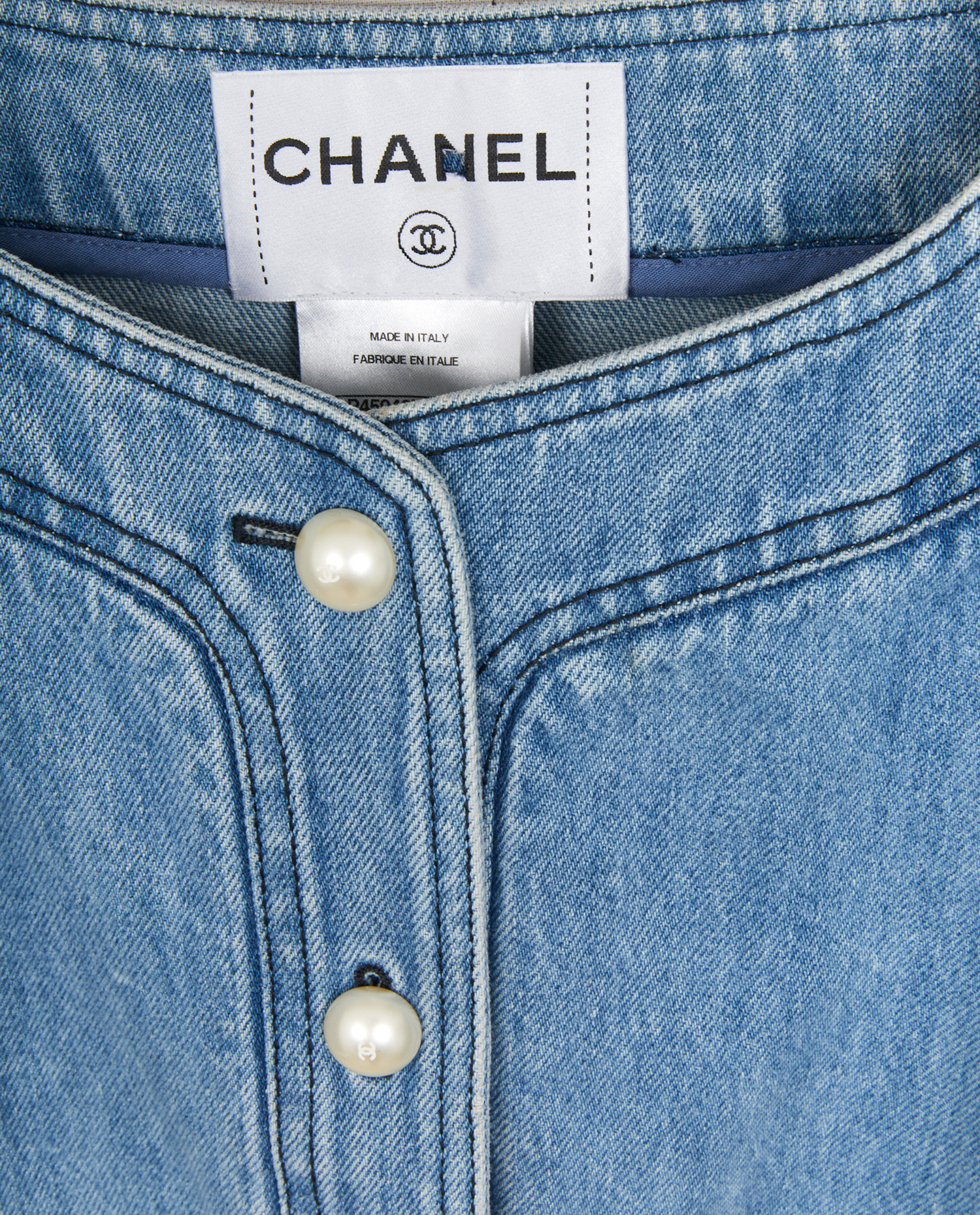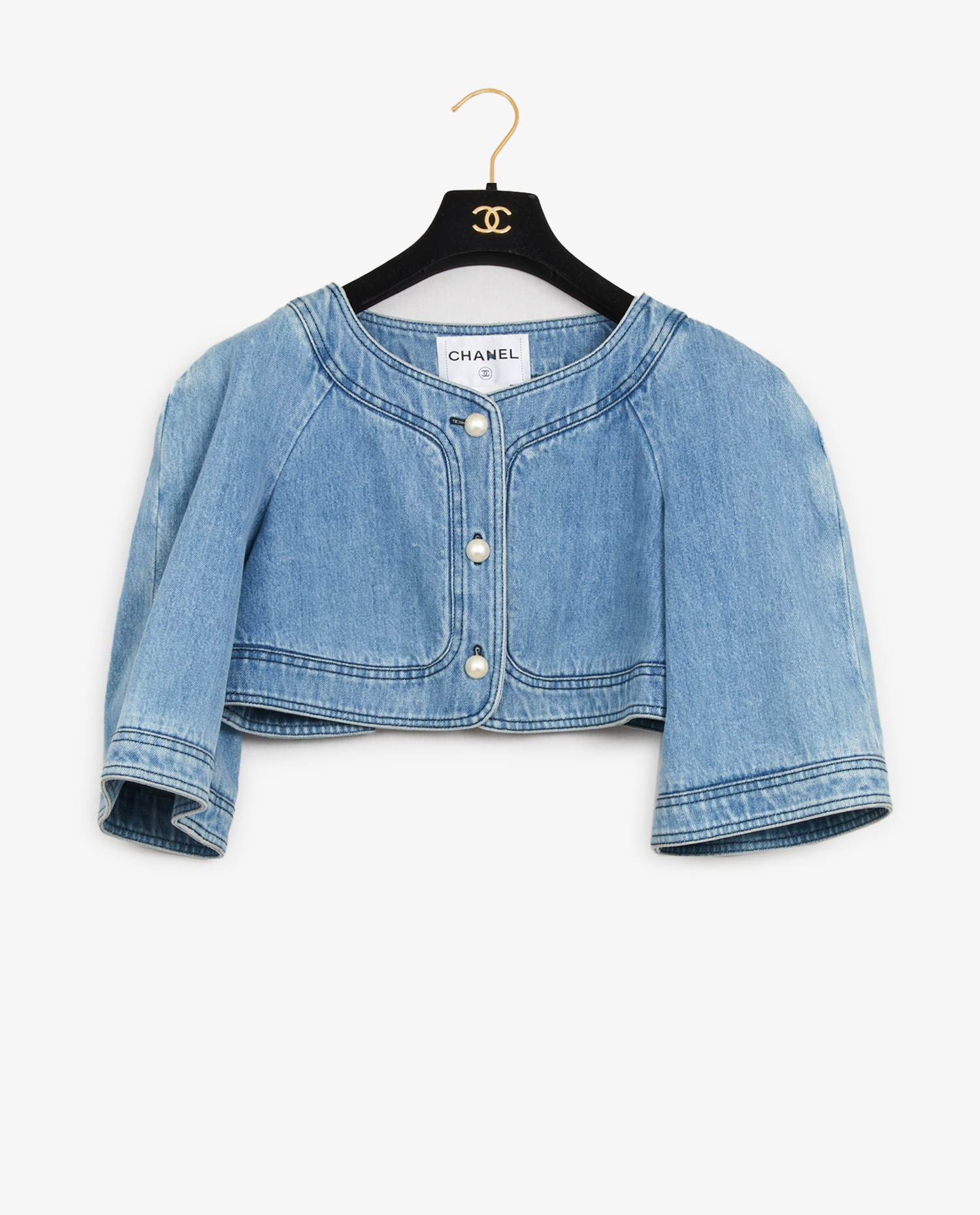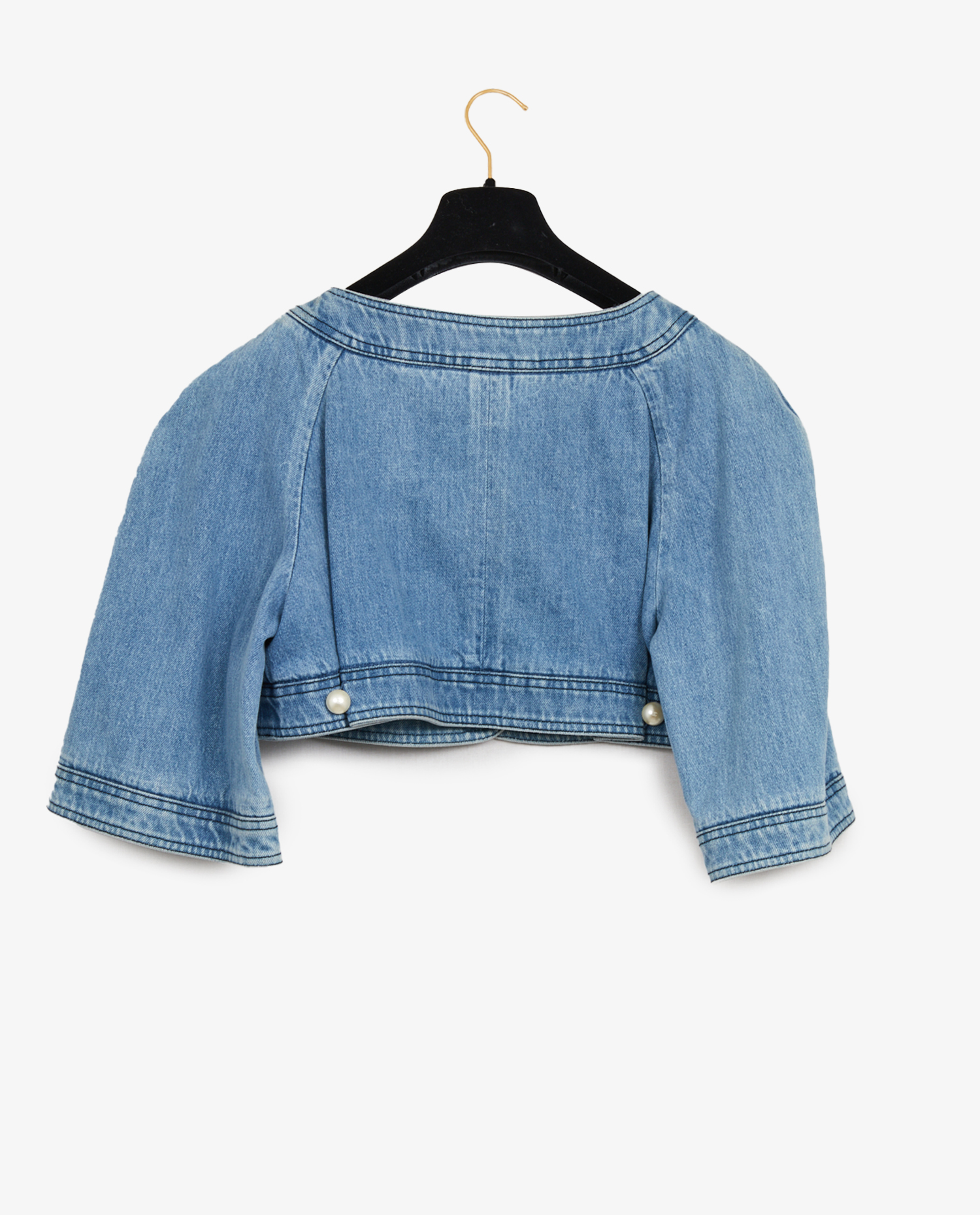 Bolero Chanel en denim bleu. Taille 36. Boutons perles siglés CC. Manches 3/4. En très bon état.
