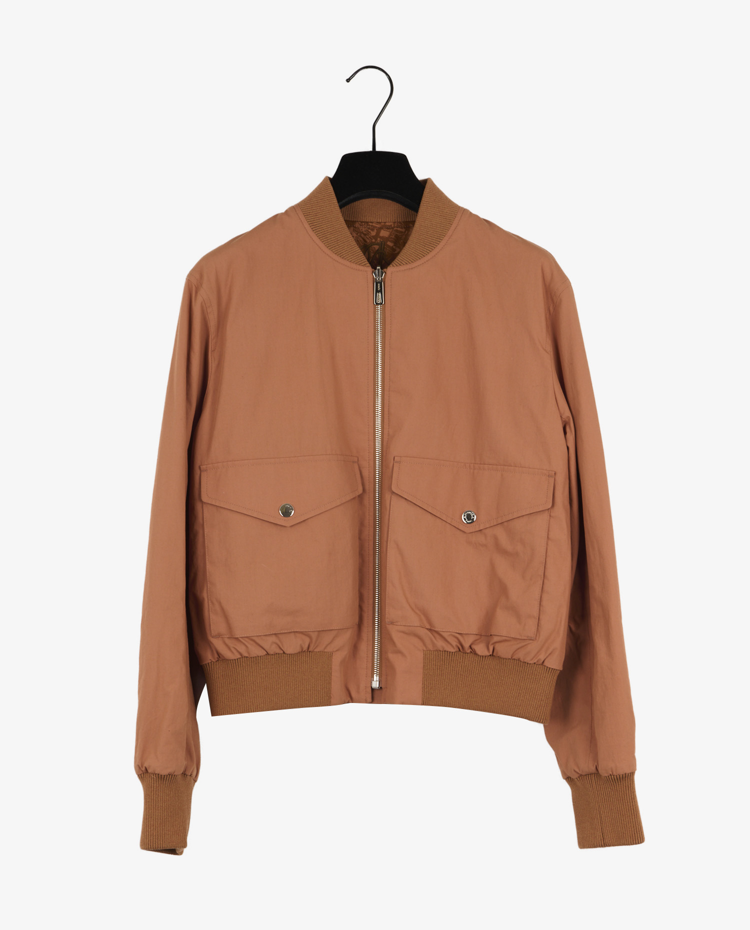 Sur la face unie, le bomber présente une surface lisse en toile camel avec deux poches plaquées à rabat fermé par bouton pression, un col rond tricoté et une fermeture éclair centrale en métal argenté. La coupe légèrement resserrée à la taille et aux poignets grâce à des bords-côtes en maille assure une silhouette nette. Les dimensions compactes en font une pièce facile à intégrer à des tenues casual ou plus élaborées.