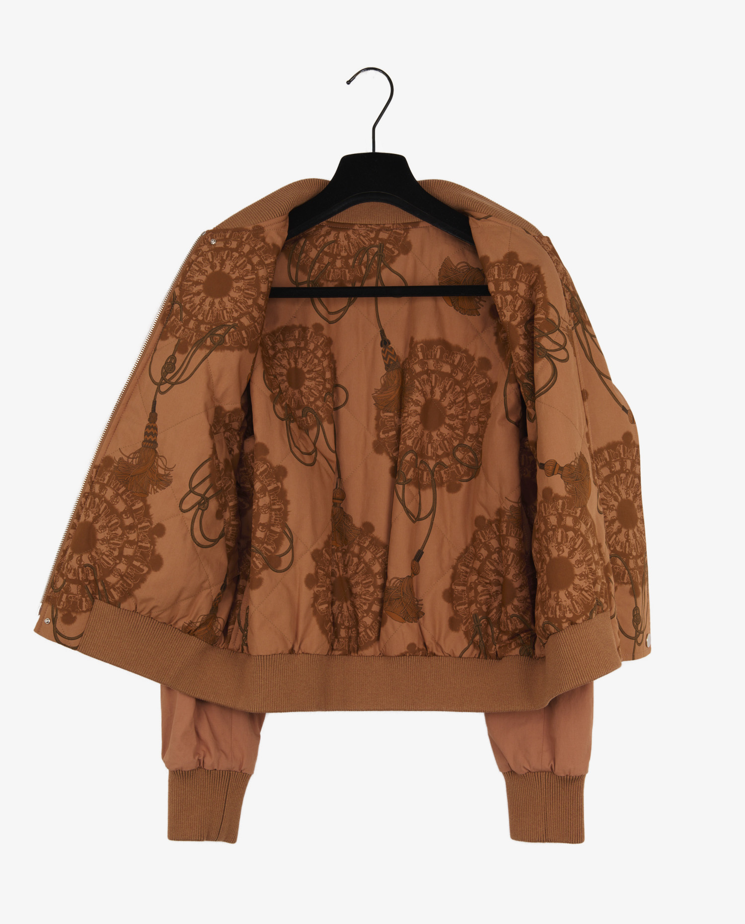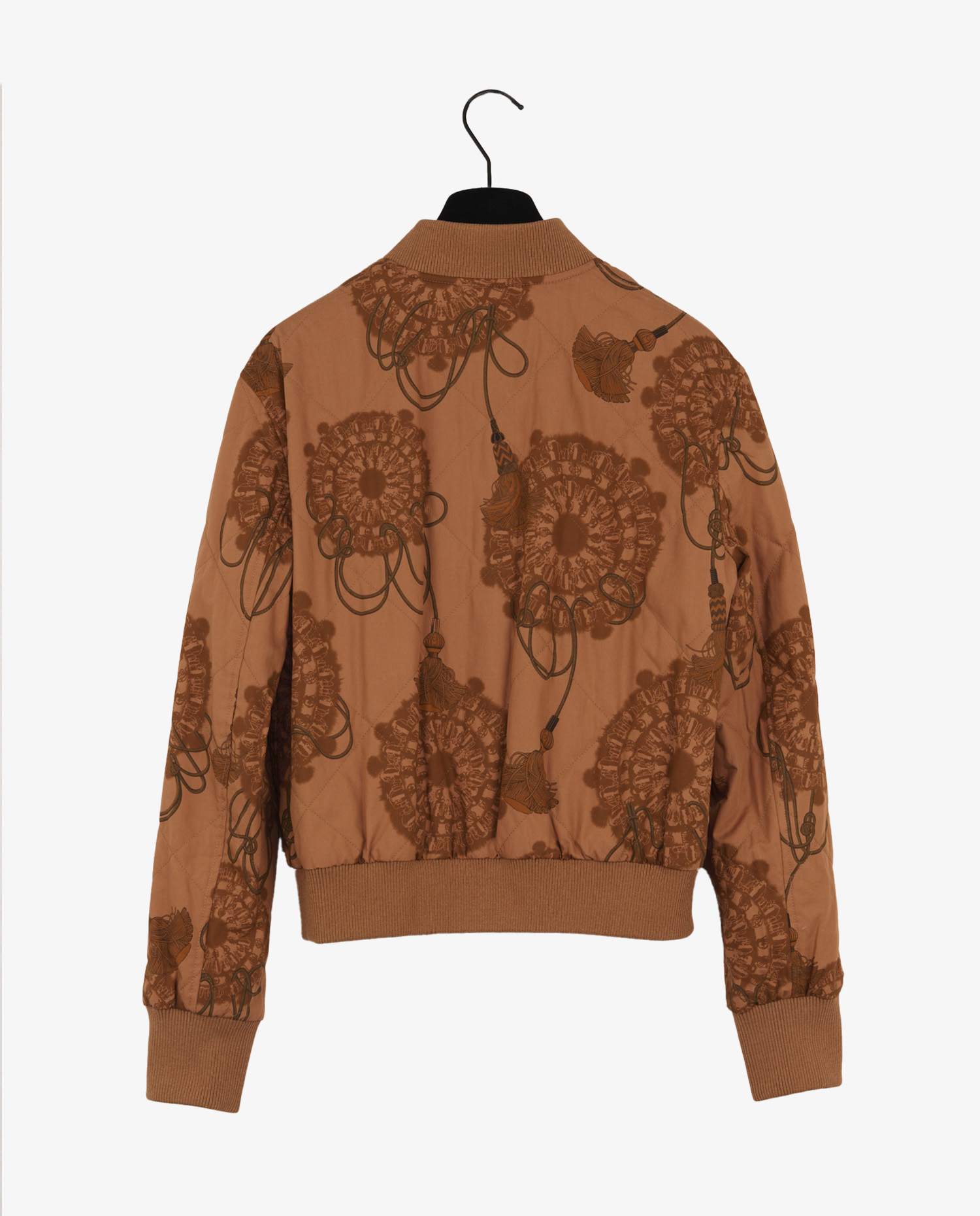 Le revers du bomber dévoile un tissu orné d’un imprimé à motifs floraux et cordages inspiré de l’univers sellier d’Hermès, dans une harmonie de bruns. L’intérieur matelassé assure un confort thermique tout en mettant en valeur l’aspect graphique. Le tissu, probablement un mélange de coton et de fibres synthétiques, confère structure et souplesse à la veste.