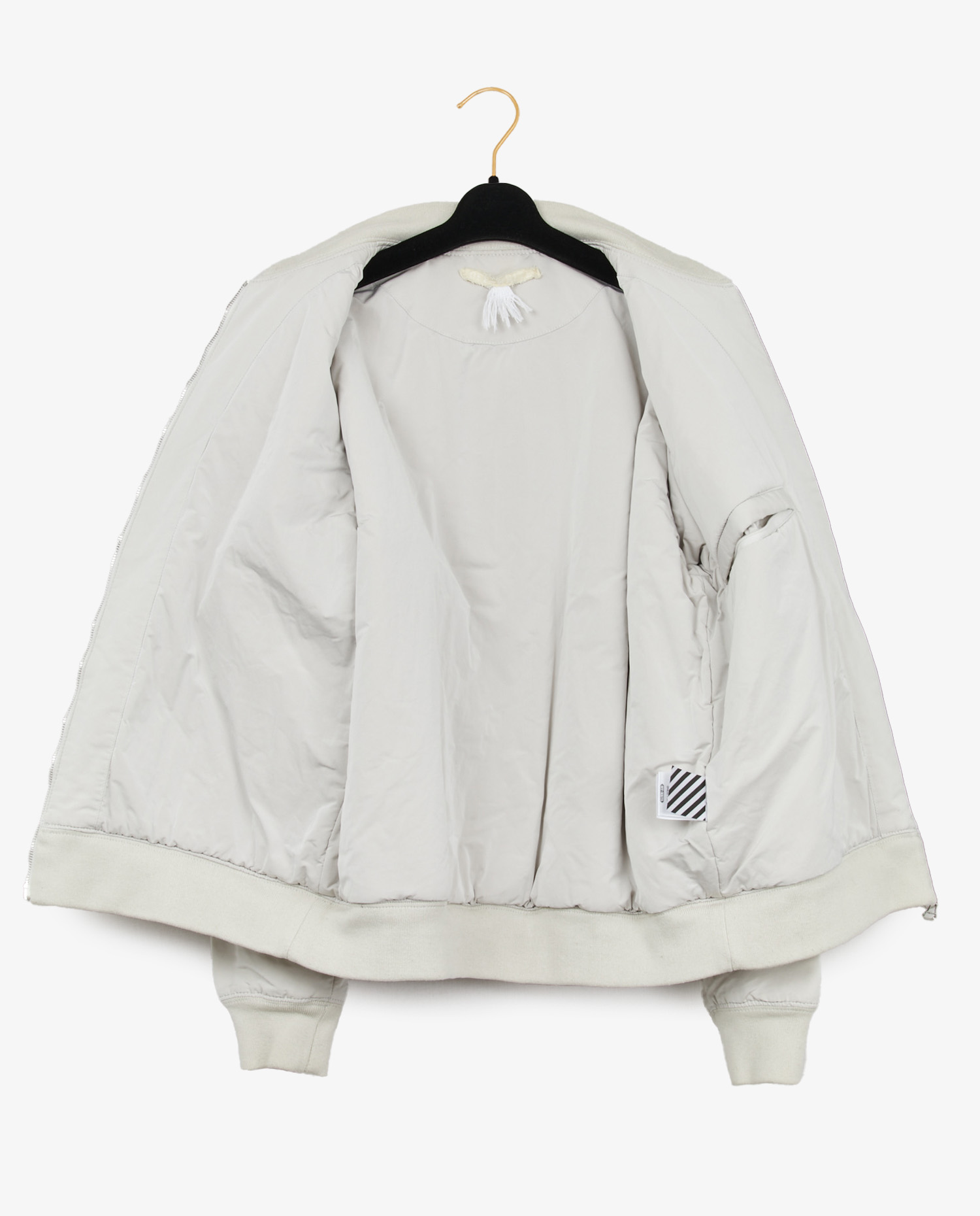 L’intérieur est doublé d’un textile synthétique ton sur ton, légèrement matelassé pour plus de confort. On retrouve une poche intérieure zippée côté droit, discrète mais fonctionnelle. L’étiquette intérieure à bandes diagonales noires sur fond blanc est typique des productions OFF-WHITE européennes. Le col est orné du lien en corde blanche nouée, signature discrète de certaines collections de la marque.