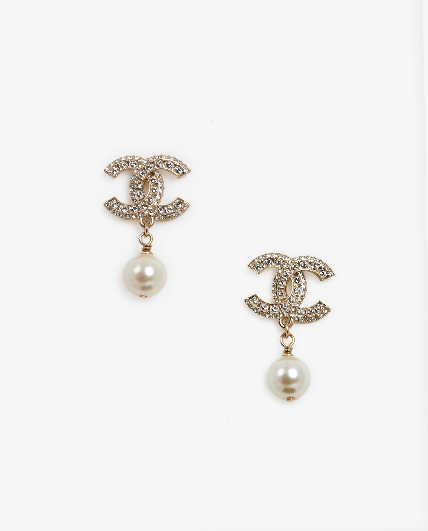 Clous pendants Chanel en métal or pâle, perle et strass. Collection Automne 2018. Jamais porté.