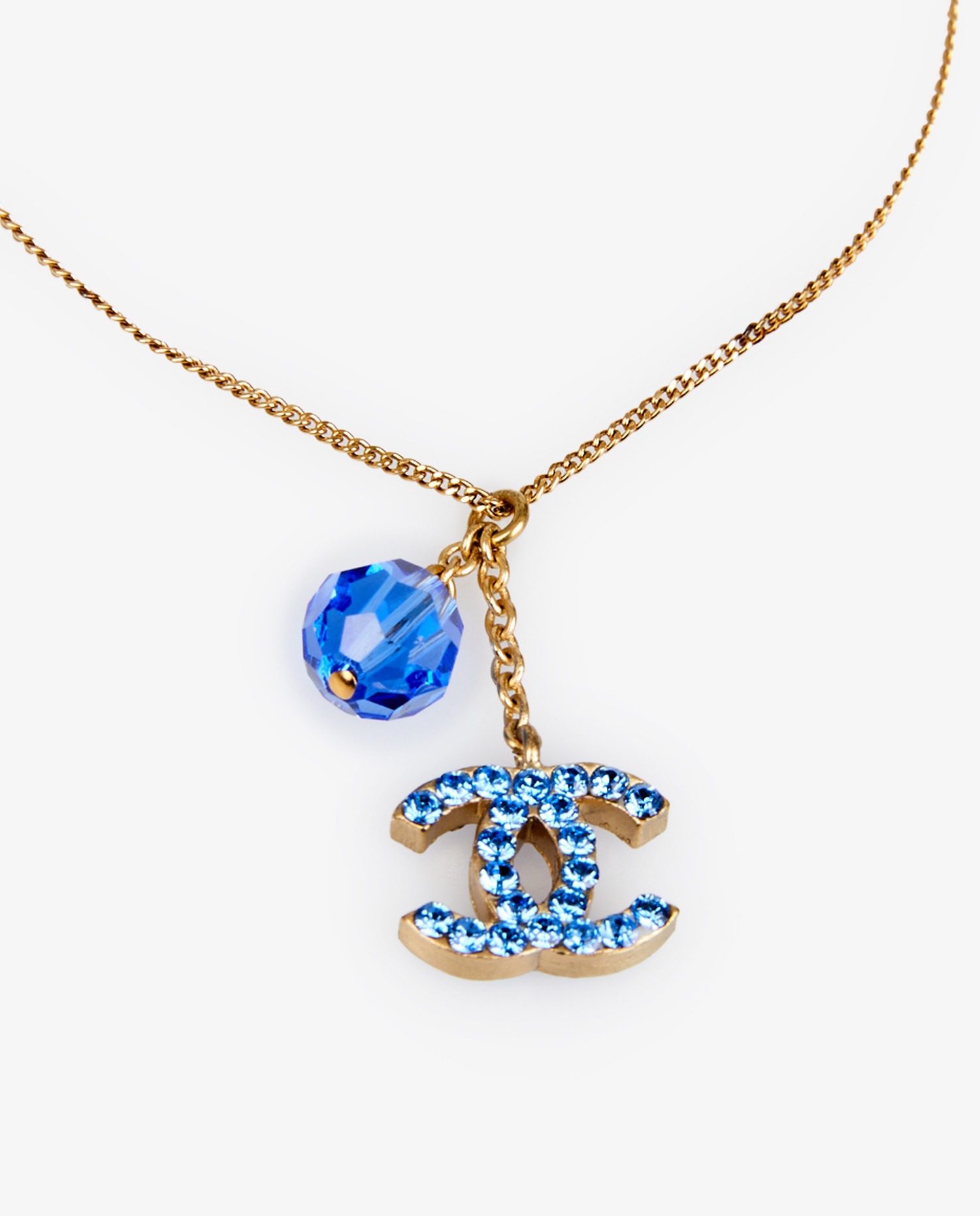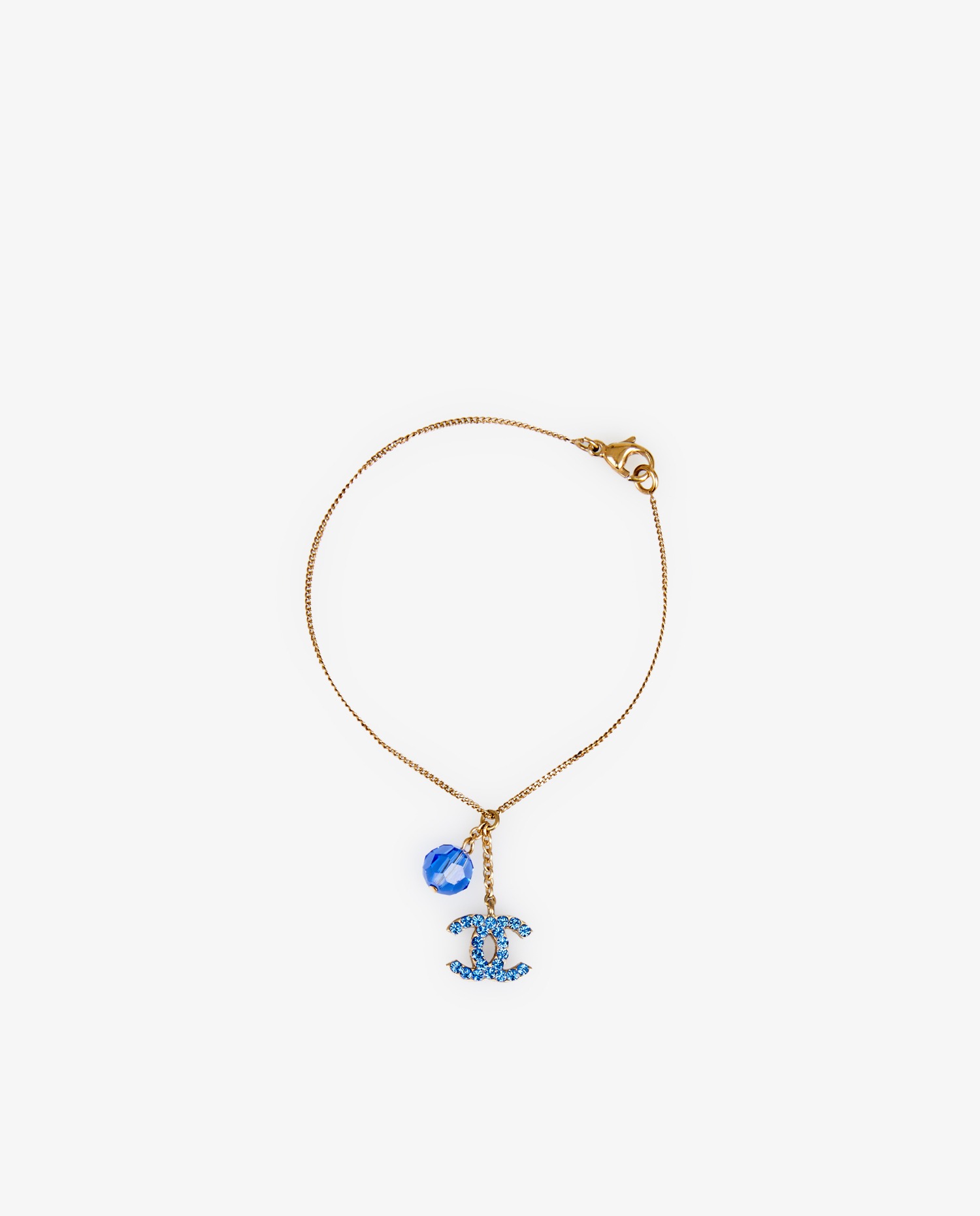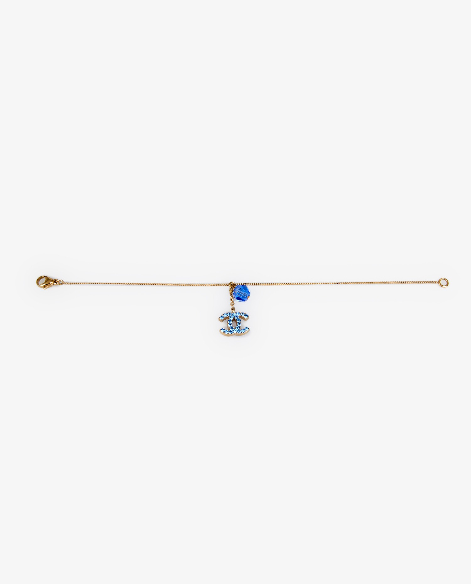 Bracelet Chanel chaine dorée, CC strass bleu. En très bon état.