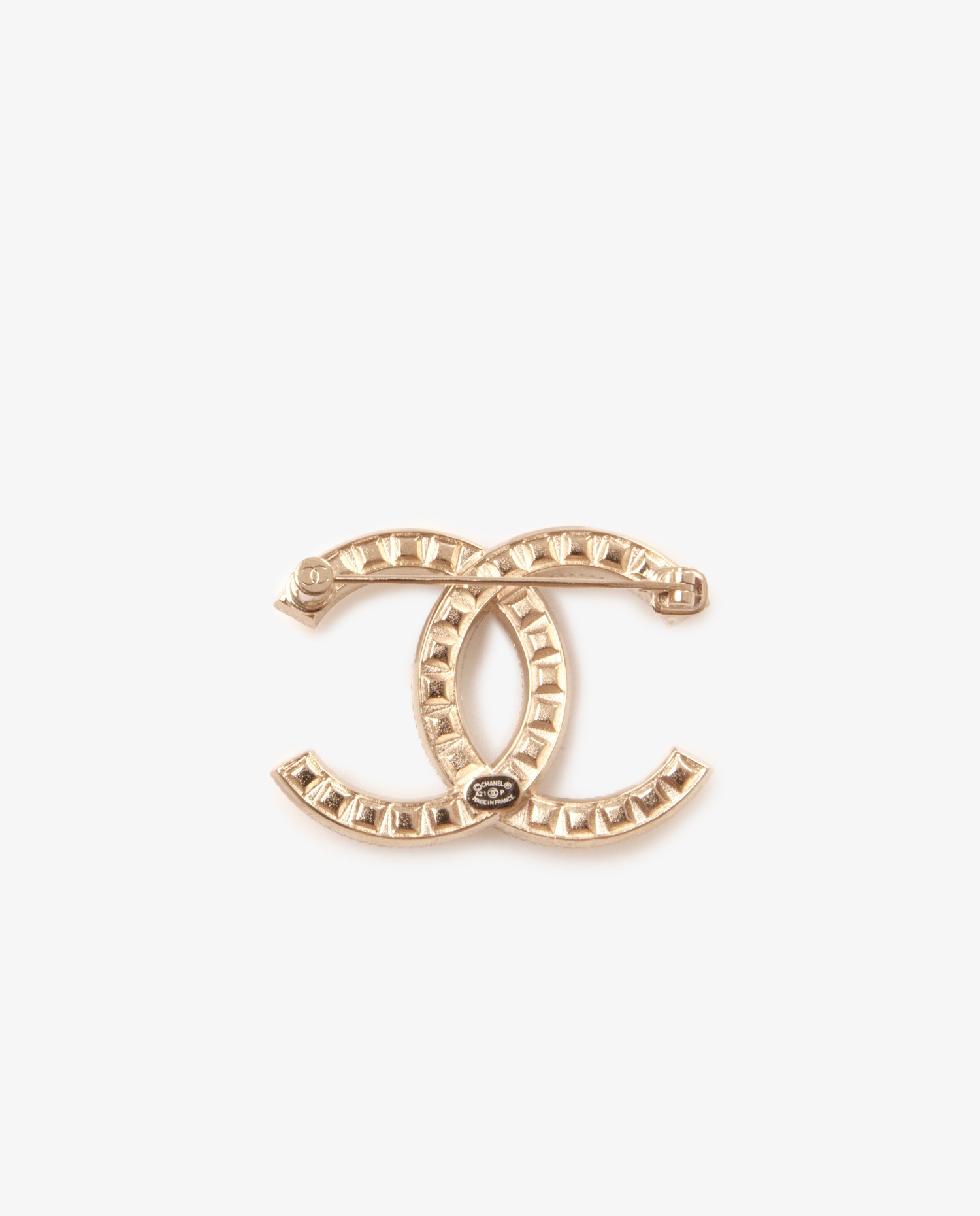 Broche Chanel métal doré et strass. Un accessoire indispensable pour ajouter un élément chic à vos tenues de tous les jours.