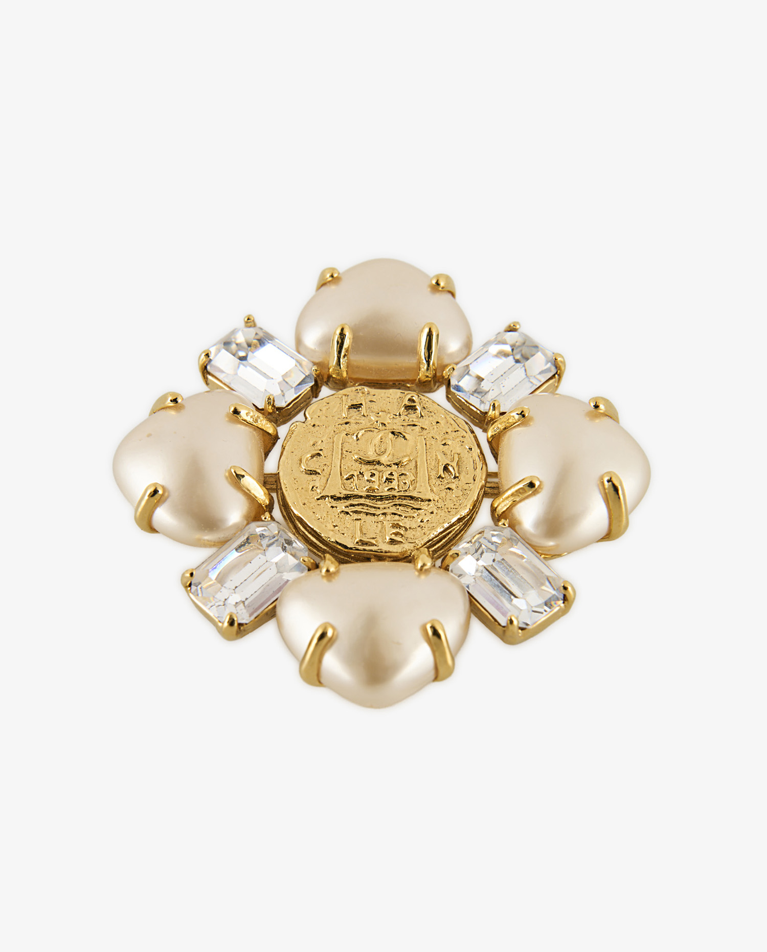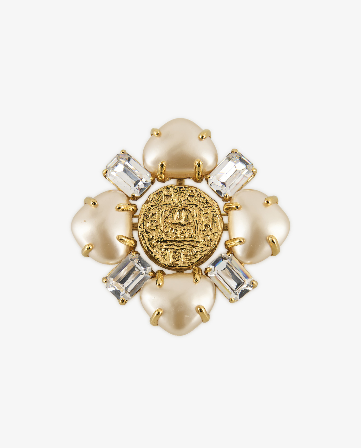La face avant présente un médaillon central doré, légèrement texturé, gravé du double C entrelacé et de la mention Chanel. Autour, des perles nacrées de teinte ivoire, à la surface satinée, sont disposées de manière symétrique. Elles sont alternées avec des strass transparents taillés façon baguette, sertis dans un métal doré brillant. Les griffes apparentes accentuent le relief et renforcent l’esthétique joaillière. Le diamètre global de la broche lui confère une présence notable sur un vêtement.