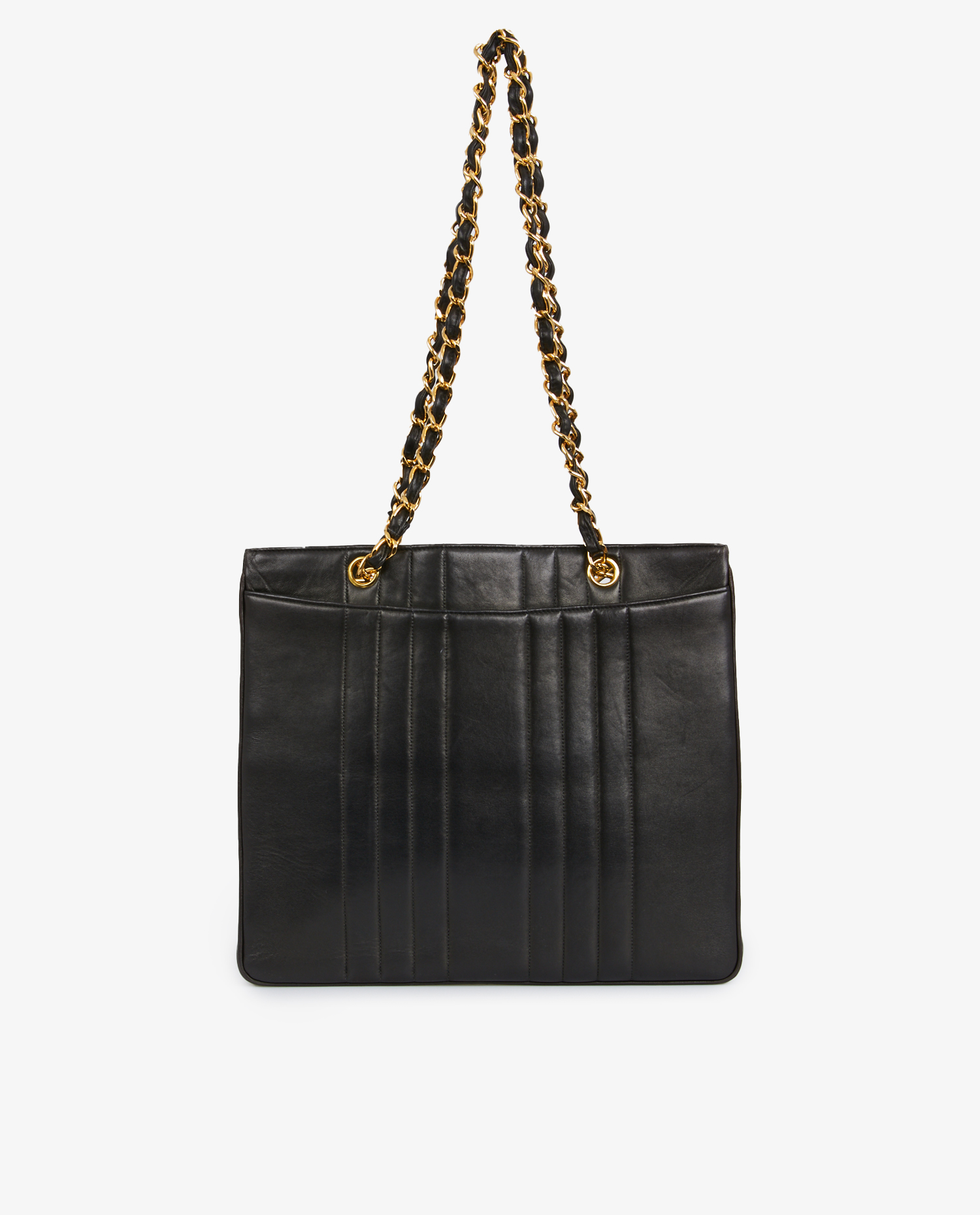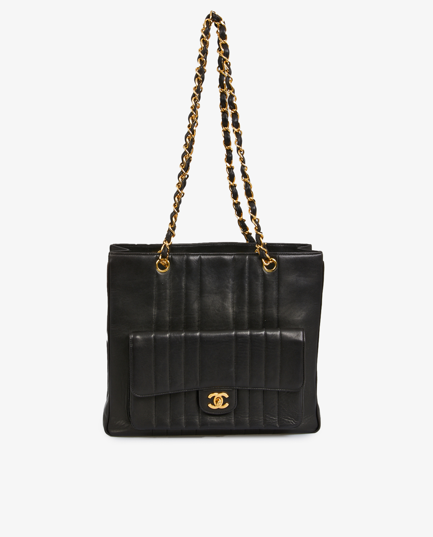 Le cuir d’agneau noir présente une surface lisse, légèrement satinée, caractéristique de la qualité des peaux utilisées par Chanel à cette époque. Le matelassage vertical crée une texture visuelle originale et structure la silhouette sans l’alourdir. Sur le devant, une large poche à rabat reprend ce même motif vertical, ponctuée d’un fermoir CC en métal doré 24k, à fermeture tournante. Les deux chaînes en métal doré entrelacé de cuir noir assurent un porté épaule équilibré et stable. Le fond est plat et renforcé, garantissant une bonne tenue, même en cas de charge. Les tranches sont lisses, les coutures parfaitement exécutées, témoignant du savoir-faire artisanal de la maison.