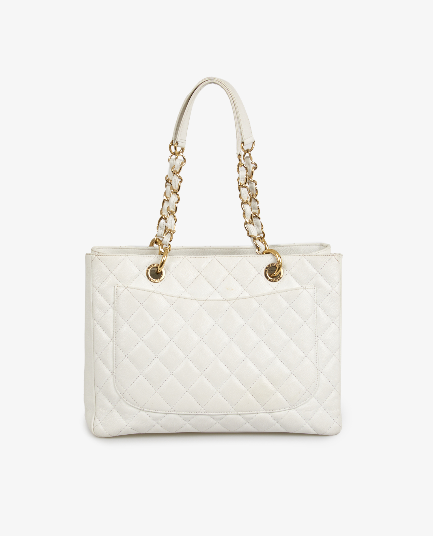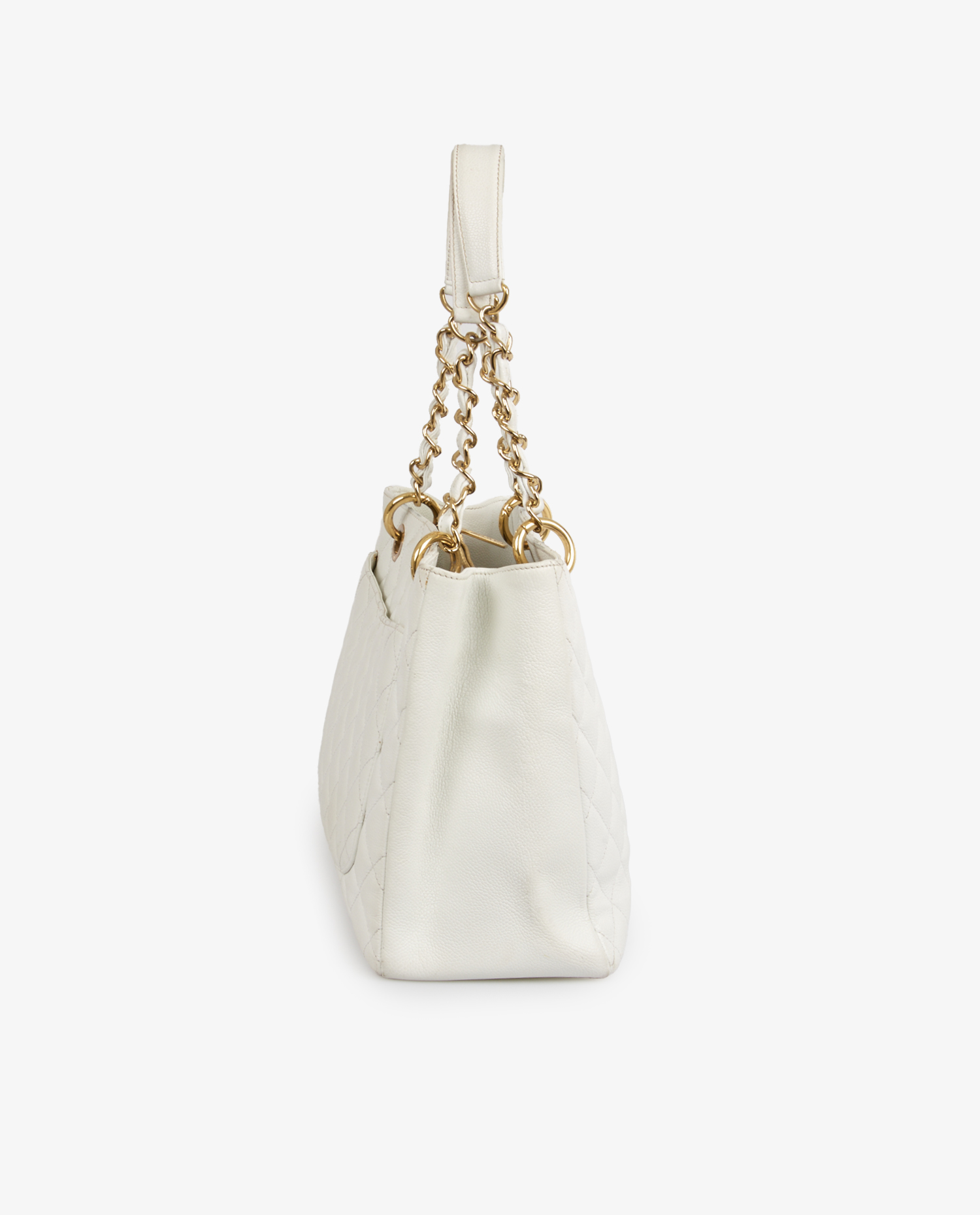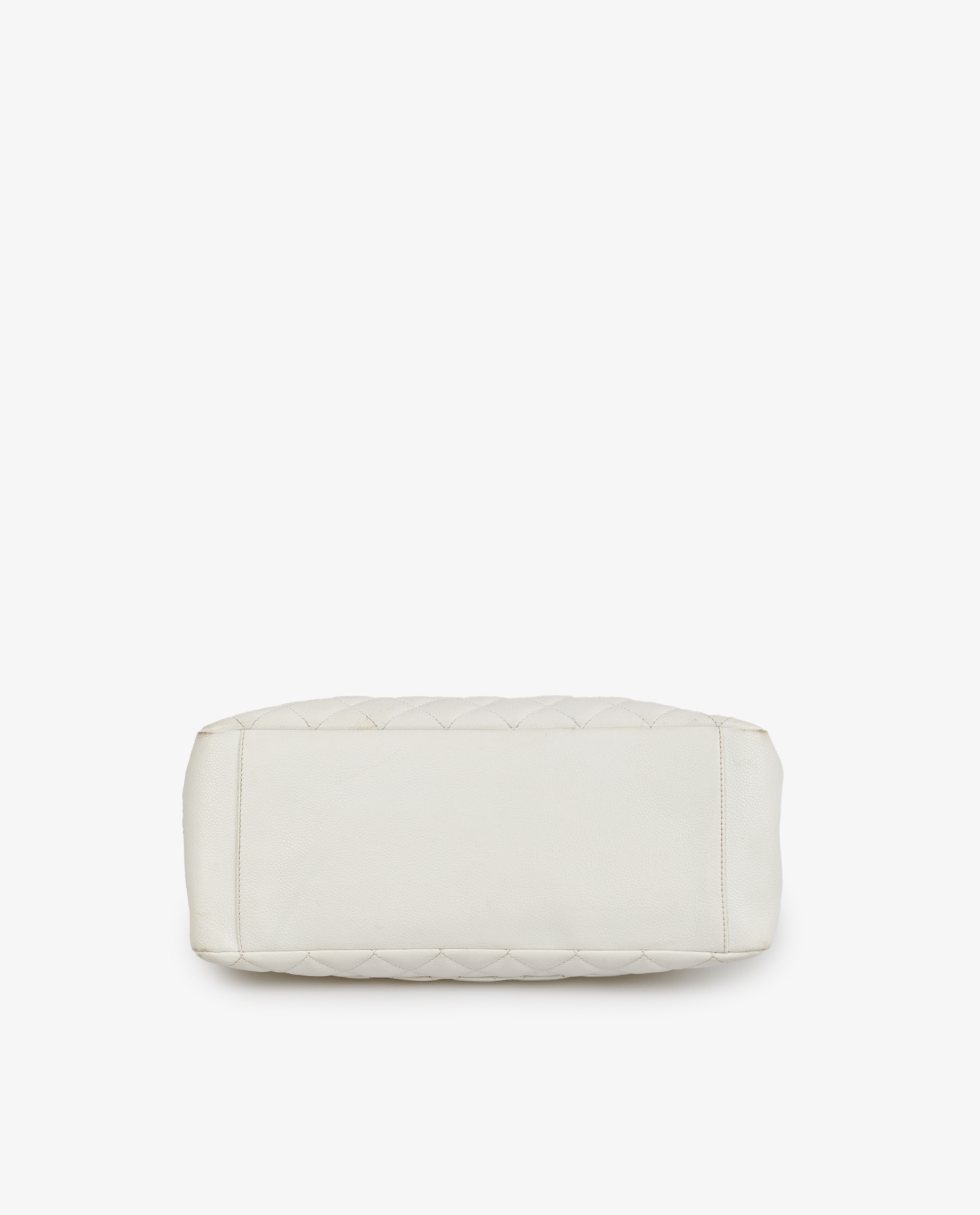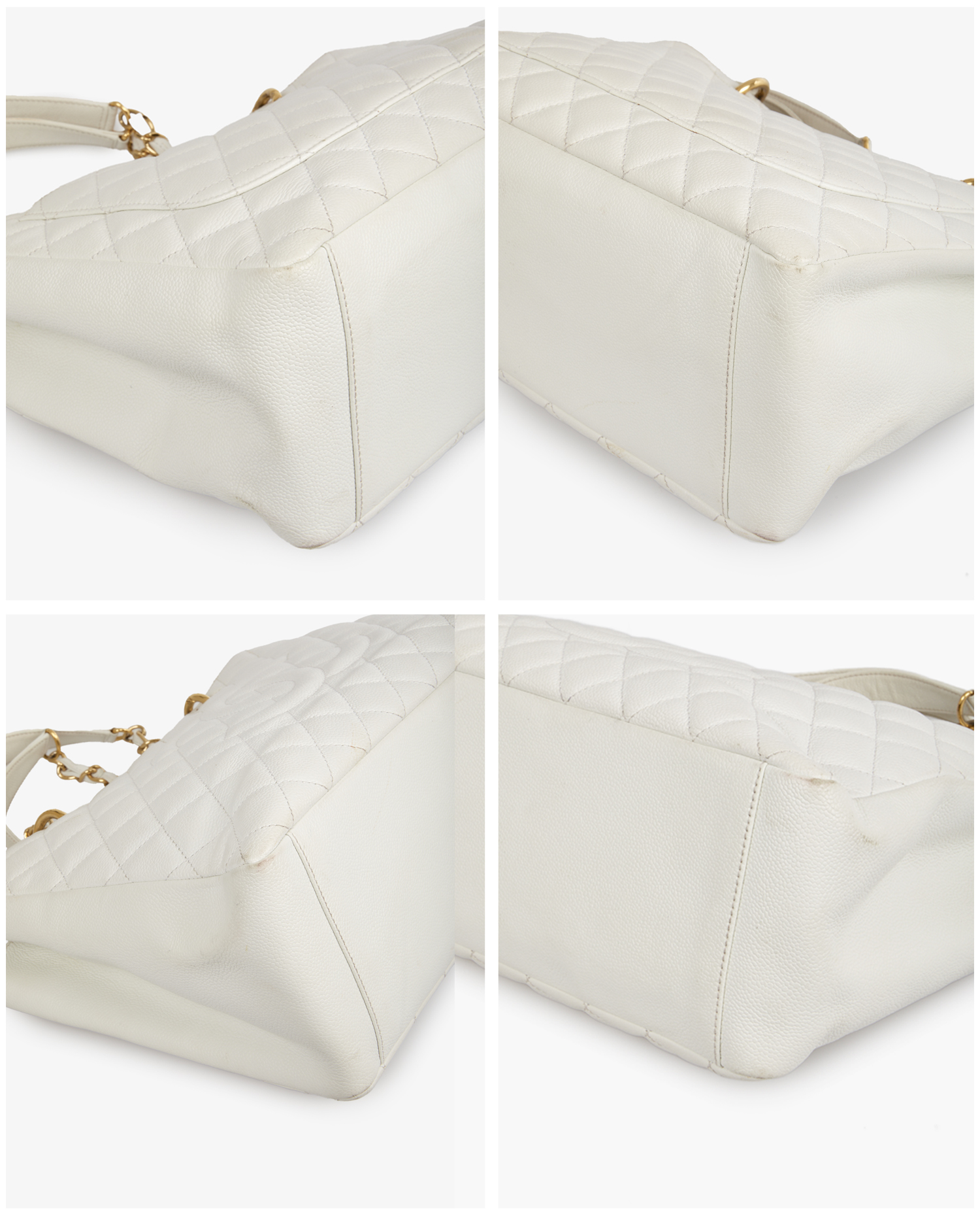 Sac cabas Chanel en cuir grainé blanc. Bijouterie dorée. Porté épaule. Deux grands espaces de rangement séparé par une poche zippée. L’intérieur est en tissu satiné gris. En très bon état.