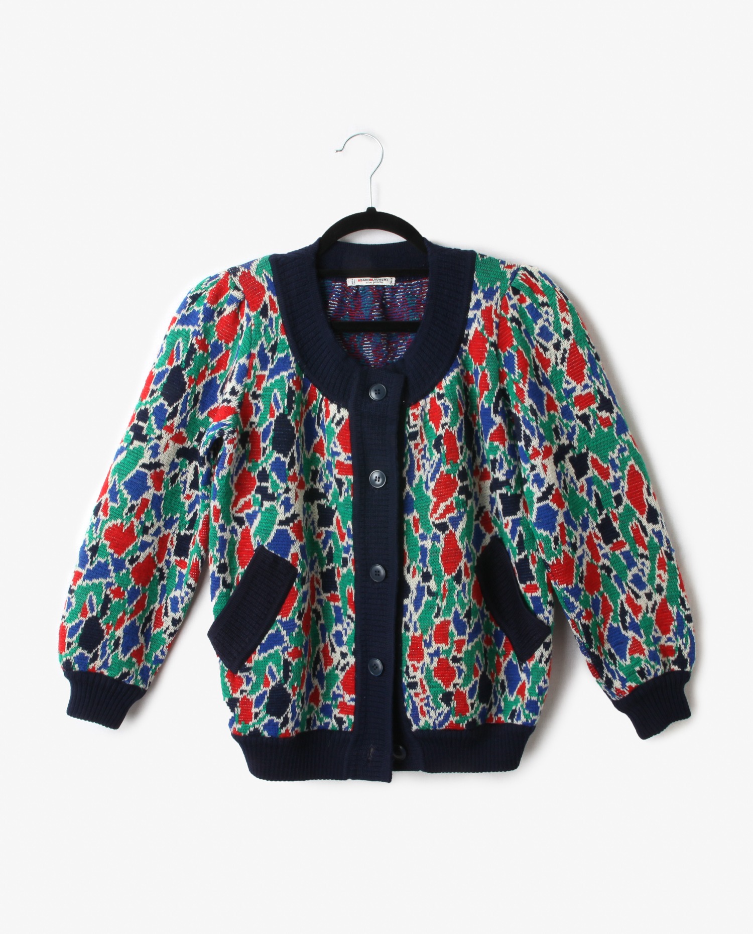 Cardigan en maille multicolore Yves Saint Laurent Rive Gauche. Col rond. Poches raglan.