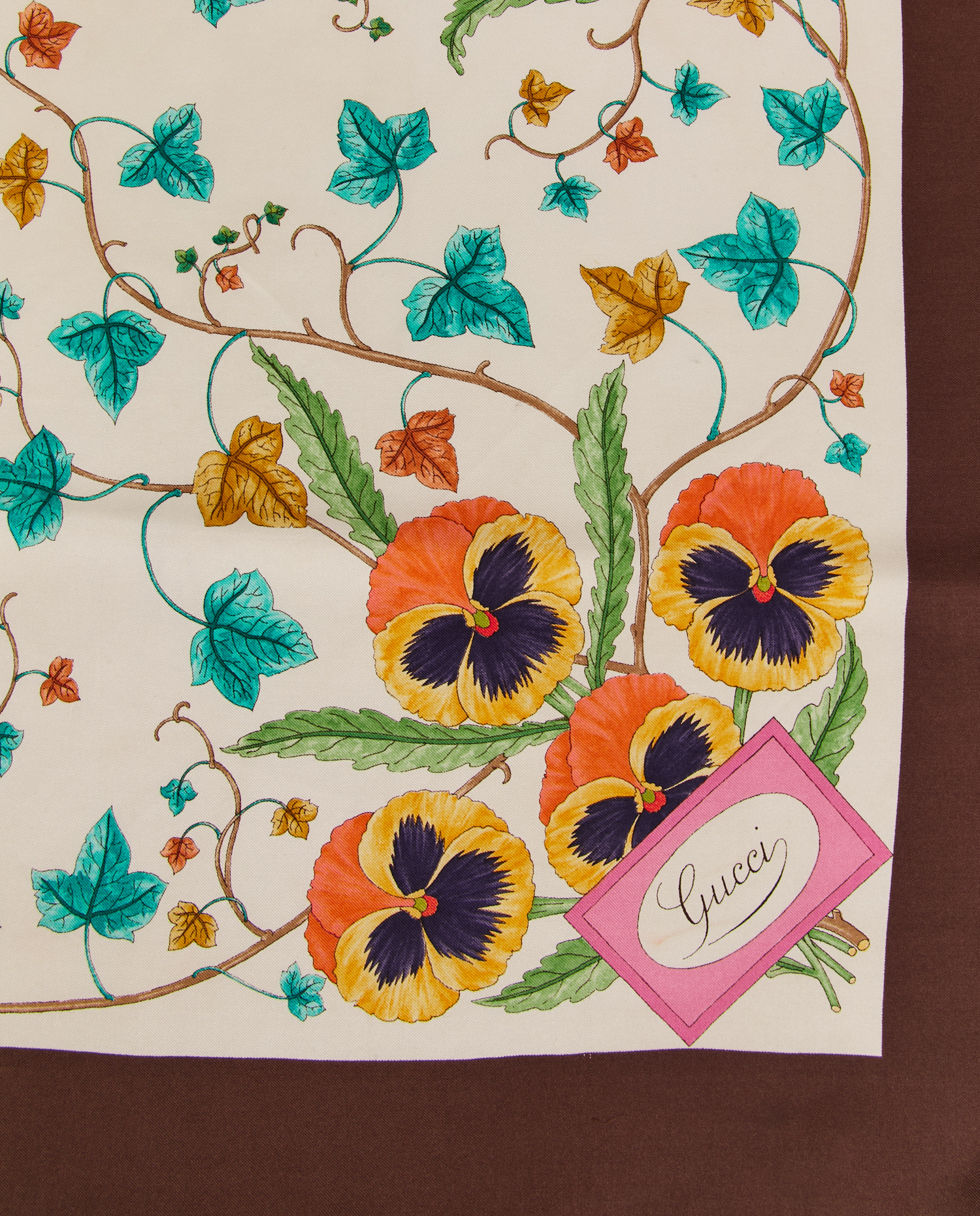 Le carré présente un fond ivoire orné d’une profusion de fleurs et de feuillages disposés en composition symétrique. Les pensées de différentes couleurs se répartissent aux quatre coins et sur les côtés, reliées par des volutes de tiges et de feuilles. La bordure marron profond apporte un contraste qui met en valeur l’éclat des motifs colorés. Un cartouche rose avec l’inscription Gucci ainsi que la signature de V. Accornero figurent dans deux angles du carré.