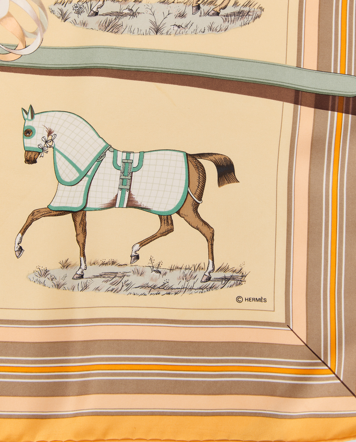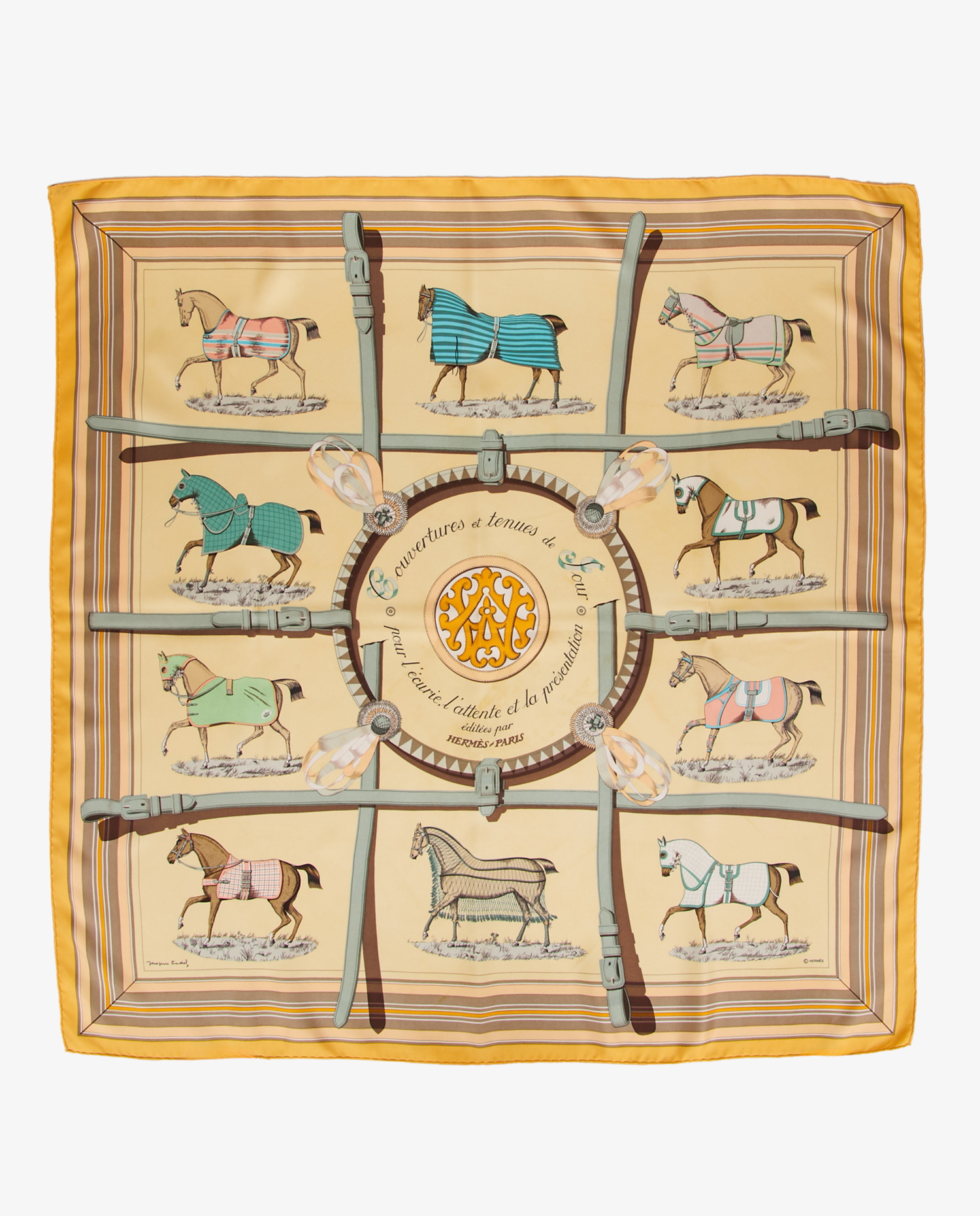 Le carré présente une composition symétrique où neuf chevaux sont représentés portant chacun une couverture distincte, entourés de lanières, brides et décorations équines. La bordure jaune doré encadre l’ensemble et met en valeur les motifs aux couleurs sobres et élégantes. La signature Hermès Paris figure intégrée dans le dessin aux côtés de celle de Jacques Eudel.
