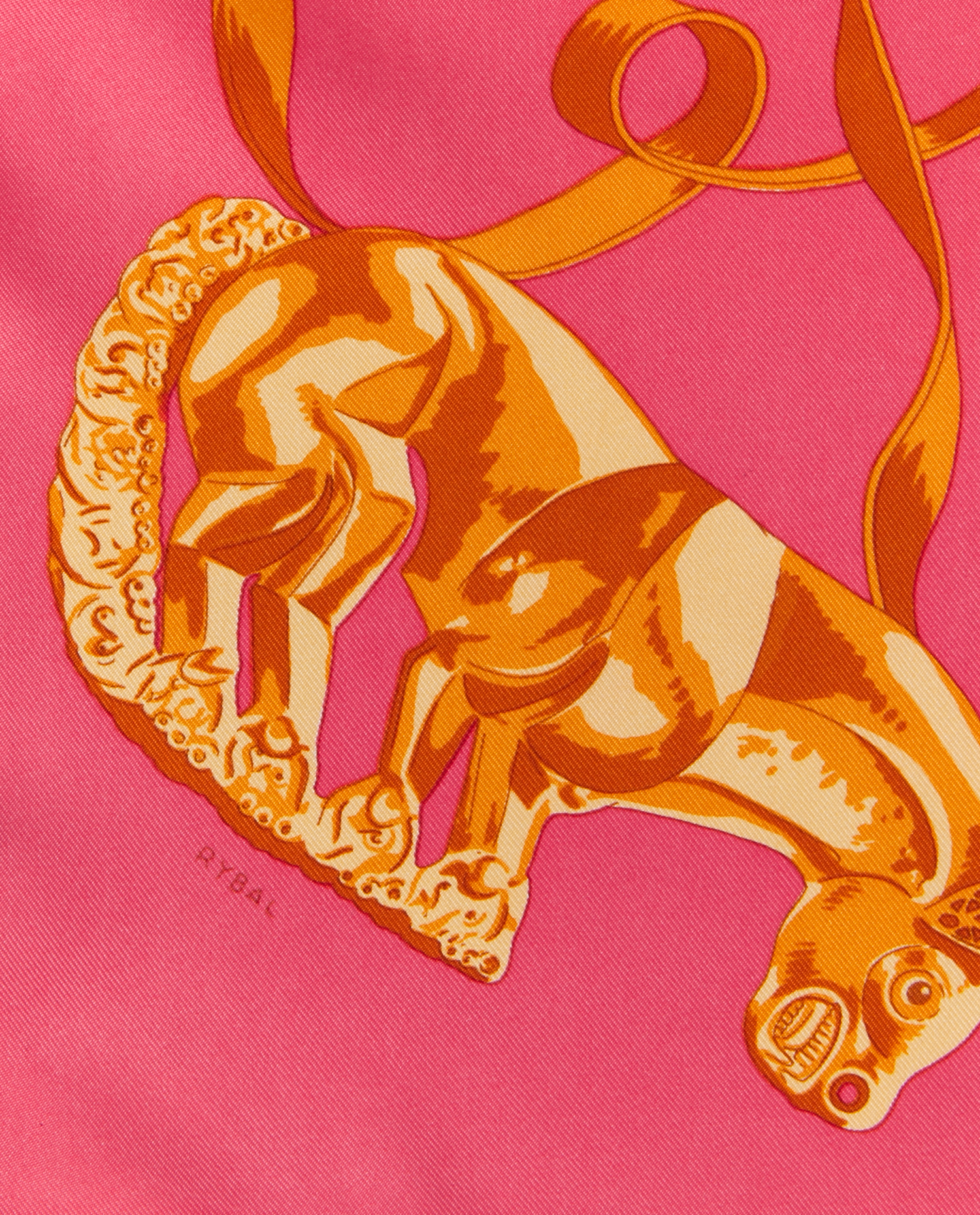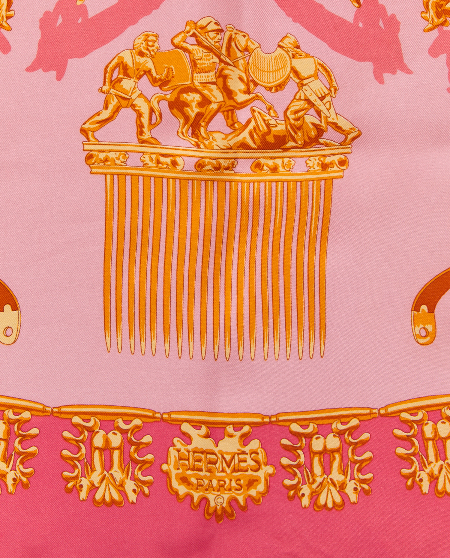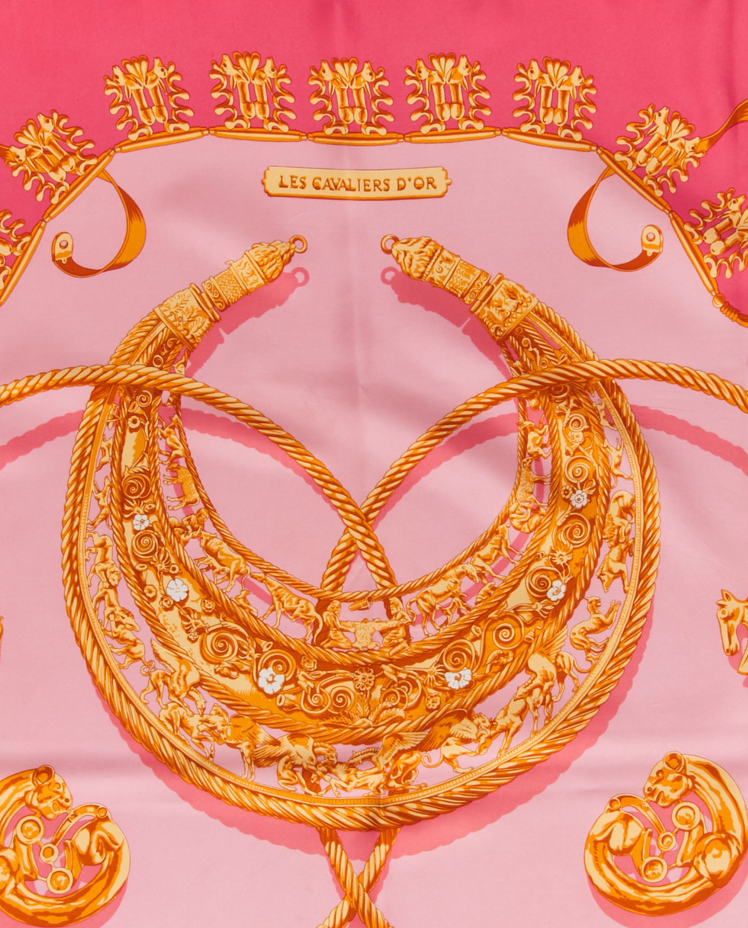 Le carré présente un fond rose pâle rehaussé d’une bordure rose vif, mettant en valeur un décor de bijoux d’inspiration scythe. Les motifs sont organisés de façon symétrique : pectoraux richement ornés, fibules aux formes animales, mors de cheval, peignes sculptés et éléments décoratifs stylisés. Les détails sont soulignés par des teintes dorées et orangées qui contrastent élégamment avec le fond. La signature Hermès Paris est intégrée discrètement au bas du dessin, et le titre « Les Cavaliers d’Or » apparaît en haut de la composition.