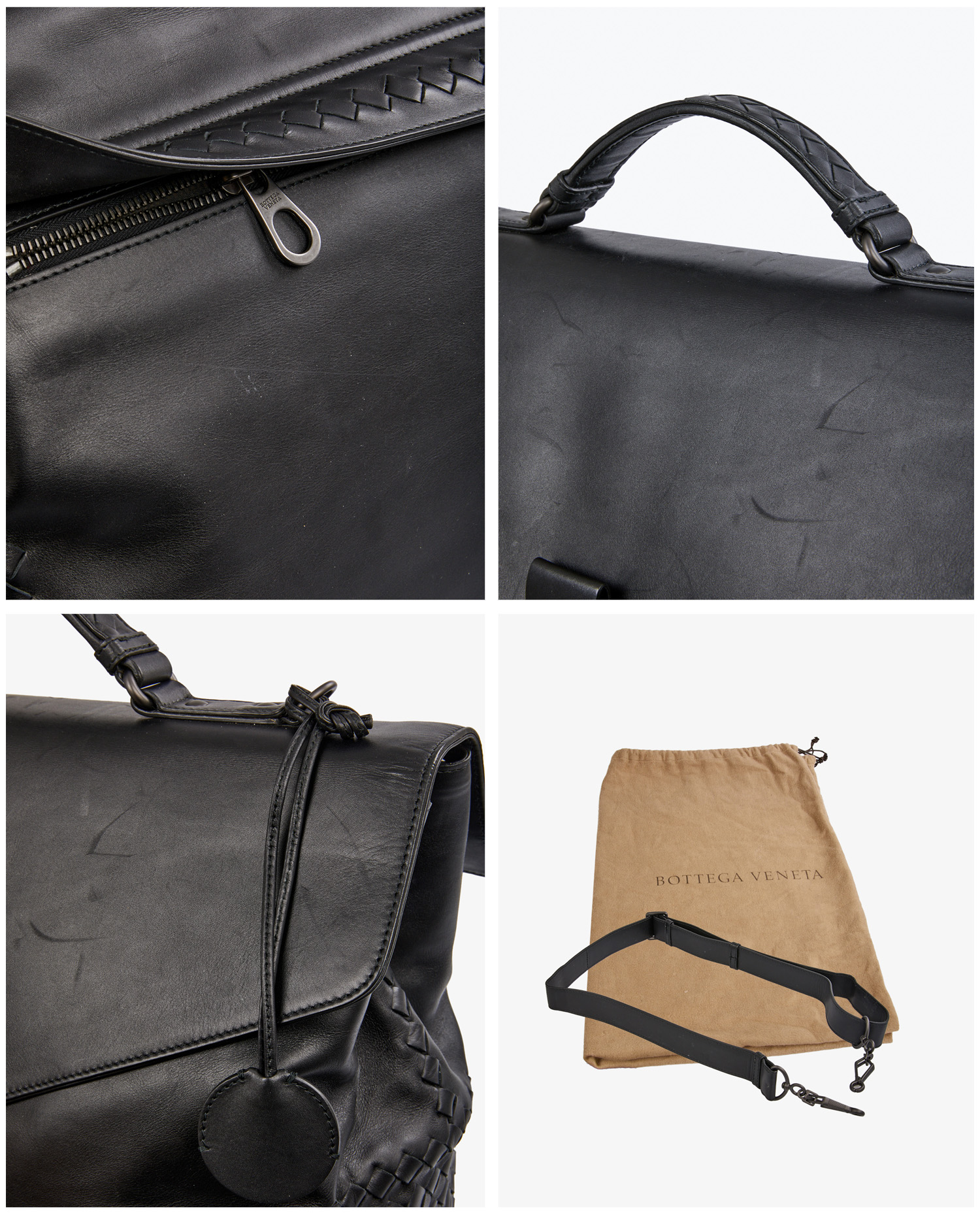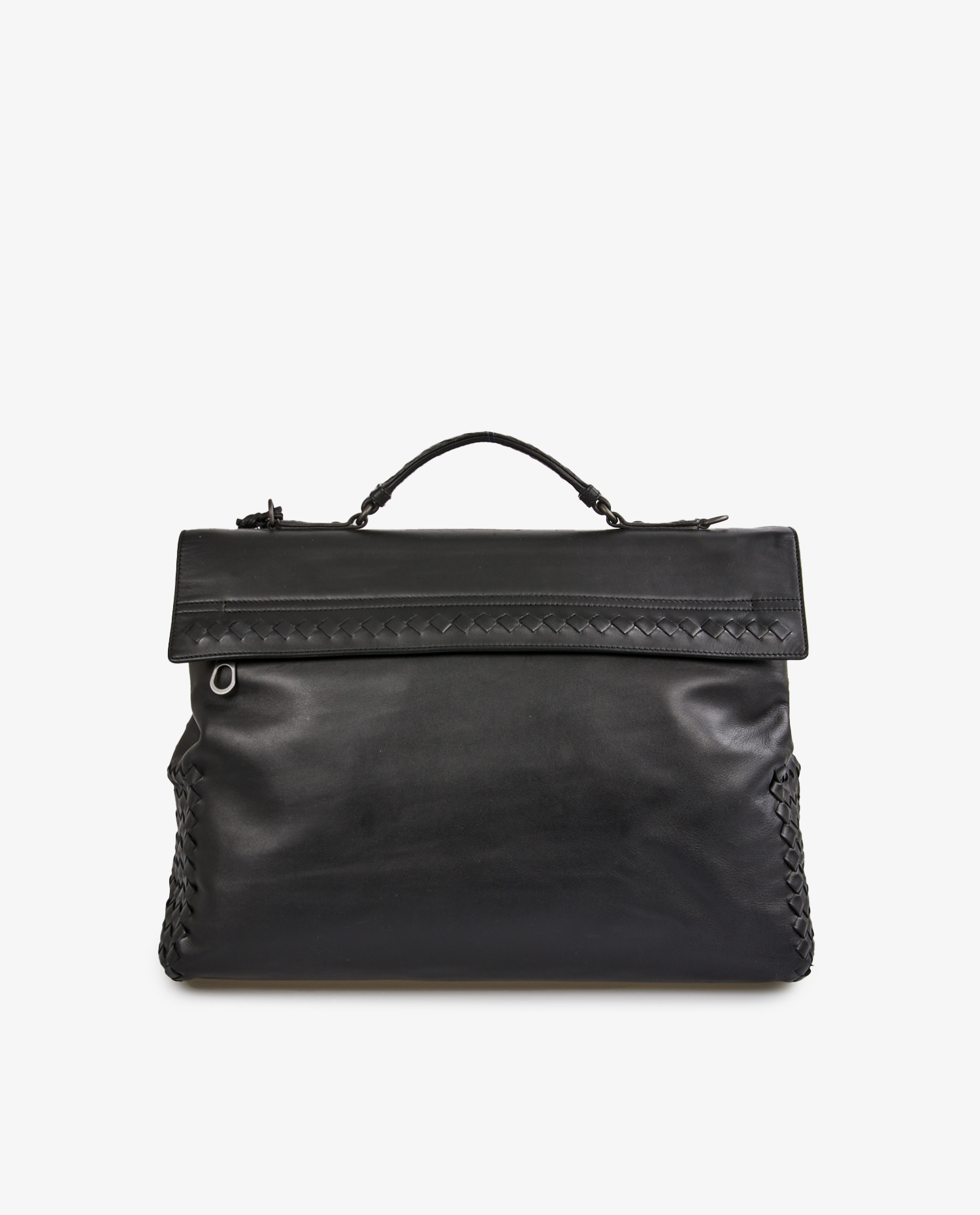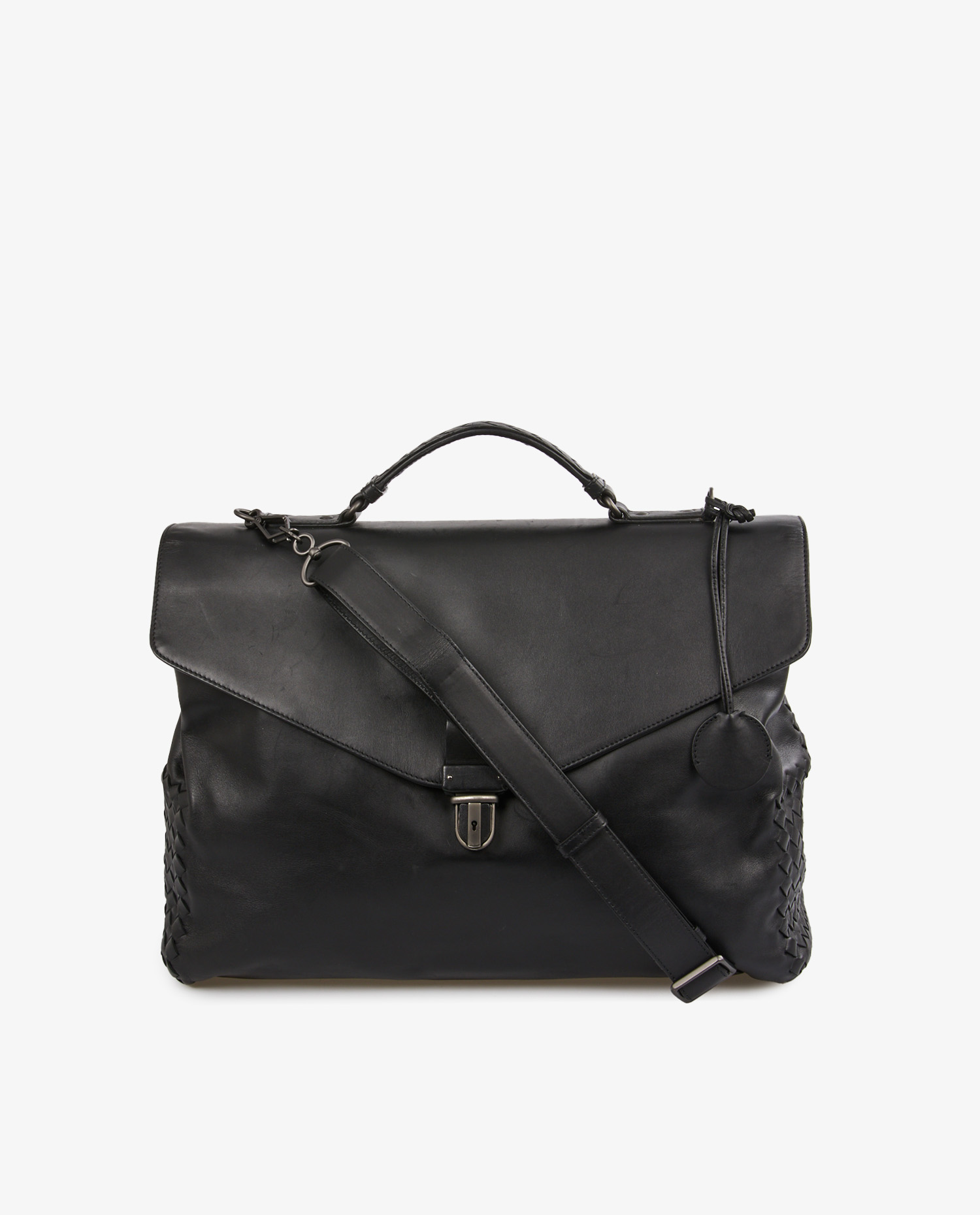 Cartable Bottega Veneta en cuir lisse noir et finitions sur le côté en cuir tressé. Porté à la main ou à l’épaule à l’aide d’une bandoulière amovible. Voir photos. En très état mais quelques griffures d’usure d’usage visible à l’avant. Livré dans son dustbag d’origine.