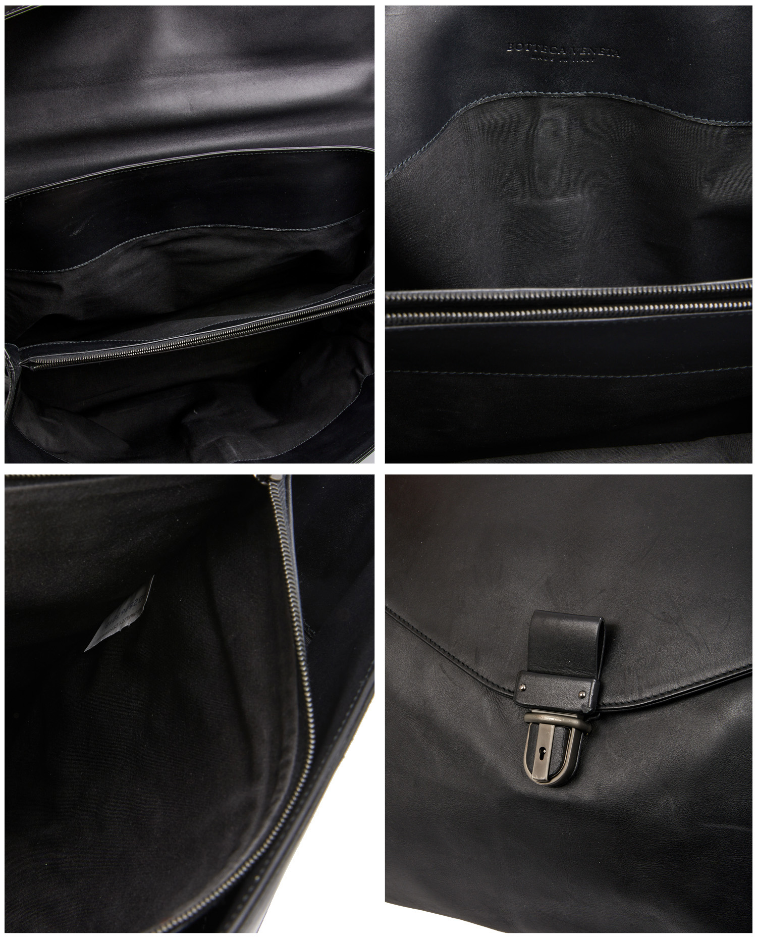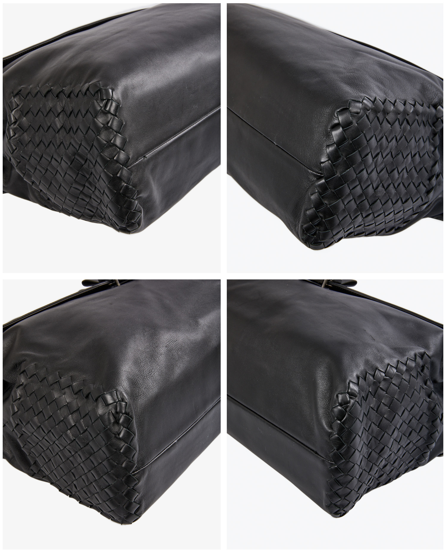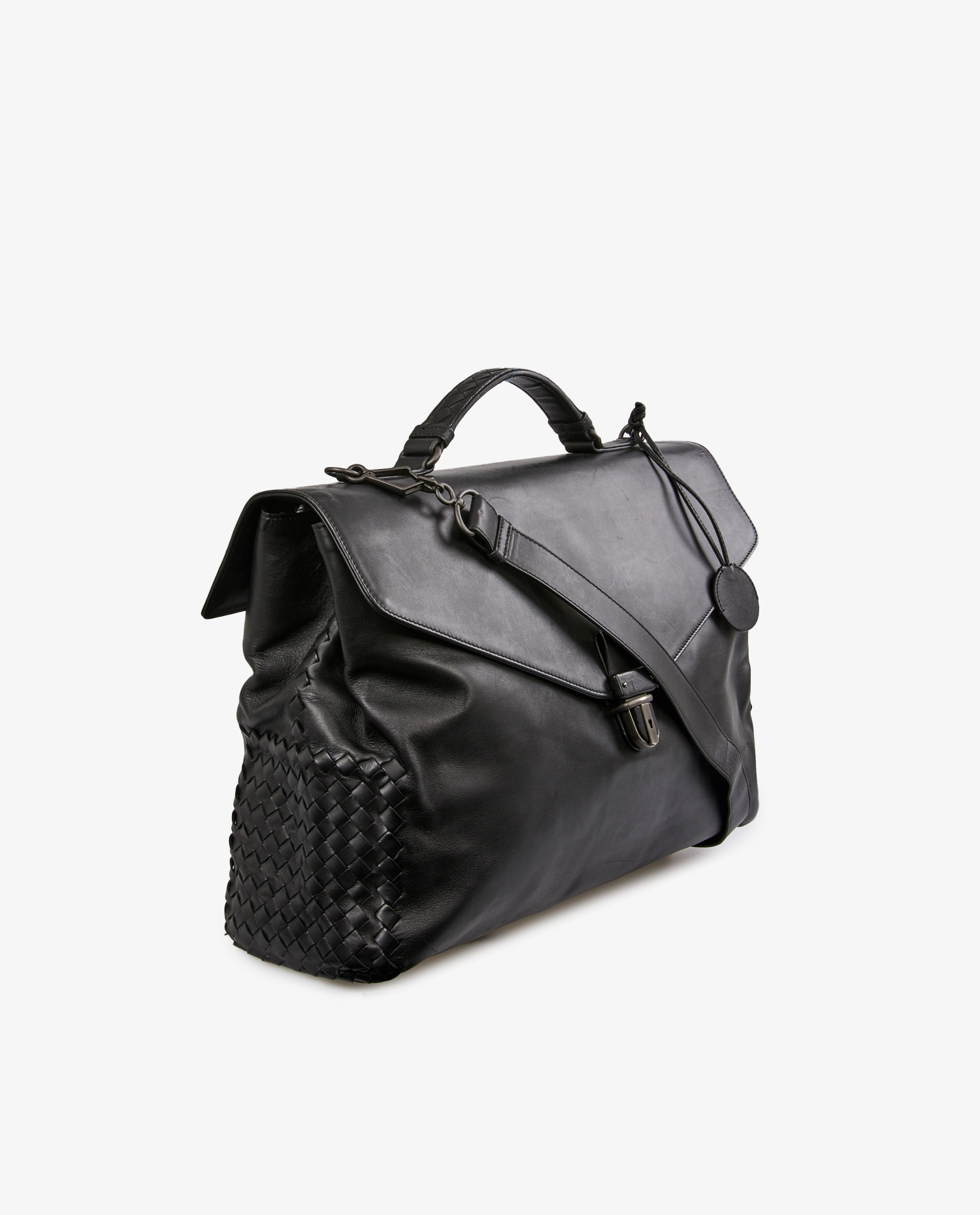 Cartable Bottega Veneta en cuir lisse noir et finitions sur le côté en cuir tressé. Porté à la main ou à l’épaule à l’aide d’une bandoulière amovible. Voir photos. En très état mais quelques griffures d’usure d’usage visible à l’avant. Livré dans son dustbag d’origine.