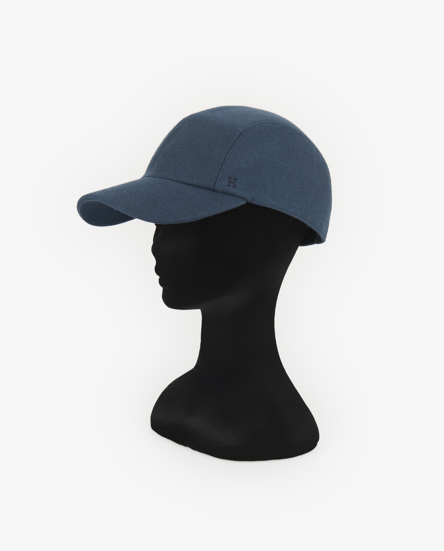 Réalisée en cachemire bleu nuit, la matière présente un toucher doux, légèrement duveteux, typique des textiles nobles. La coupe est structurée par des coutures ton sur ton bien exécutées, conférant à la casquette un maintien fluide sans rigidité excessive. Le « H » brodé près de la visière renforce l’identité Hermès tout en restant discret. Deux boutons pression argentés à l’arrière permettent un ajustement personnalisé. L’ouverture arrière reste large, ajoutant de l’aisance visuelle à l’ensemble. La visière conserve une forme souple et protectrice, adaptée au port quotidien.
