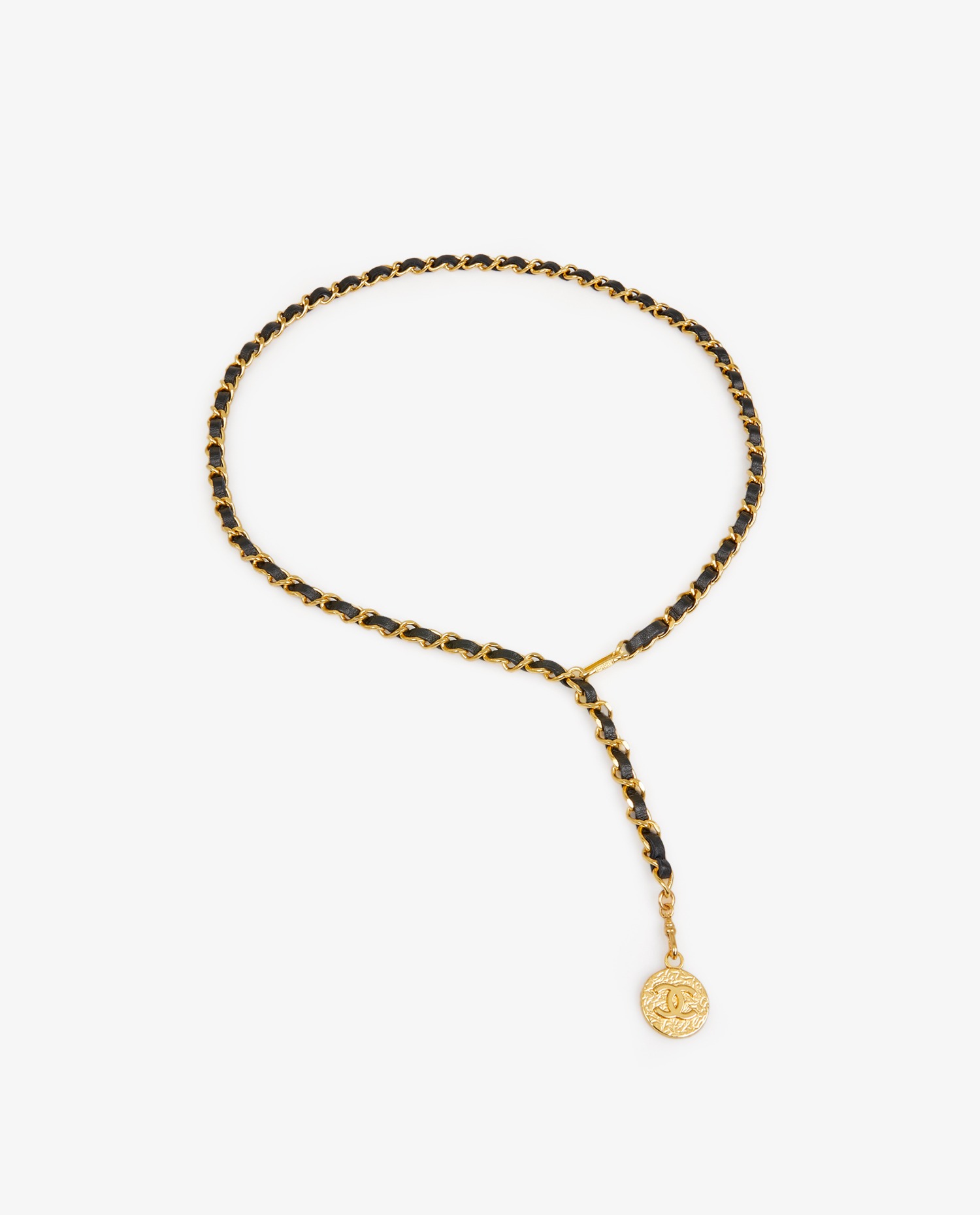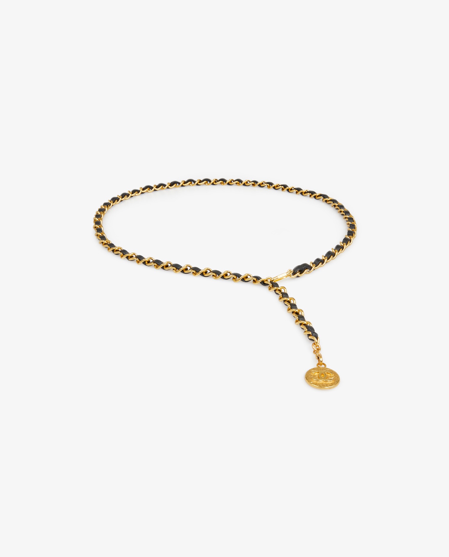 Ceinture vintage Chanel chaine dorée et cuir entremêlé noir. En très bon état.