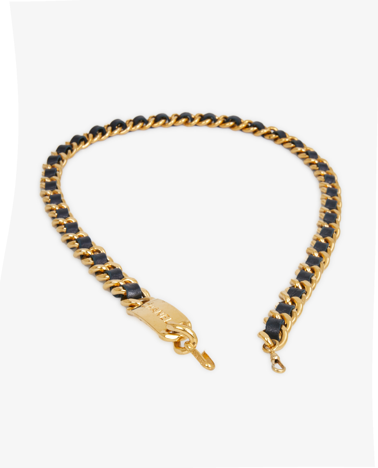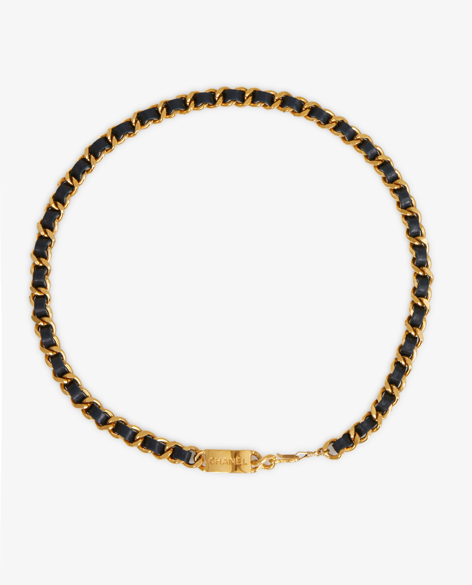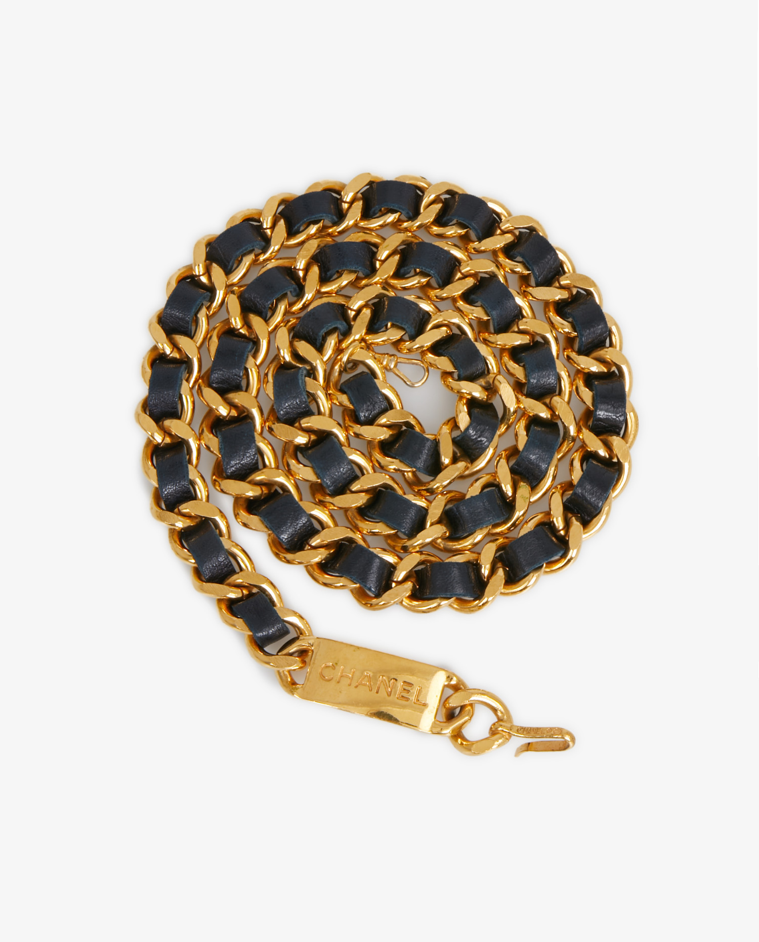 Ceinture Chanel vintage chaine dorée et cuir d’agneau bleu marine. En très bon état.