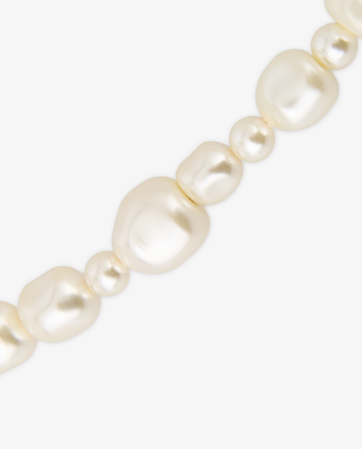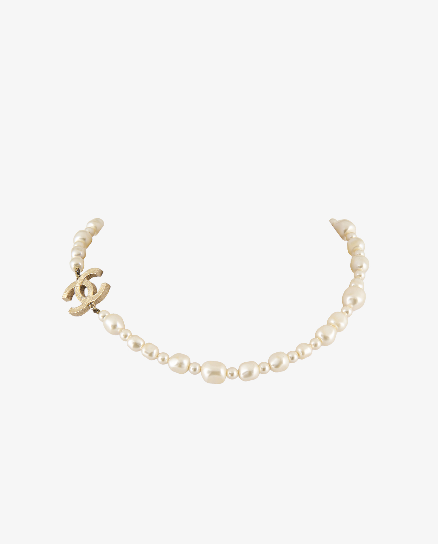 Le collier se compose d’un enfilage de perles synthétiques crème à effet nacré, volontairement irrégulières pour rappeler les formes organiques des perles naturelles. Le logo CC est réalisé en métal doré à effet gravé, conférant un aspect texturé et artisanal. Ce motif est intégré latéralement, en rupture avec la symétrie traditionnelle des colliers à pendentif central. Le fermoir mousqueton doré est relié à une chaîne de réglage ornée d’un second logo CC suspendu en breloque.